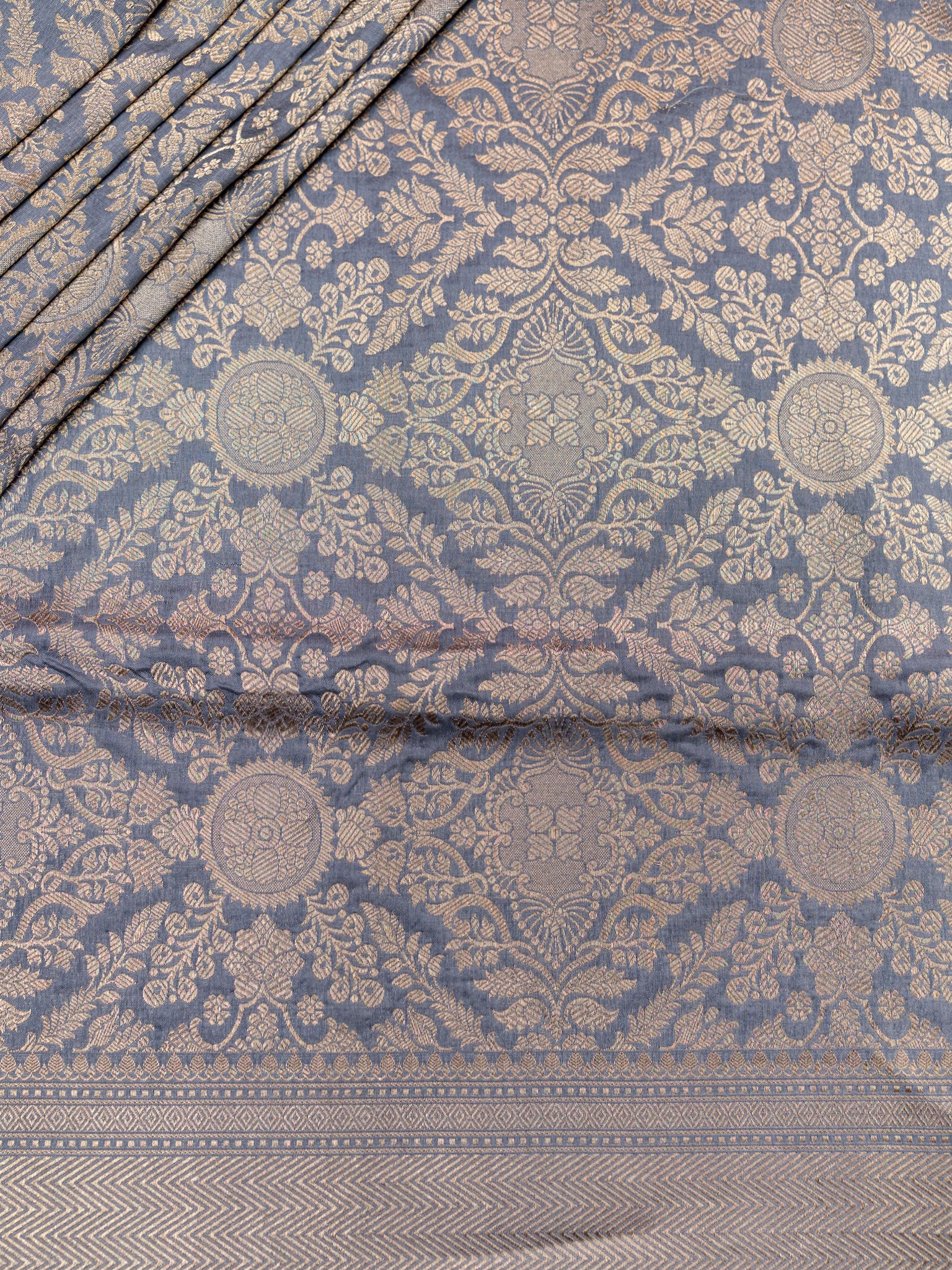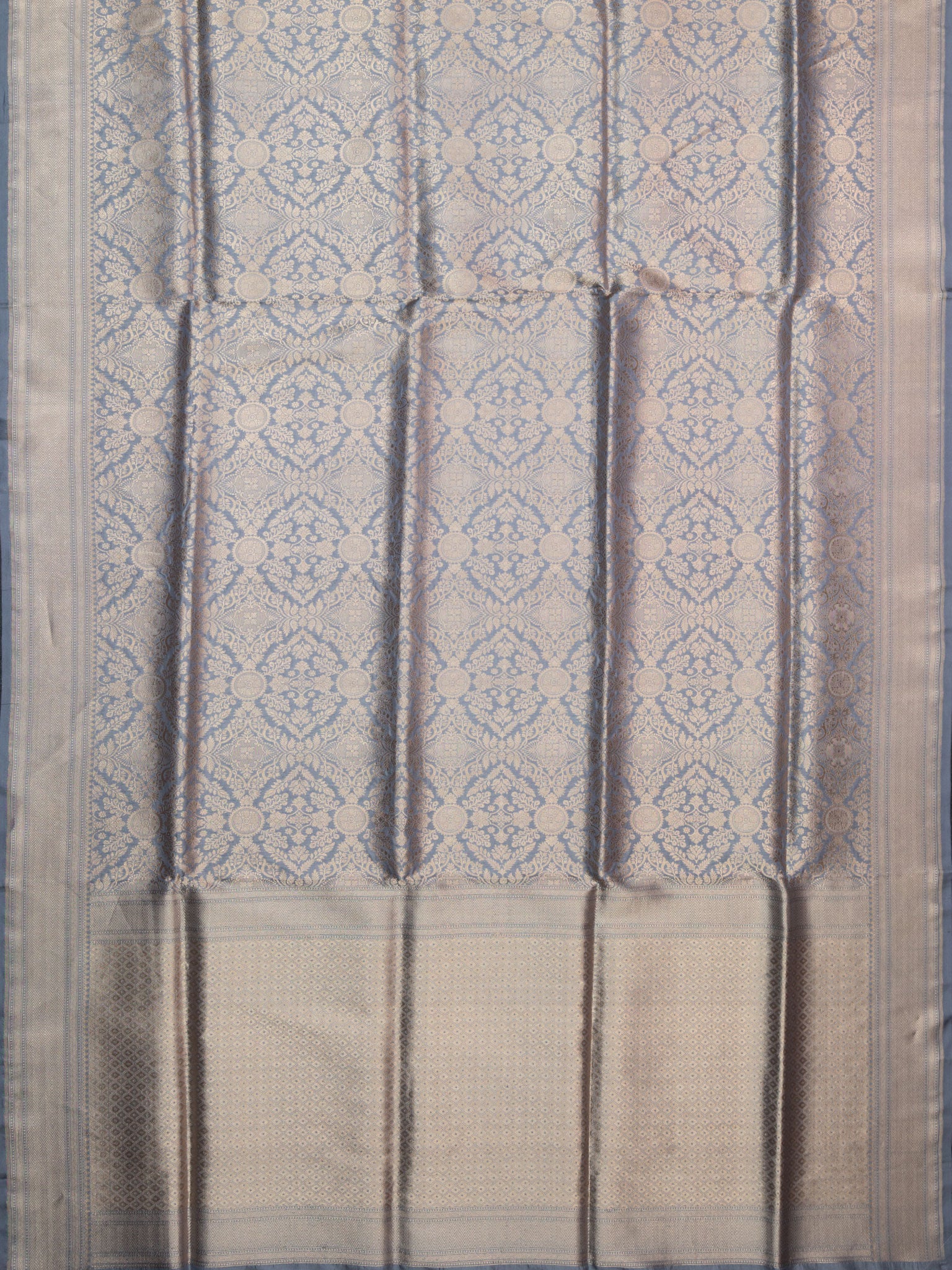 Elegant Ash Banarasi Rangkat saree with intricate Gold Zari and Self border. Unstitched 5.5 meters of premium silk, perfect for weddings, festive occasions, and traditional celebrations.