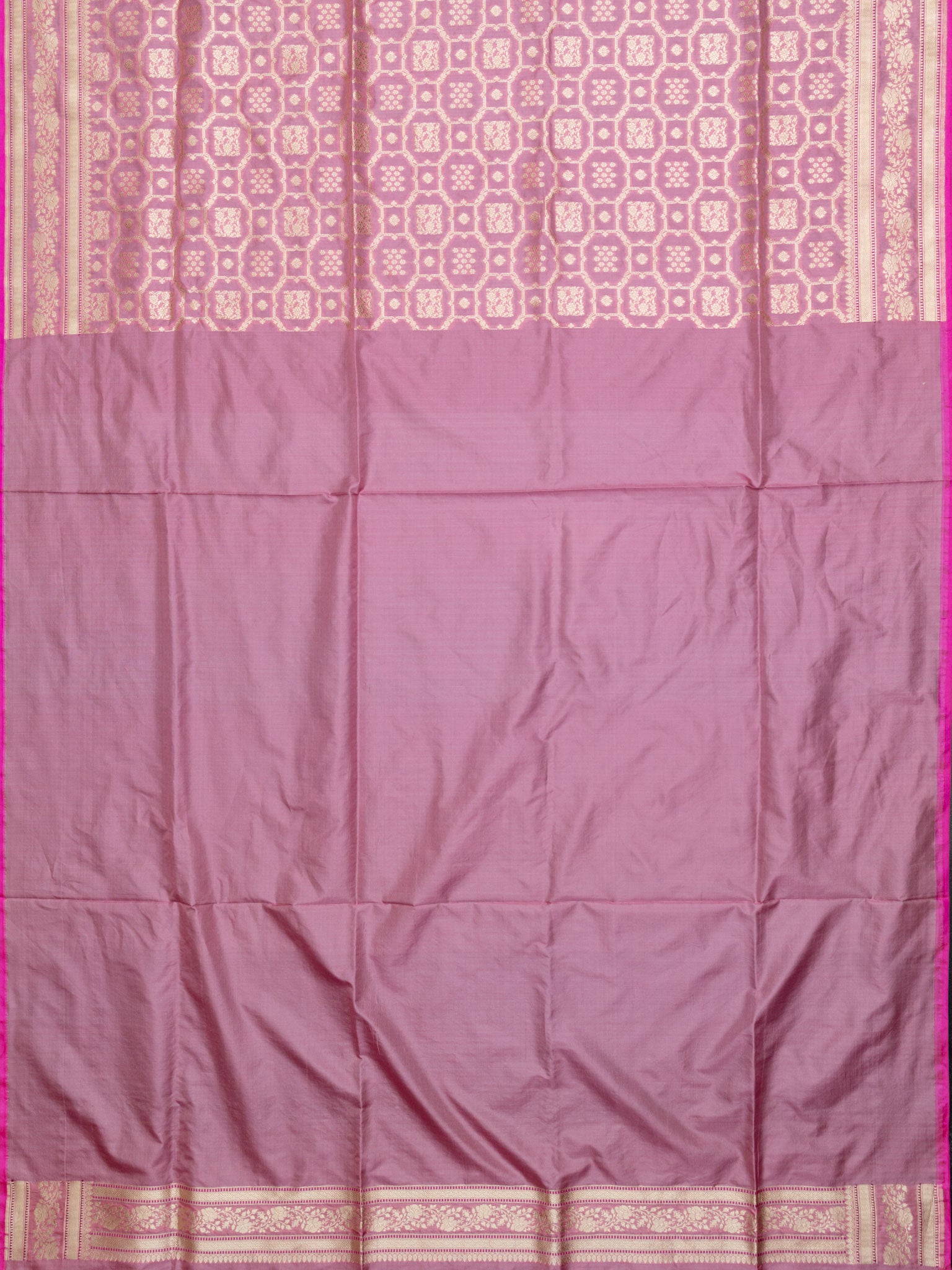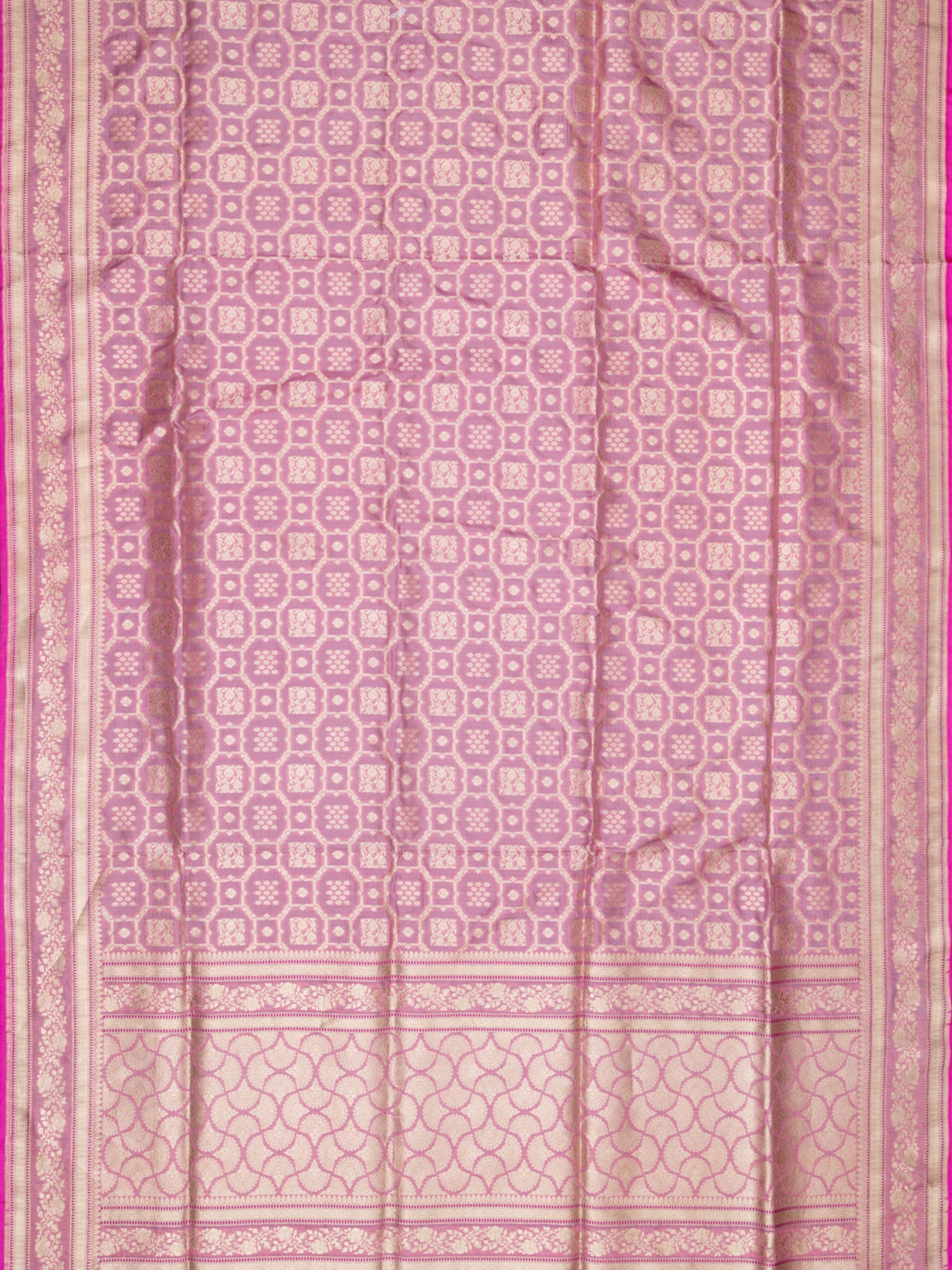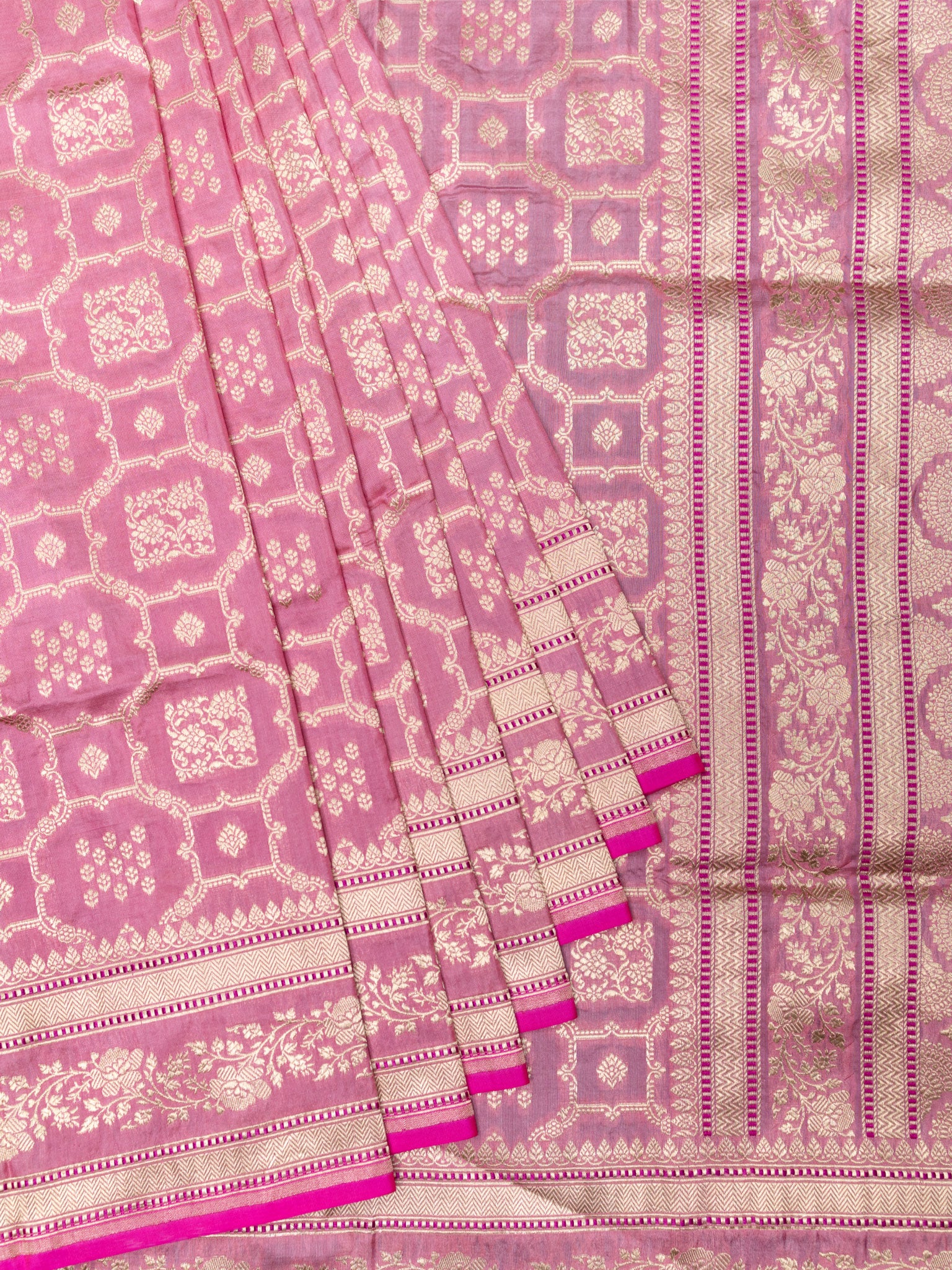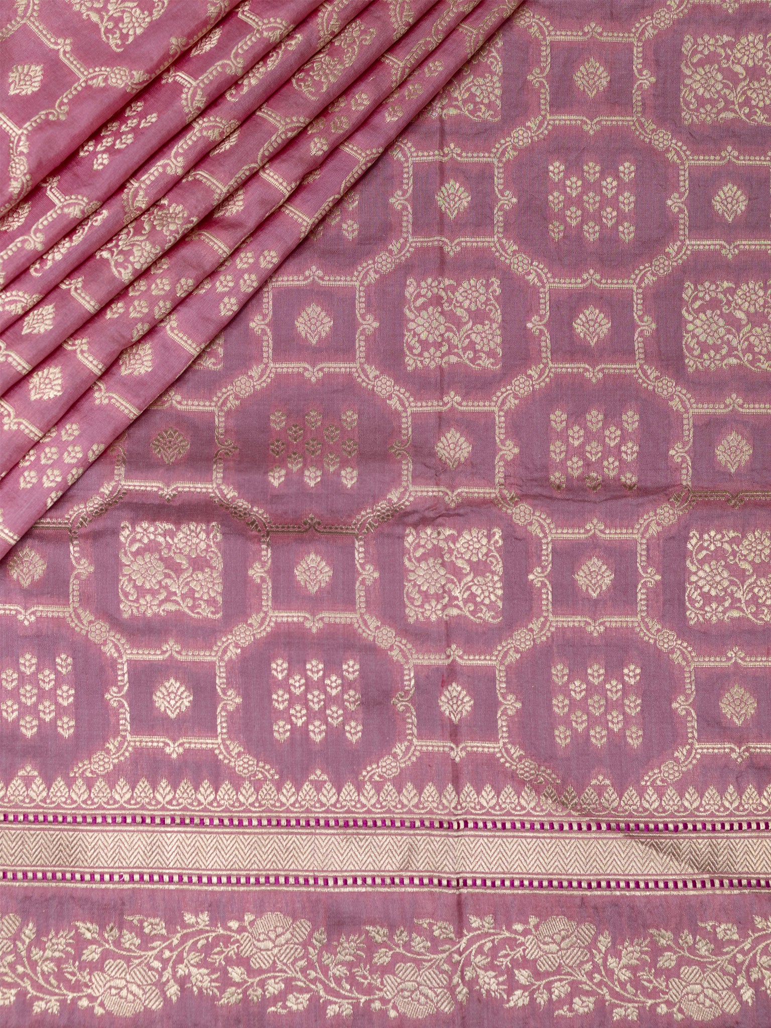 Pink Banarasi Jaal saree with Gold Zari and Self border. Unstitched, premium quality silk ideal for festive occasions, weddings, and traditional events.