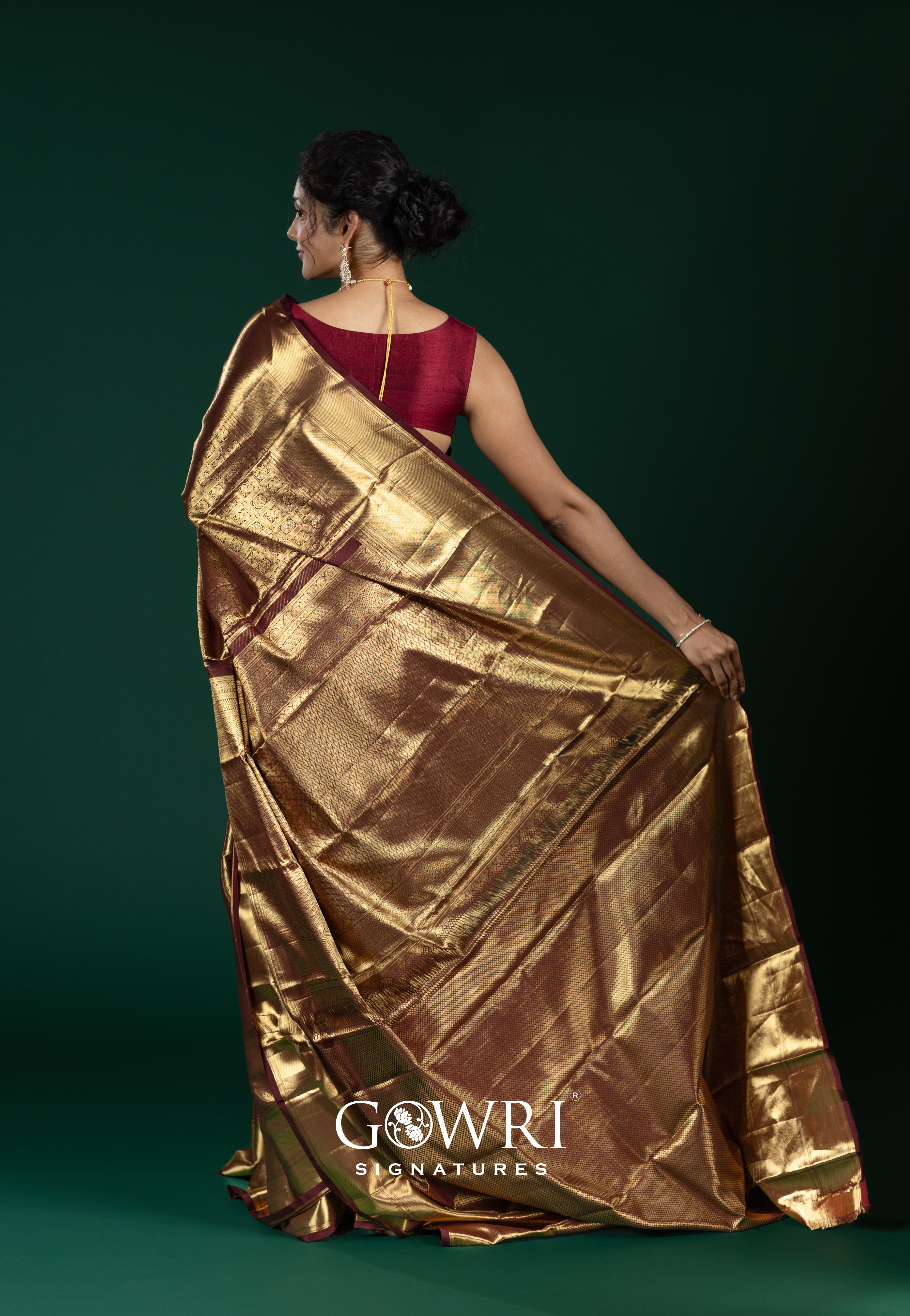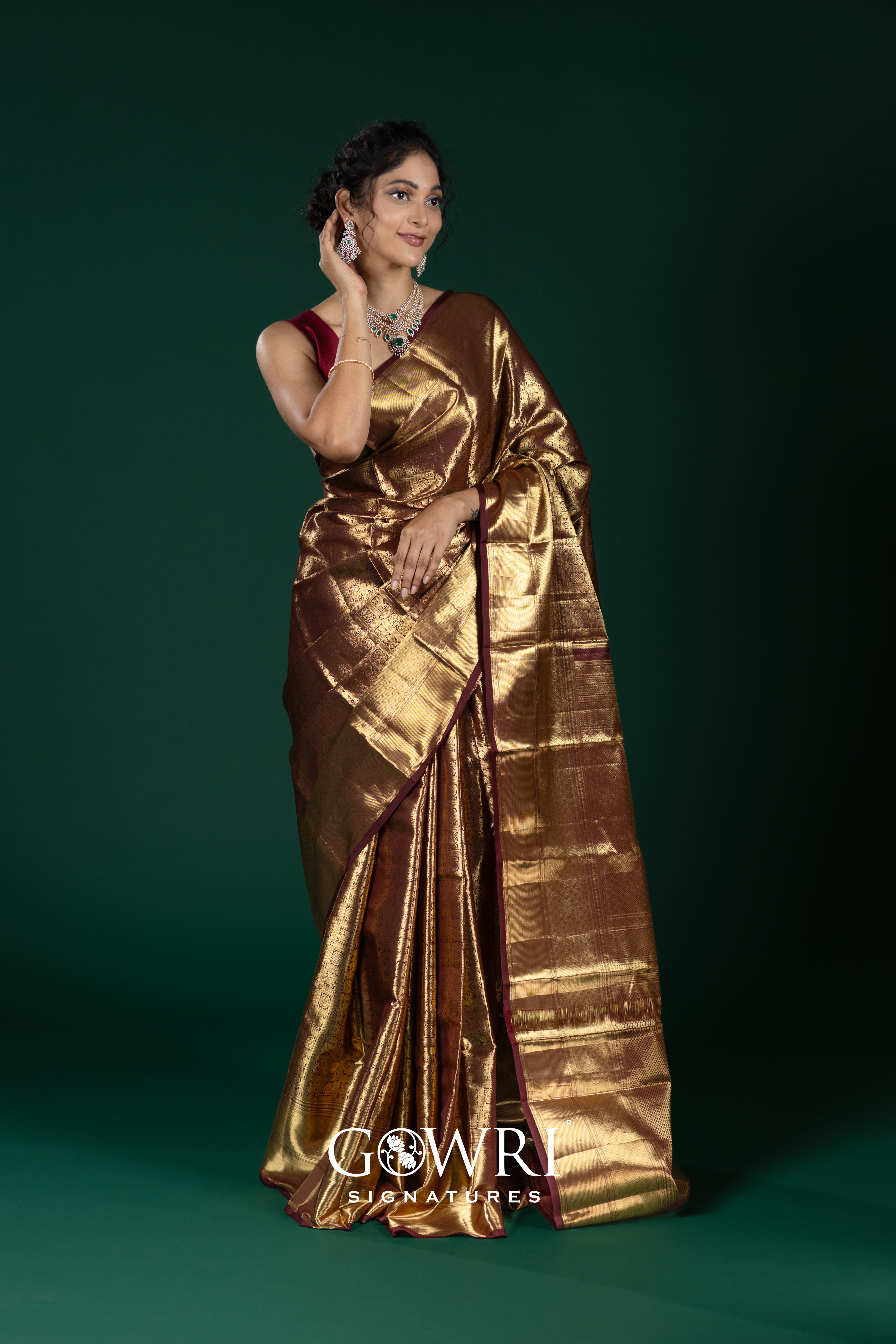 Elevate your ethnic style with this elegant Brown Kanchi Pattu Saree crafted with rich gold zari weaving. Perfect for weddings, festivals, and grand occasions. Comes with a matching self blouse and pallu.