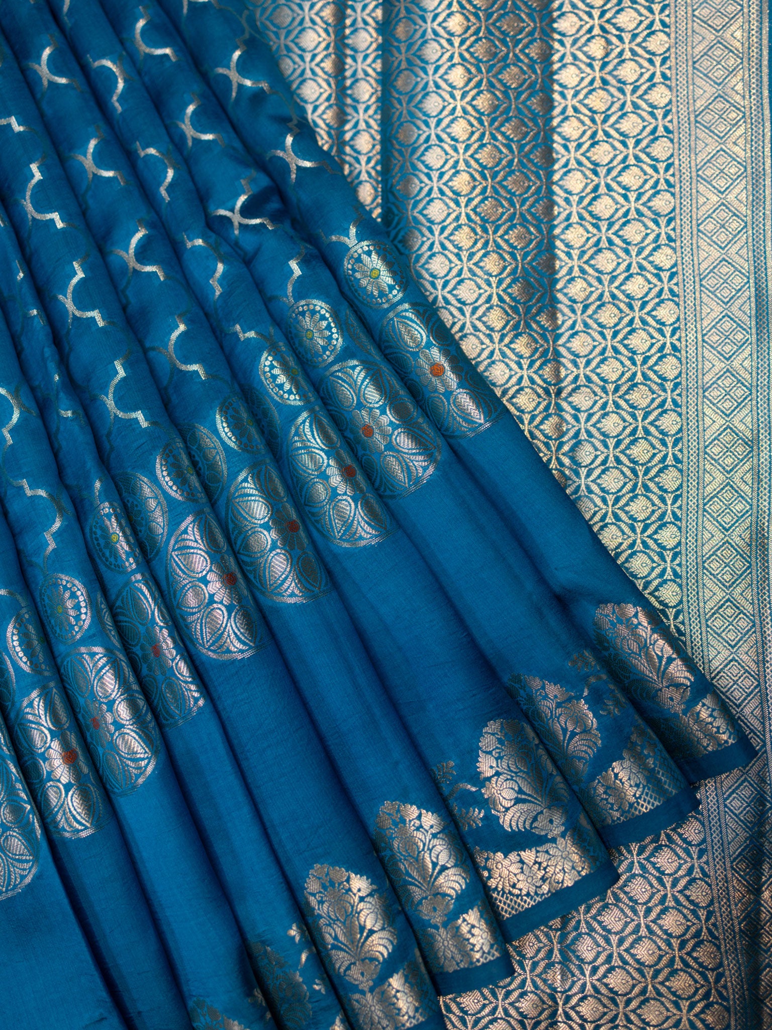 Add A Touch Of Elegance With This Anandha Blue Chiniya Silk Saree Featuring An All Over Design With Small Self Gold Zari Ideal For Weddings Festive And Traditional Wear