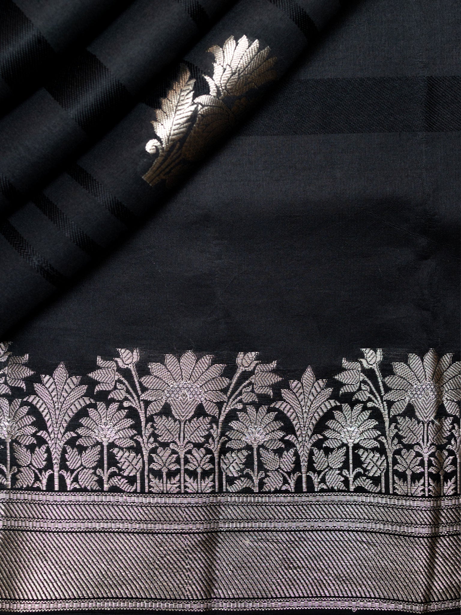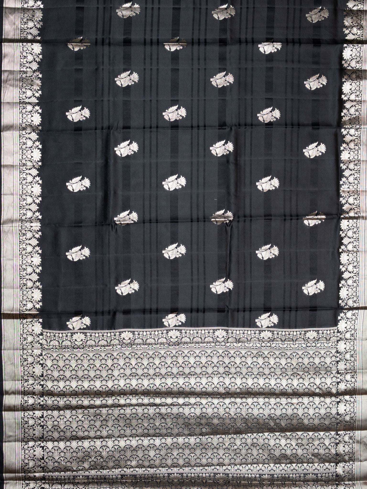 Discover Timeless Elegance With This Black Chiniya Silk Saree Featuring Delicate Silver Zari Butta And A Contrast Silver Zari Border. Perfect For Festive Wear