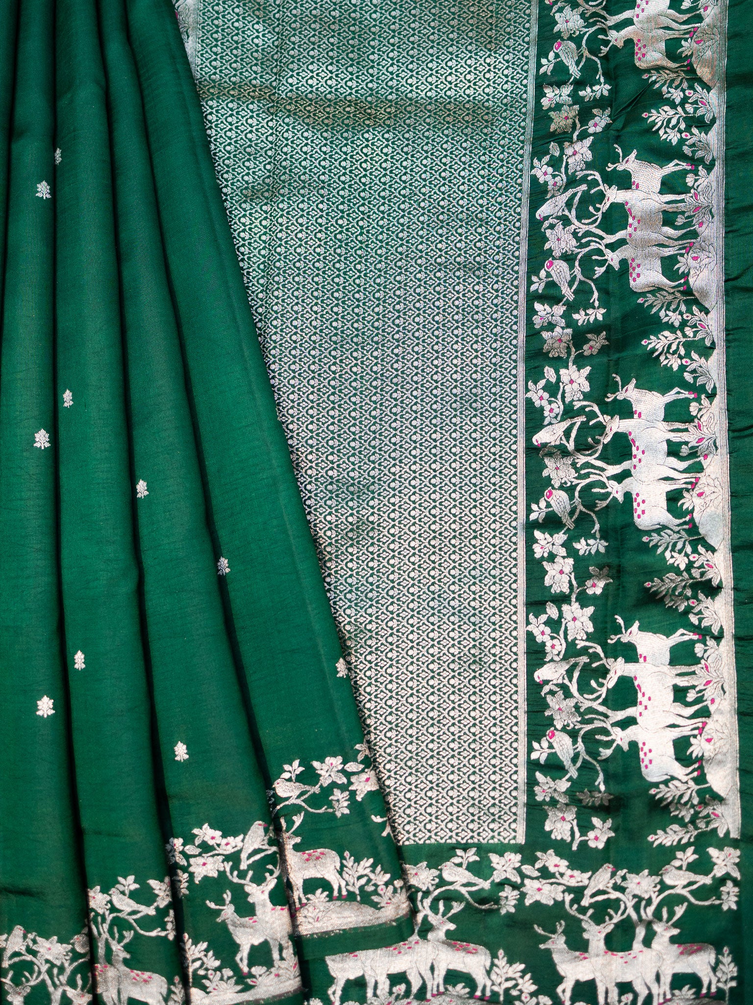 Bring Grace To Every Celebration With This Bottle Green Chiniya Silk Saree Featuring A Small Butta Pattern With Deer Border And Self Gold Zari Perfect For Weddings And Festivals