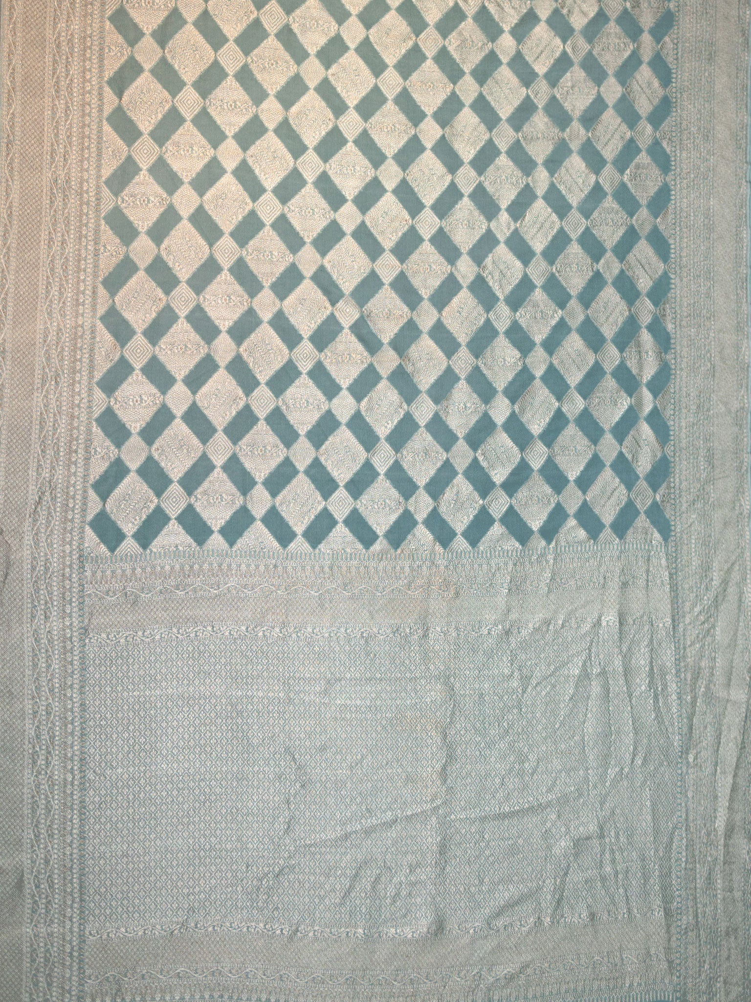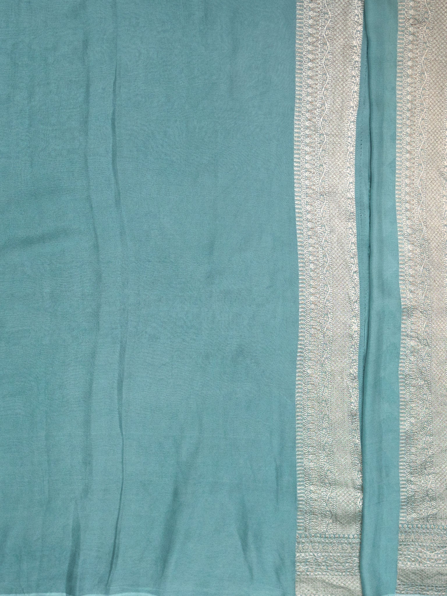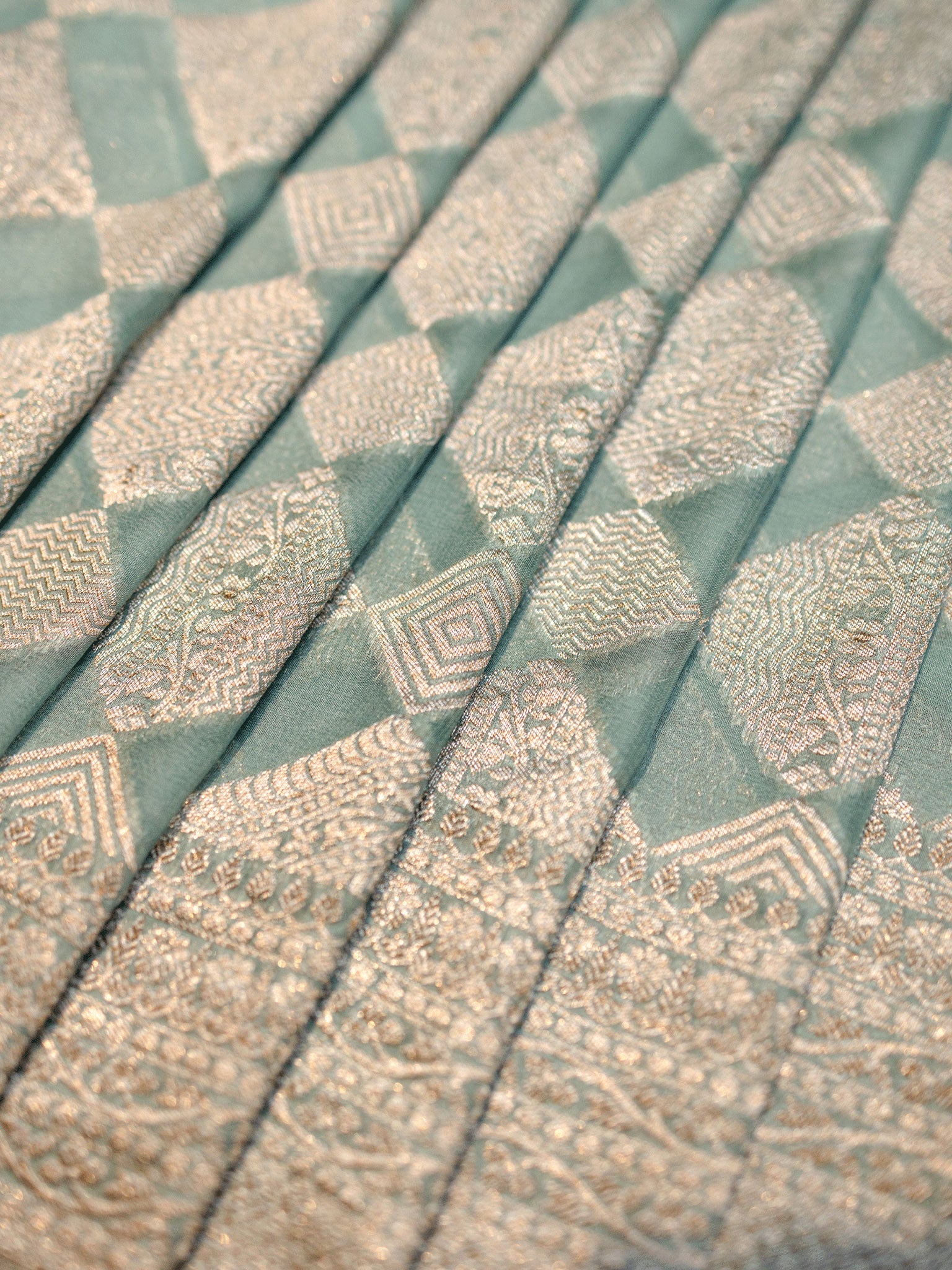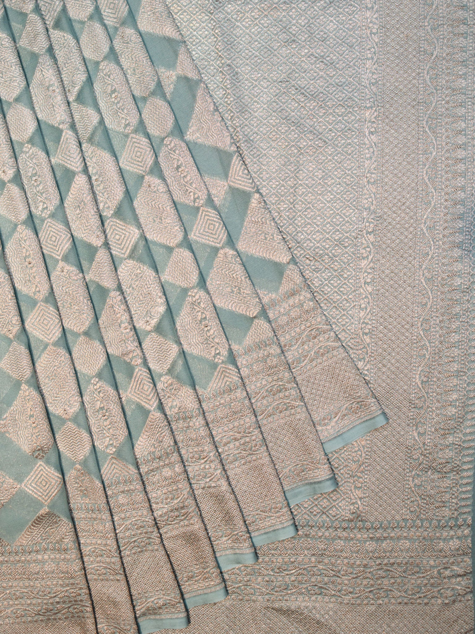 Elegant Blue Kaddi Georgette Banarasi Saree Featuring Intricate Geometrical Zari Design With A Classic Zari Border. A Perfect Choice For Weddings And Festive Wear.