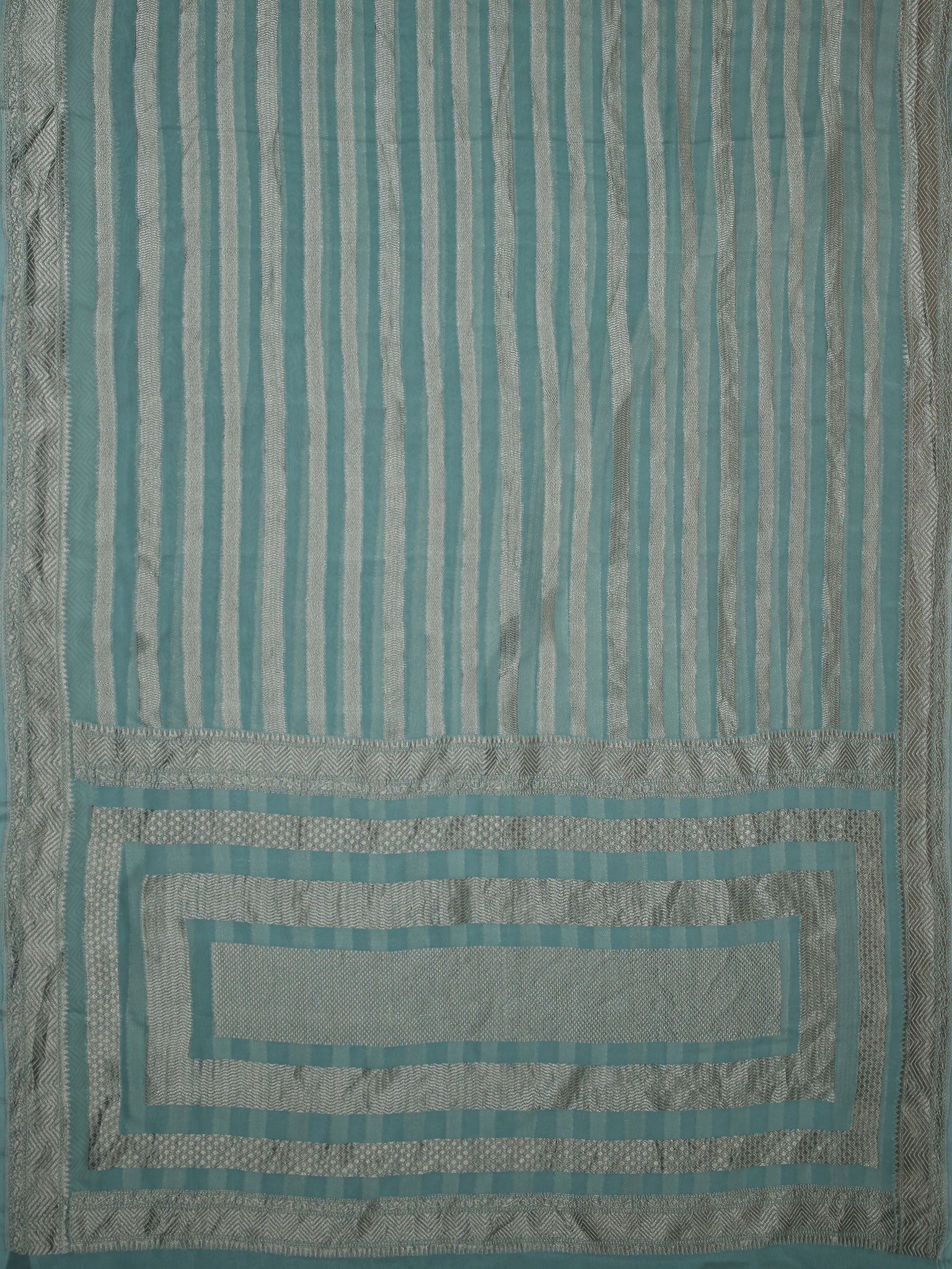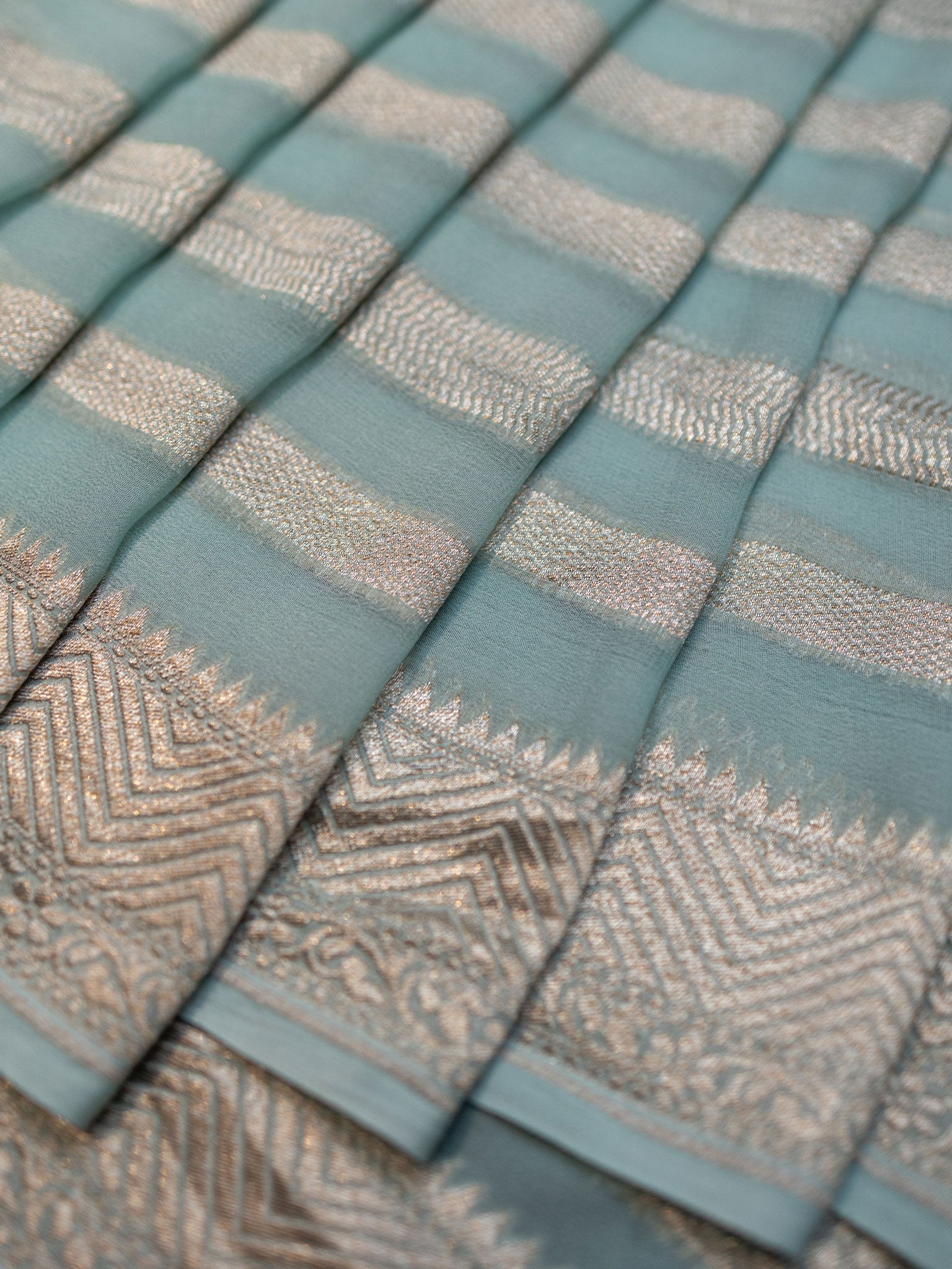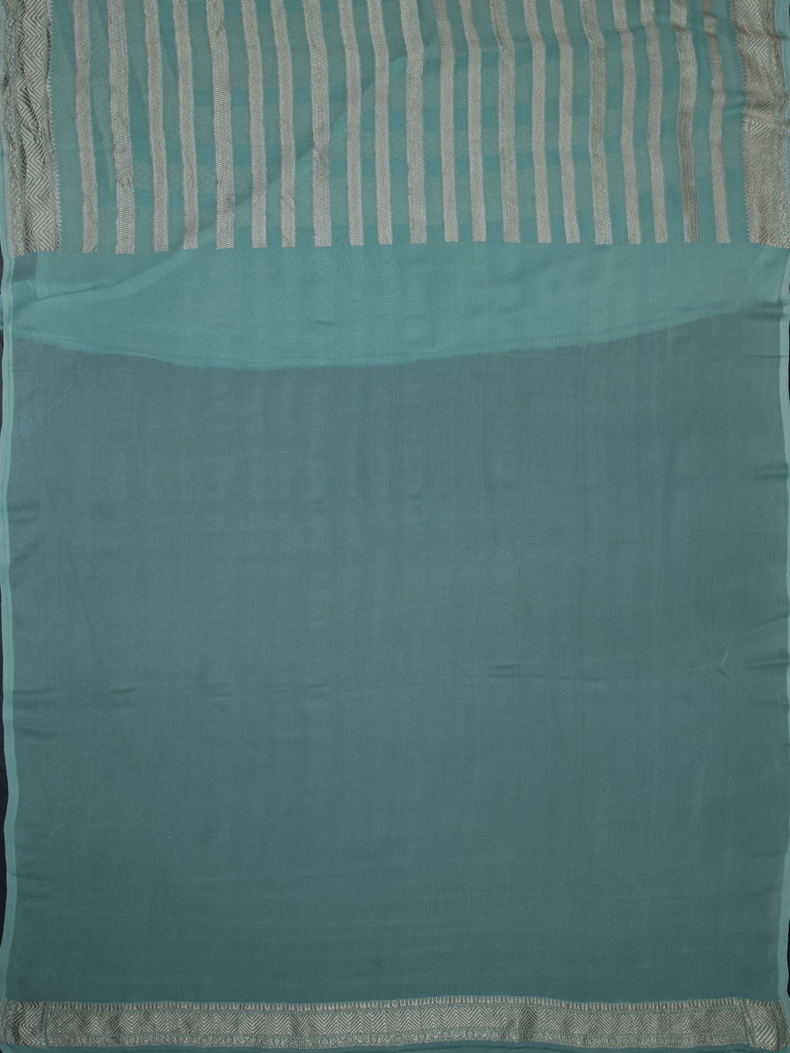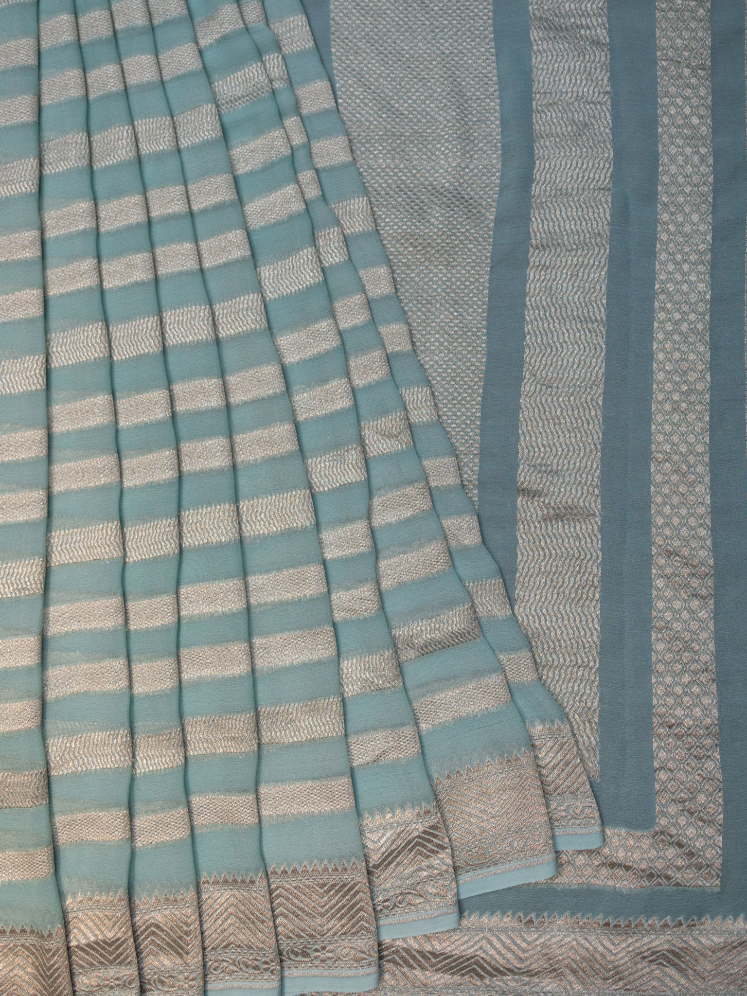 Elegant Blue Kaddi Georgette Banarasi Saree Featuring Refined Horizontal Zari Lines With A Classic Zari Border. A Graceful Choice For Weddings, Parties, And Festive Wear.