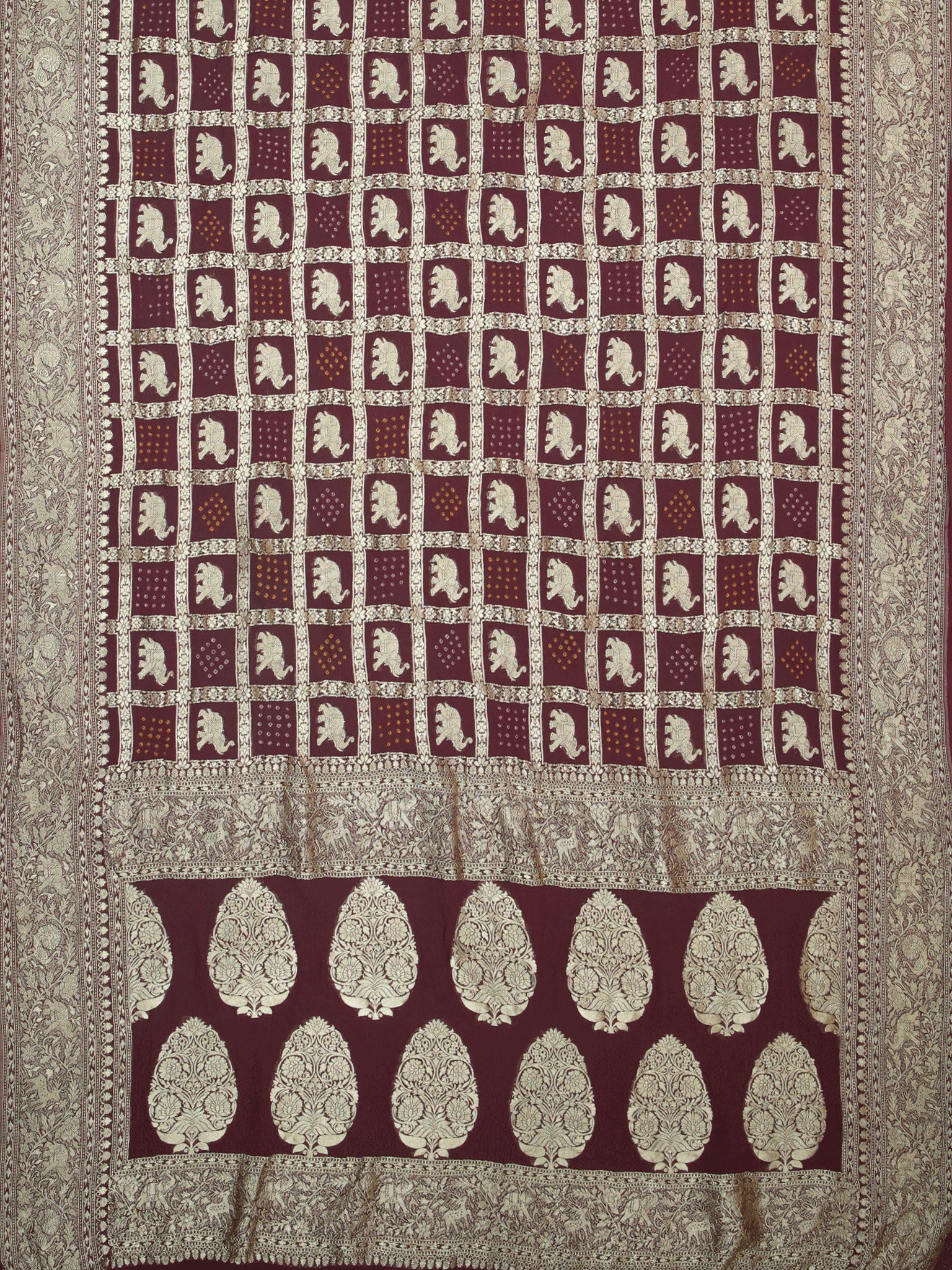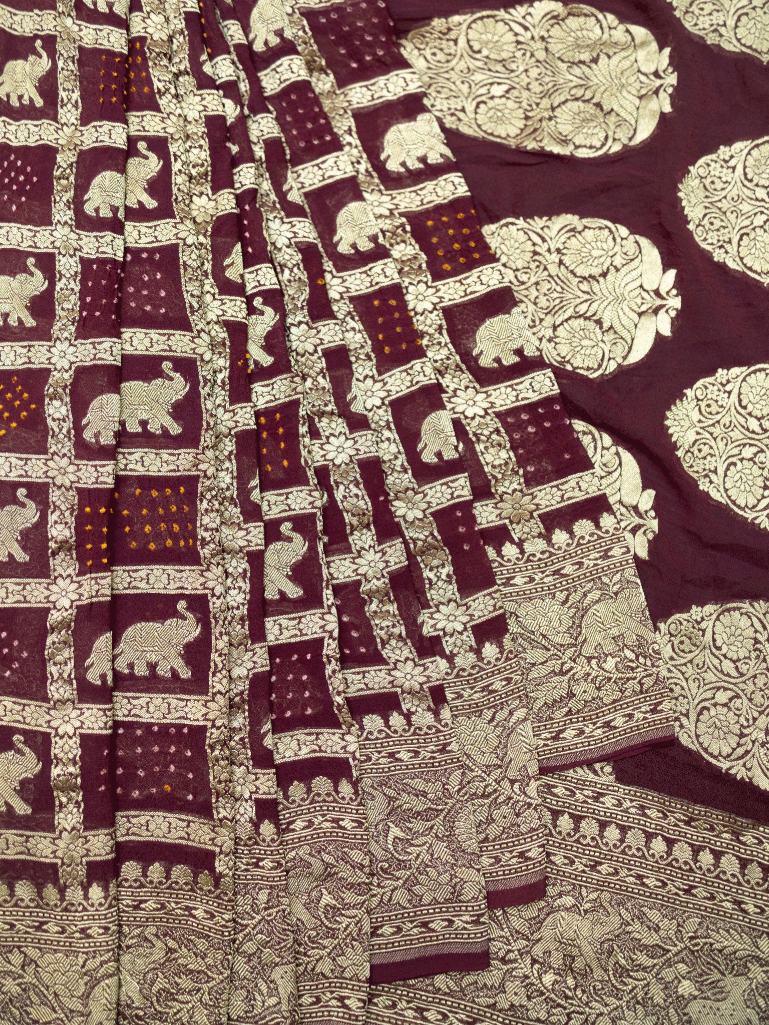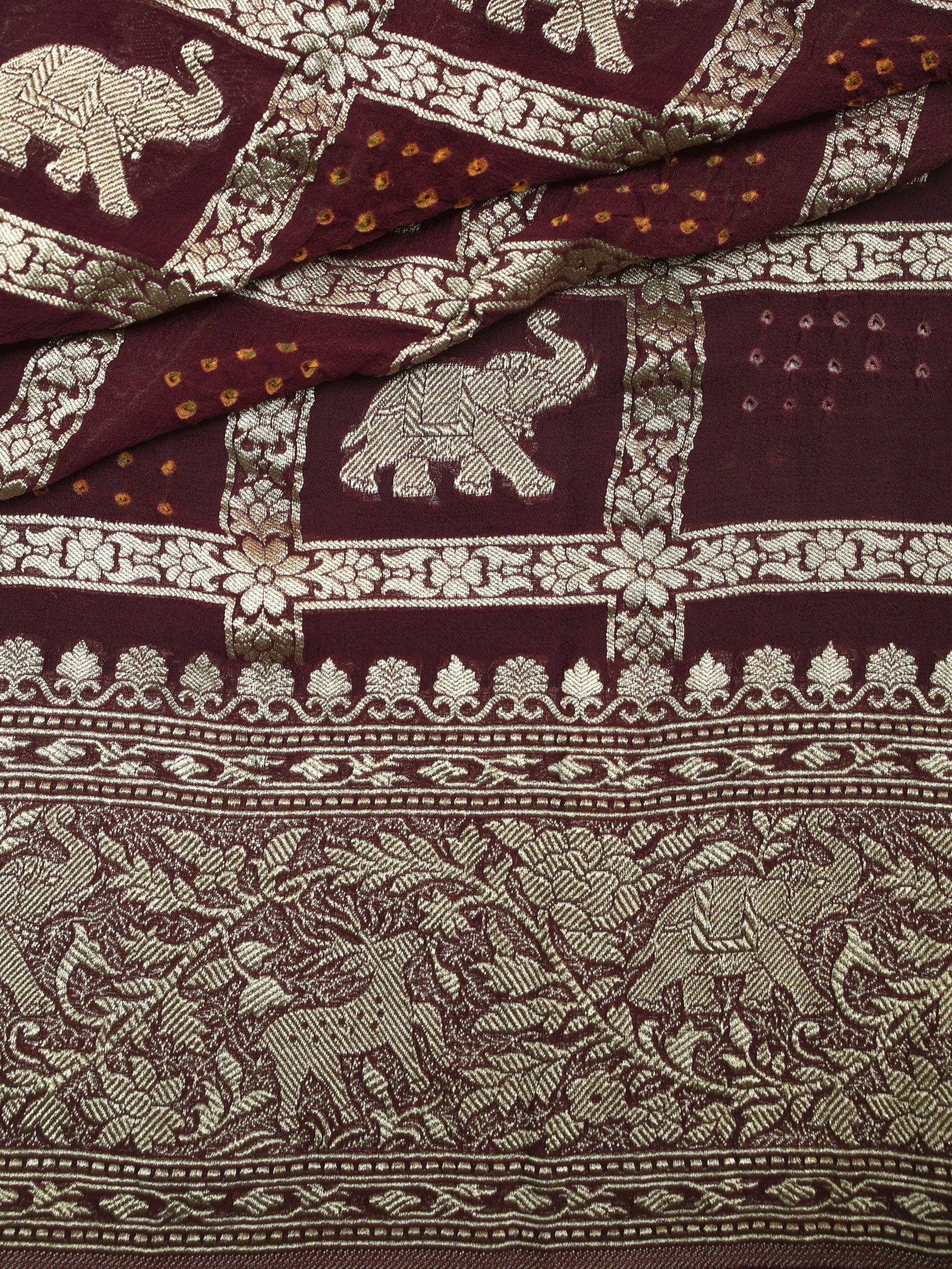 Elevate your wardrobe with this Fancy Georgette fabric featuring elegant zari checks, intricate butta motifs, and vibrant bandini prints in a rich wine hue. Lightweight and graceful, it offers a perfect blend of traditional charm and contemporary style, ideal for festive occasions or special events. Experience comfort and sophistication wrapped in one exquisite piece.