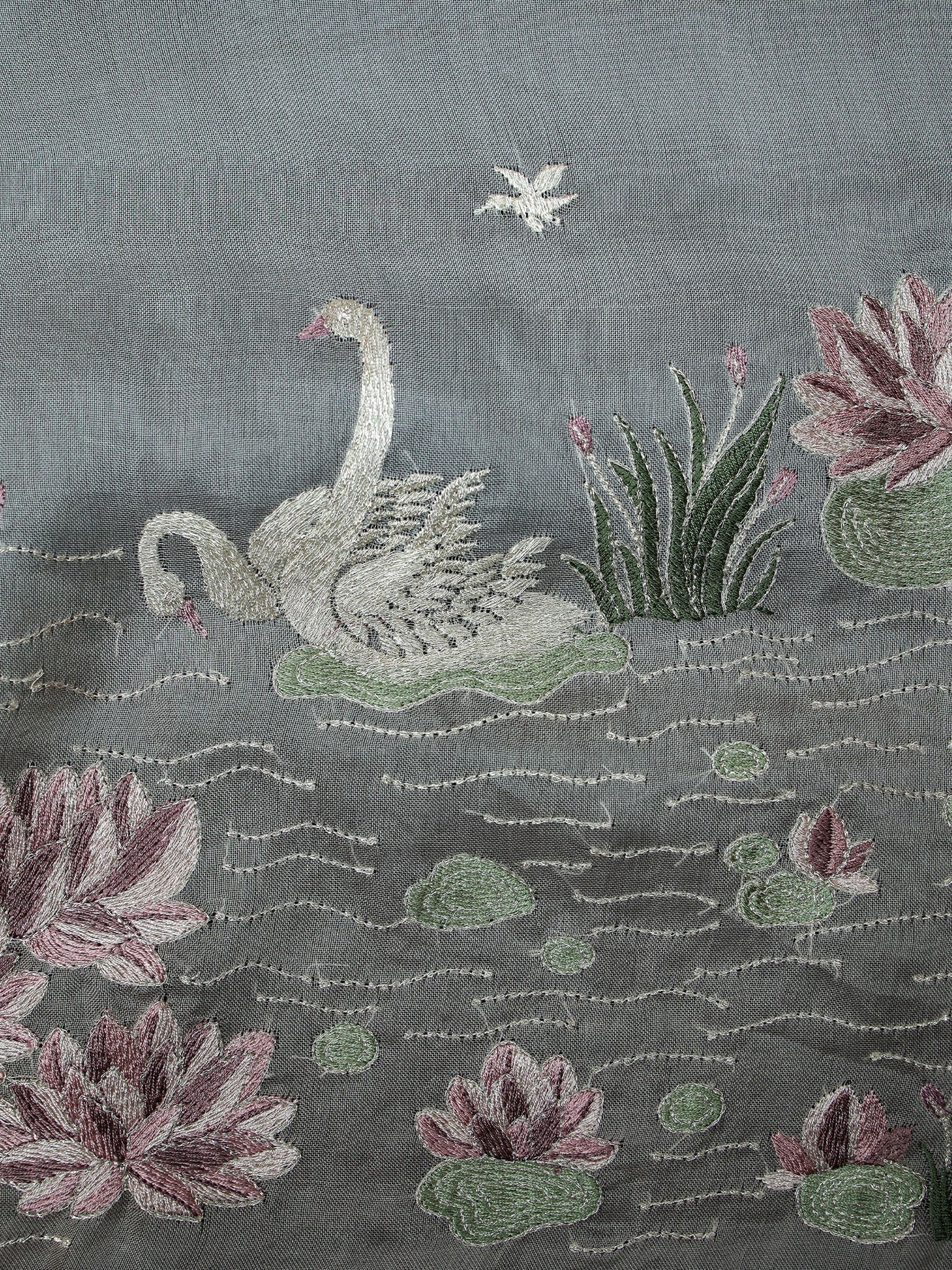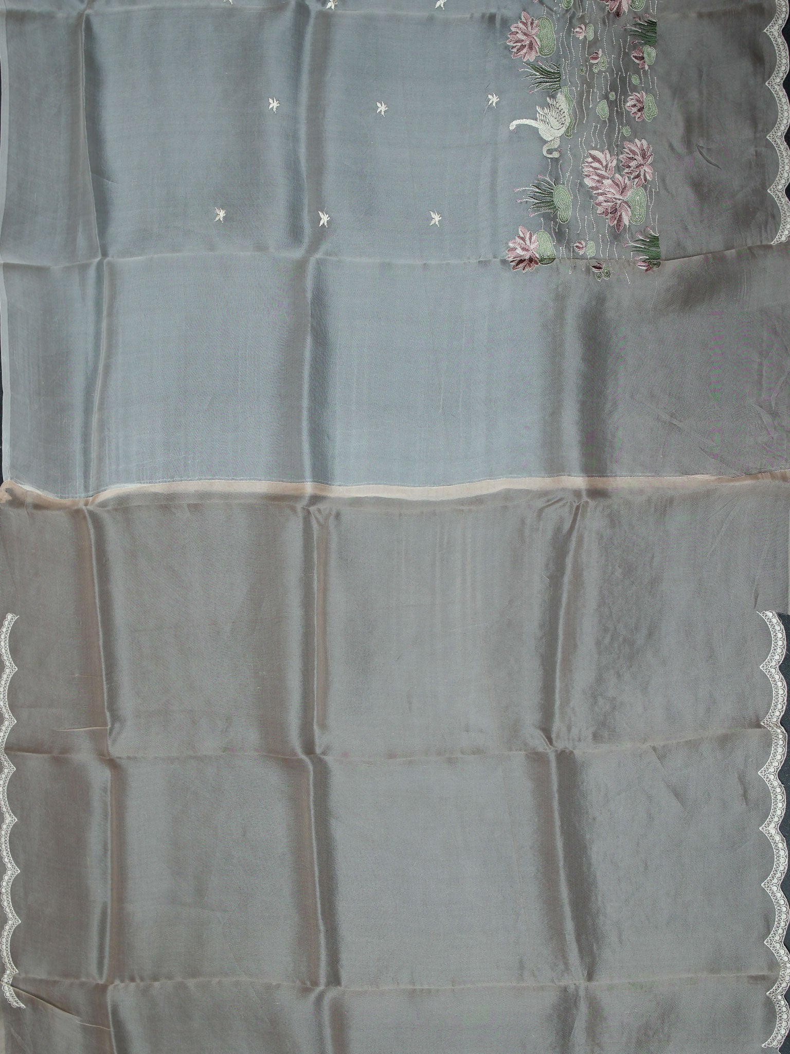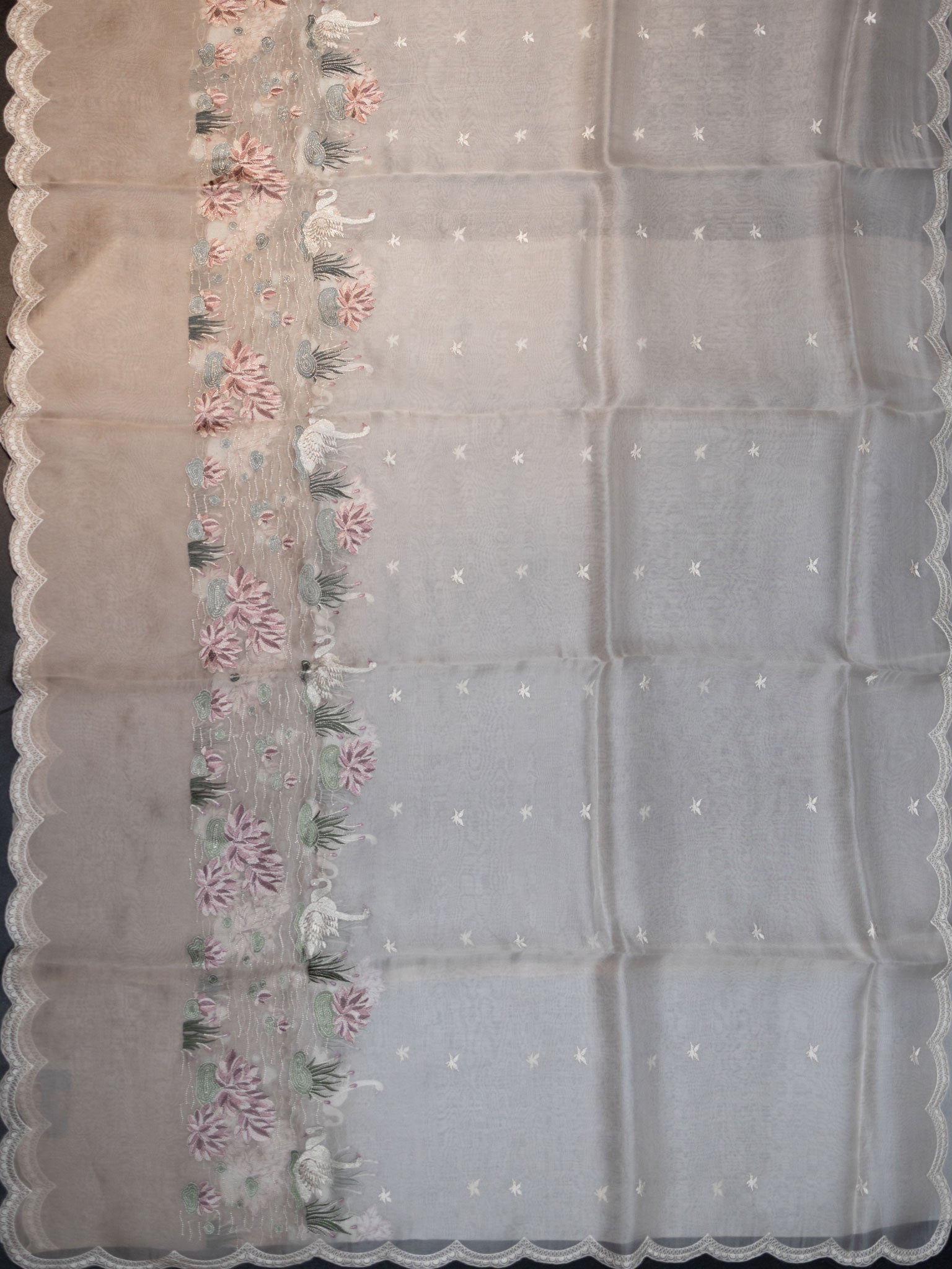Graceful Cream & Snuff Organza saree featuring fine thread work, delicate cutwork, and rich zari border. Perfect for festive and elegant occasions.