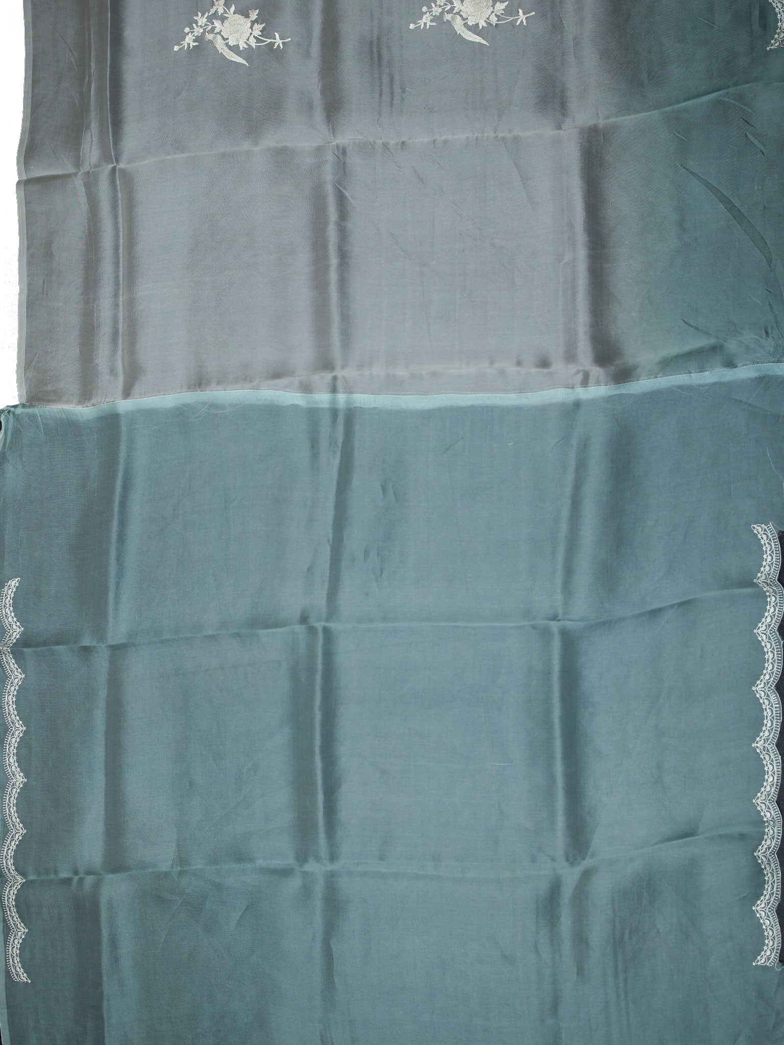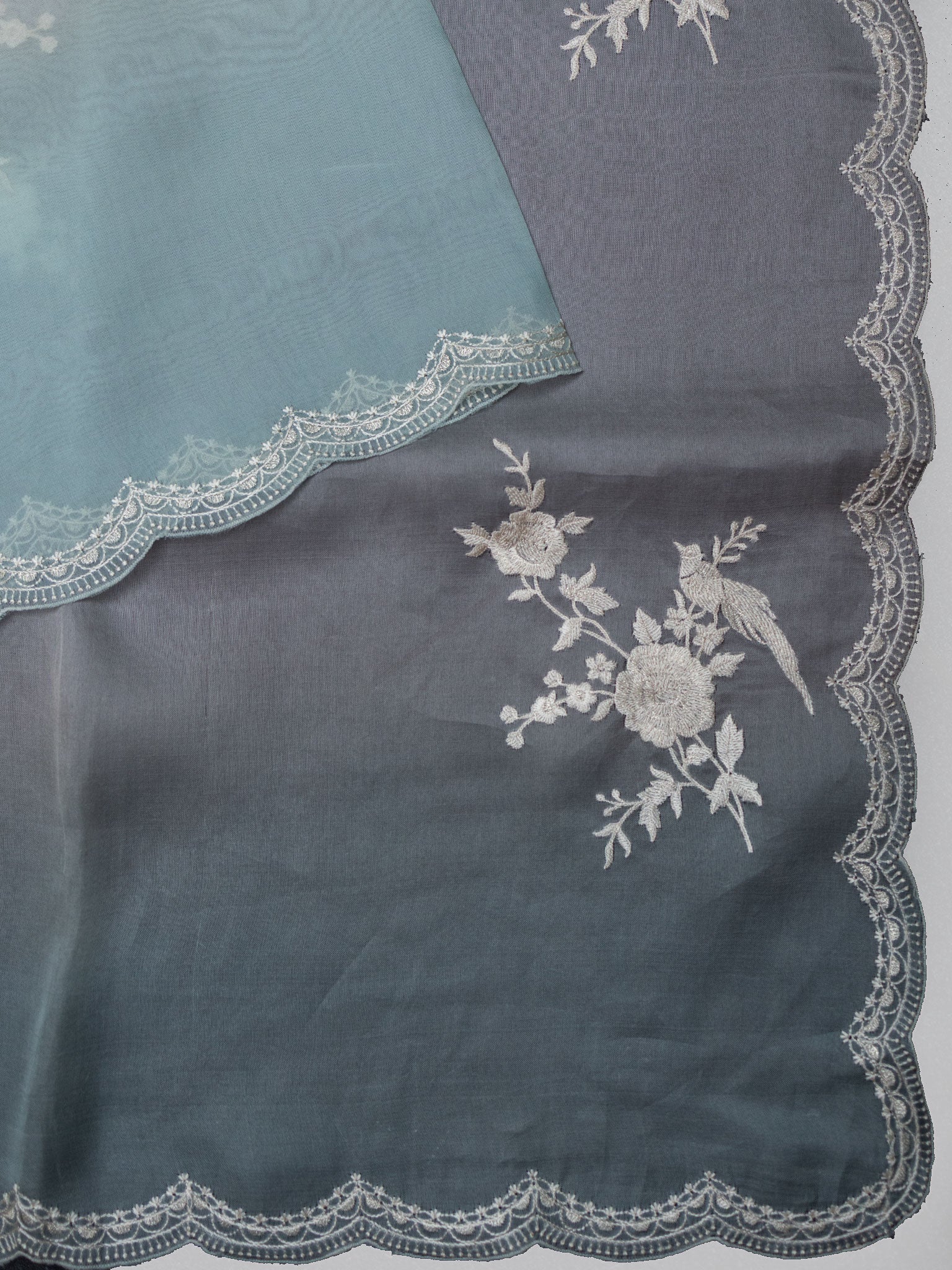 Elegant White & Blue Organza saree with multi-shade thread work and a scallop border. A stylish choice for festive, party, and occasion wear.