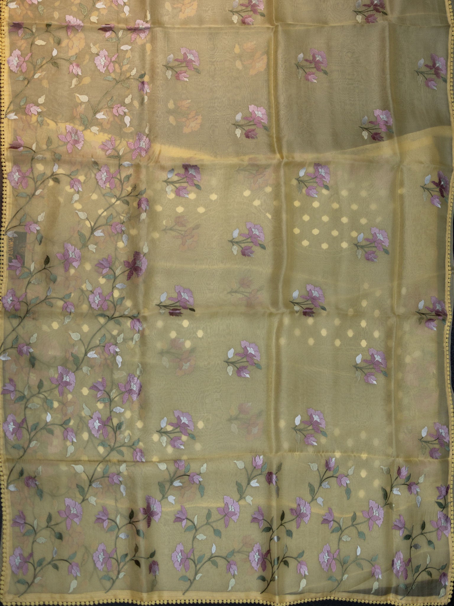 Grace Your Wardrobe With This Yellow Organza Saree Featuring Elegant Parsi Thread Work And Multi Colour Border Perfect For Weddings And Festive Events