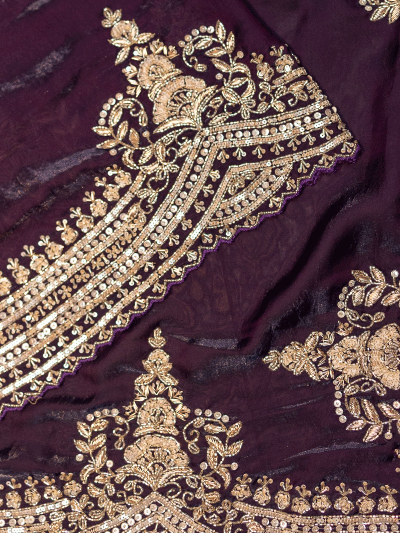 Elevate your style with this exquisite purple tissue crepe fabric, adorned with intricate handwork featuring shimmering sequins and delicate bead buttas. The elegant cut work border adds a refined touch, making it perfect for special occasions. Experience the blend of traditional craftsmanship and contemporary design that ensures you stand out with grace and sophistication.