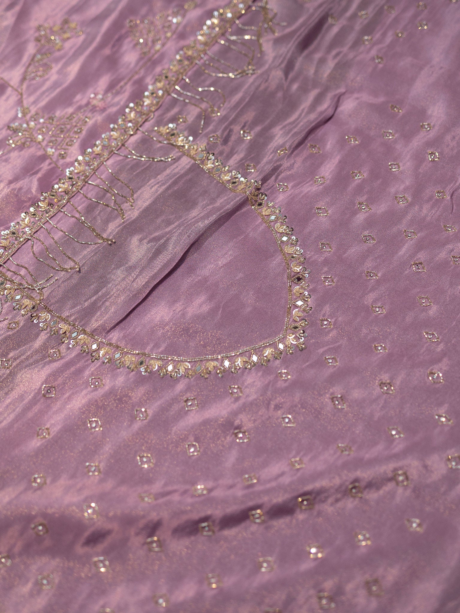 Elevate your wardrobe with the Fancy Tissue Satin Crepe in a soothing lavender shade. This fabric features delicate all-over work that adds a touch of elegance and sophistication, perfect for special occasions or stylish everyday wear. Its lightweight satin crepe texture ensures a graceful drape and comfortable feel, making it an ideal choice for those who appreciate both beauty and comfort. Transform your look effortlessly with this exquisite lavender fabric that blends charm and refinement.