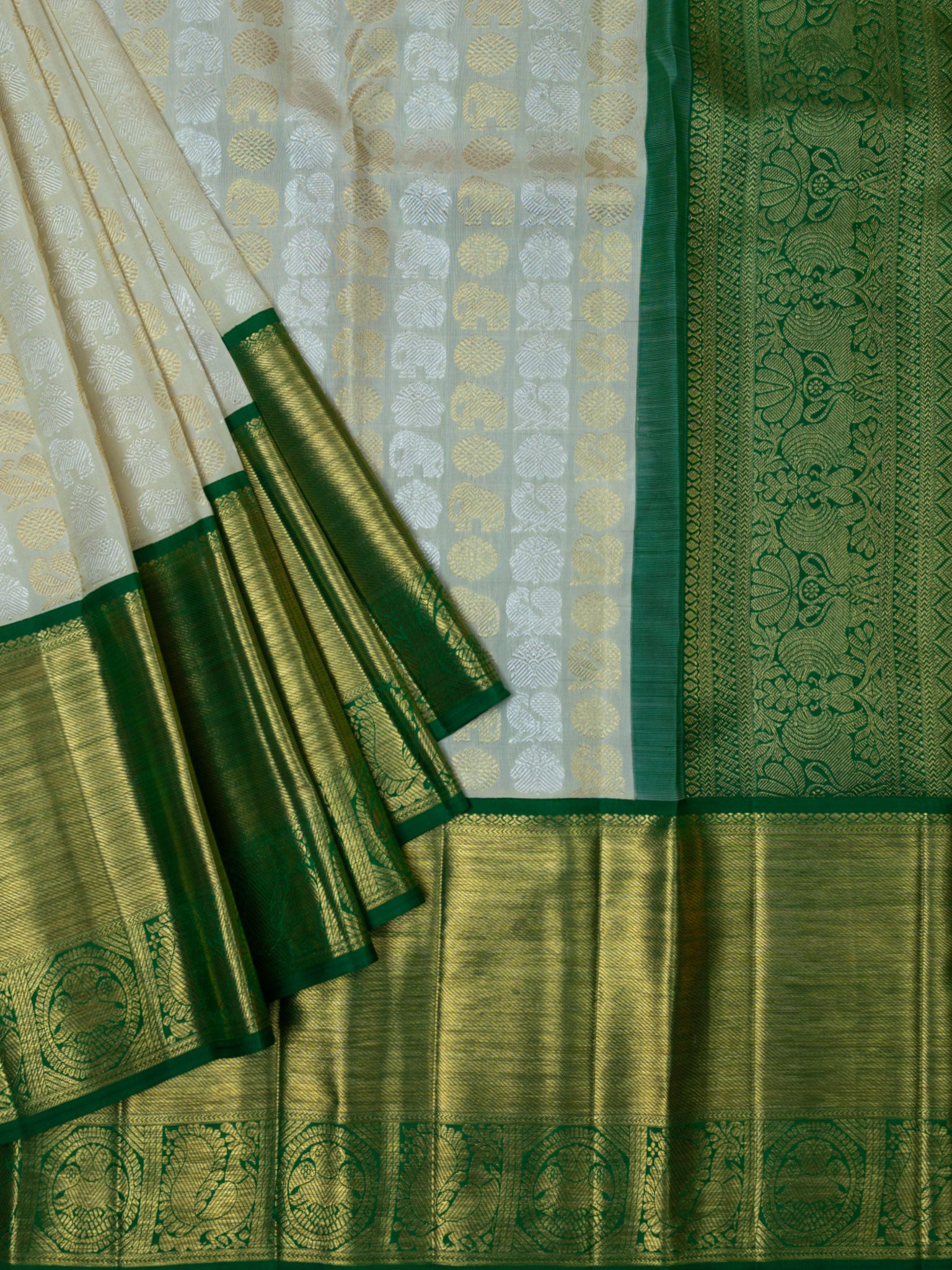 Experience timeless elegance with the Kanjeevaram Kanchi Pattu saree, featuring intricate all-over butta designs woven in gold and silver zari. The striking white and green combination is enhanced by a contrasting border, adding a regal touch to your ensemble. Perfect for special occasions, this saree blends traditional craftsmanship with vibrant colors, ensuring you stand out with grace and sophistication.