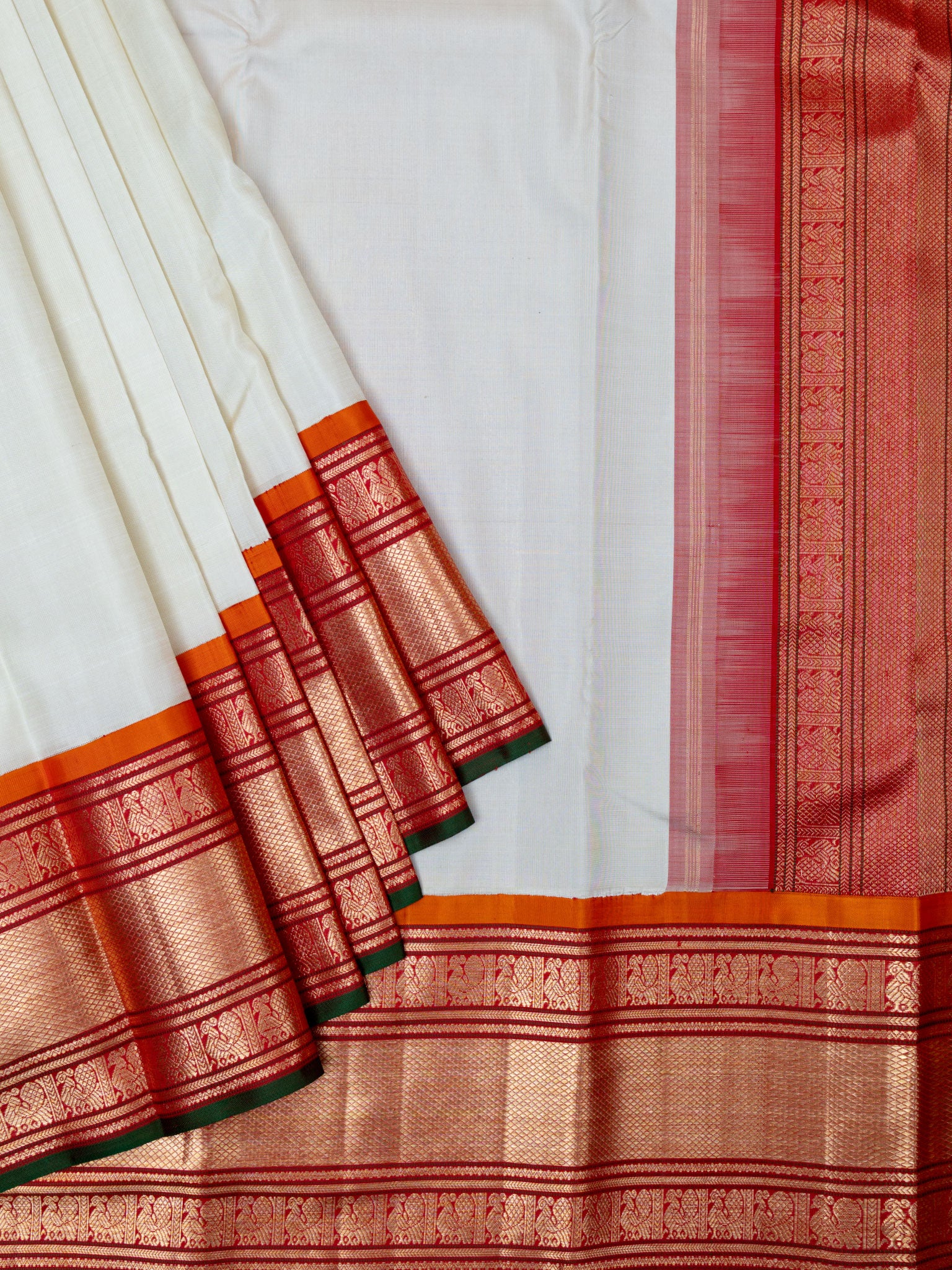 Experience timeless elegance with the Kanjeevaram Kanchi Pattu saree, featuring intricate all-over butta gold zari work. The rich cream base beautifully contrasts with a vibrant red border and edging, adding a striking touch to your traditional wardrobe. Perfect for weddings and festive occasions, this saree combines classic craftsmanship with luxurious appeal, ensuring you stand out with grace and style.