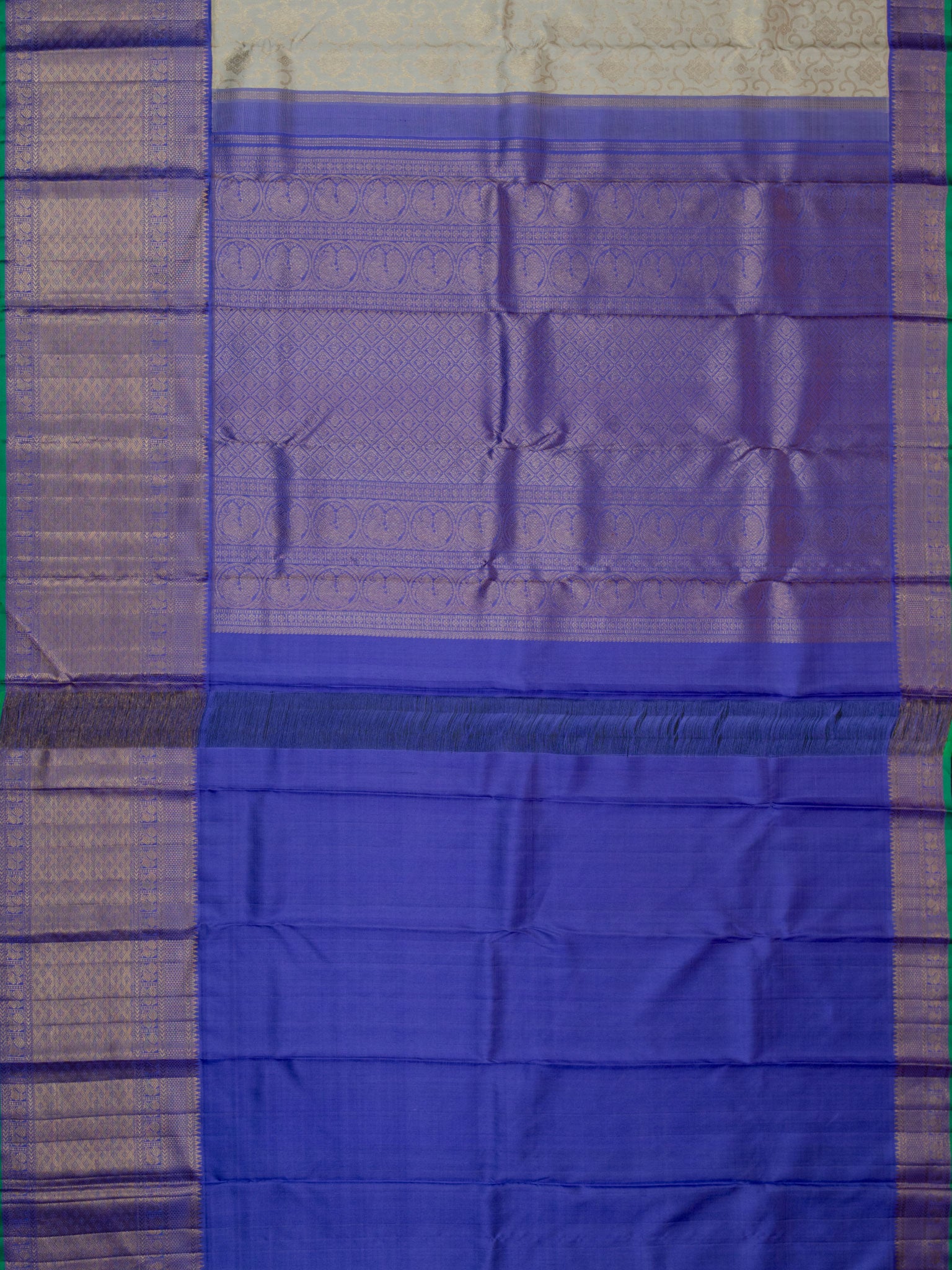 Experience timeless elegance with the Kanjeevaram Kanchi Pattu saree, featuring intricate all-over butta gold zari work. Its striking contrast border and edging in white, lilac, and green add a vibrant touch to traditional craftsmanship. Perfect for special occasions, this saree blends rich heritage with graceful style, ensuring you stand out with every drape.