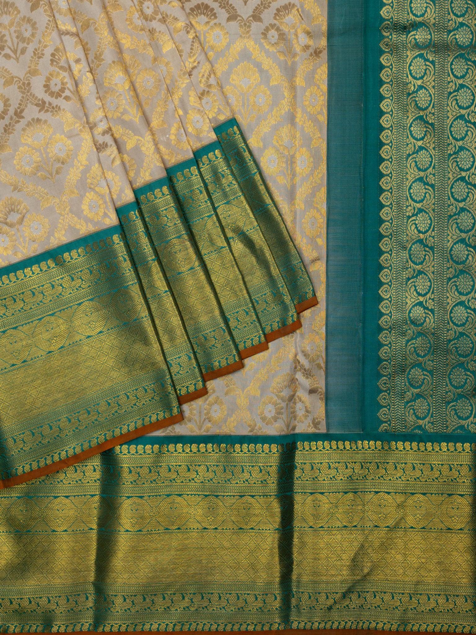 Experience timeless elegance with this Kanjeevaram Kanchi Pattu saree, featuring intricate all-over butta zari work that adds a luxurious shimmer. The rich cream base beautifully contrasts with vibrant green and orange borders and edging, creating a striking visual appeal. Perfect for festive occasions and traditional celebrations, this saree combines classic craftsmanship with bold colors to make you stand out effortlessly. Embrace heritage and style in one exquisite drape.