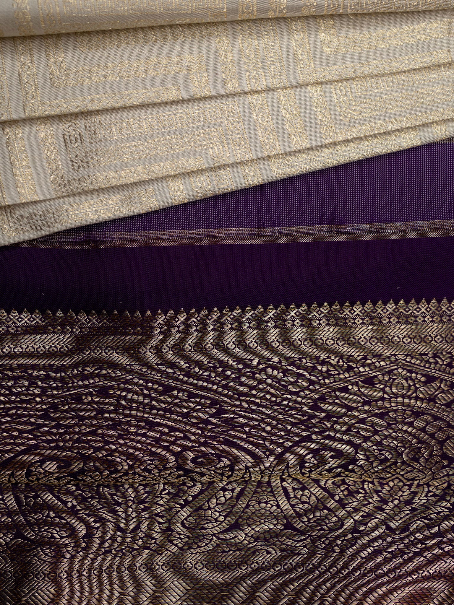 Experience timeless elegance with the Kanjeevaram Kanchi Pattu saree featuring intricate all-over butta zari work and a striking contrast border in white and purple. This exquisite saree blends rich tradition with vibrant colors, perfect for festive occasions and celebrations. Crafted for a graceful drape and lasting shine, it enhances your presence with every wear. Elevate your wardrobe with this classic piece that embodies sophistication and cultural heritage.