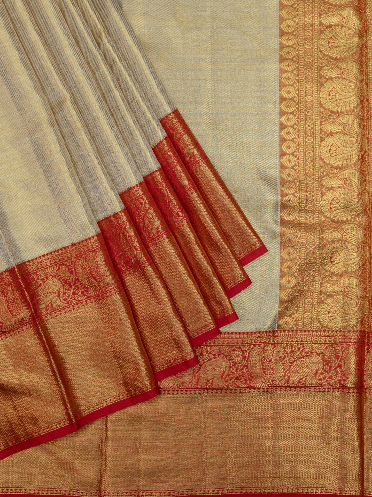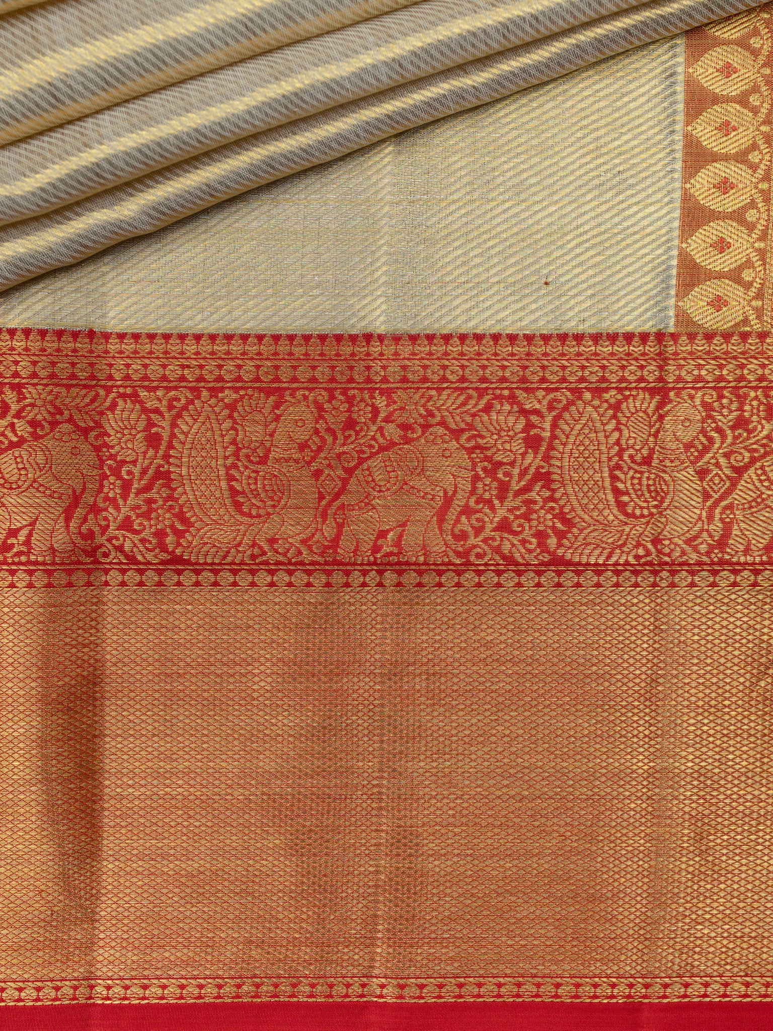 Experience timeless elegance with this Kanjeevaram Kanchi Pattu saree, featuring a sophisticated matte finish and a striking contrast border. The rich talambralu design on a matte base in vibrant red adds a regal touch, perfect for special occasions. Crafted with traditional artistry, this saree promises both grace and comfort, making it an essential addition to your ethnic wardrobe. Elevate your style effortlessly with this exquisite blend of heritage and modern appeal.
