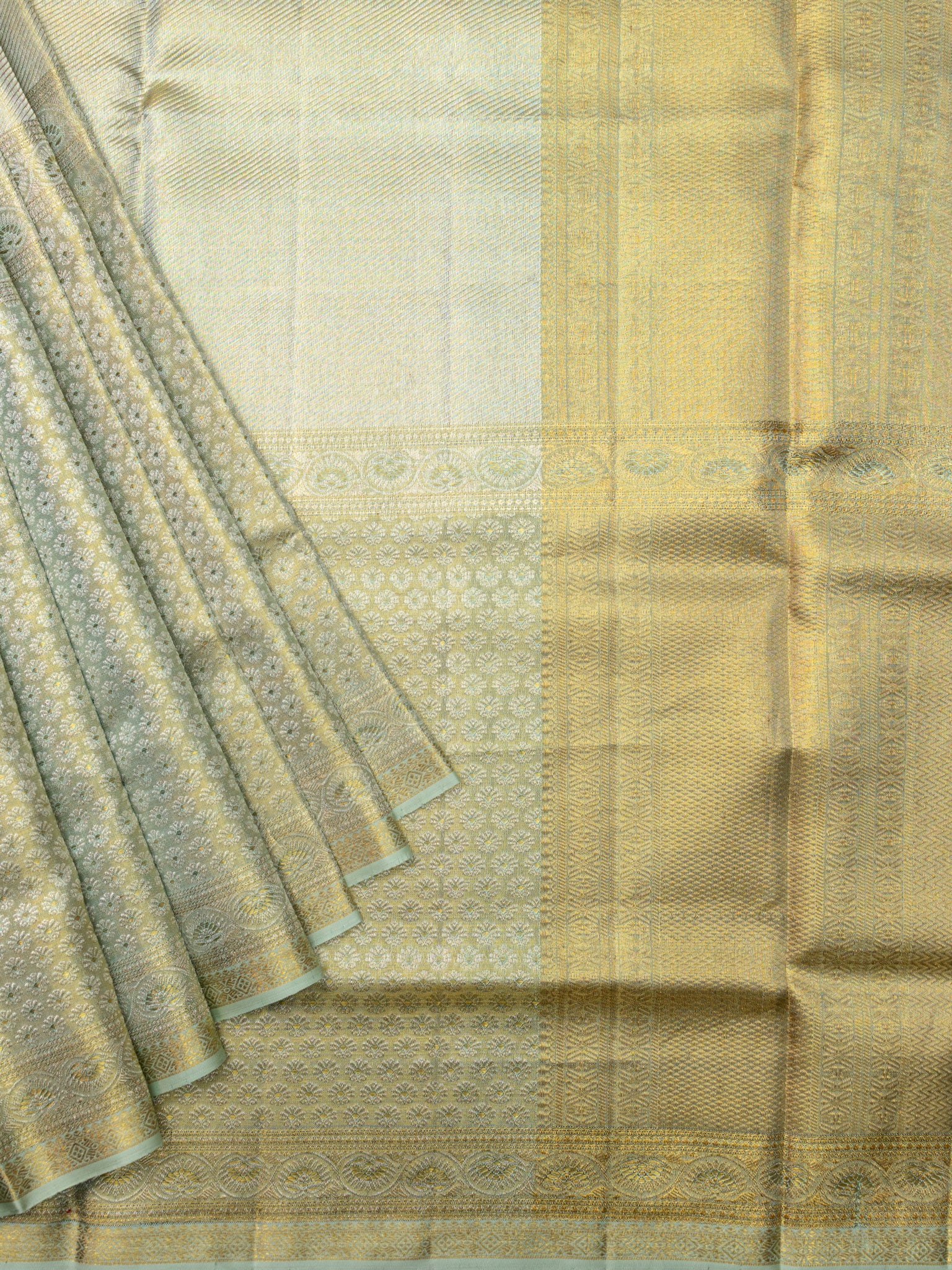 Experience the timeless elegance of the Kanjeevaram Kanchi Pattu saree, featuring a sophisticated matte finish and exquisite meenakari contrast edging. The cream matte base paired with subtle ash tones creates a graceful and refined look, perfect for special occasions. Crafted with traditional artistry, this saree offers both style and comfort, making it a must-have addition to your wardrobe. Elevate your ethnic collection with this stunning blend of classic charm and contemporary appeal.