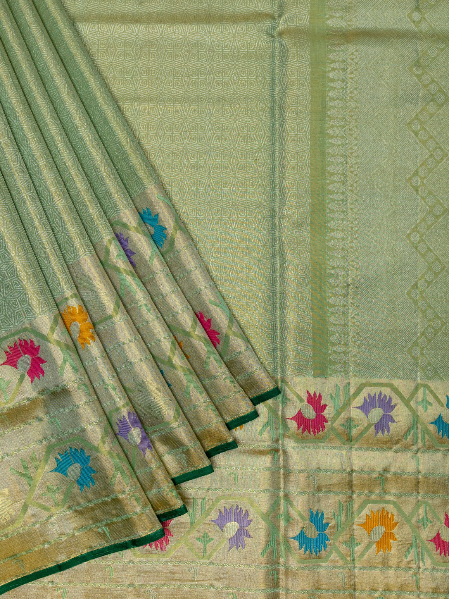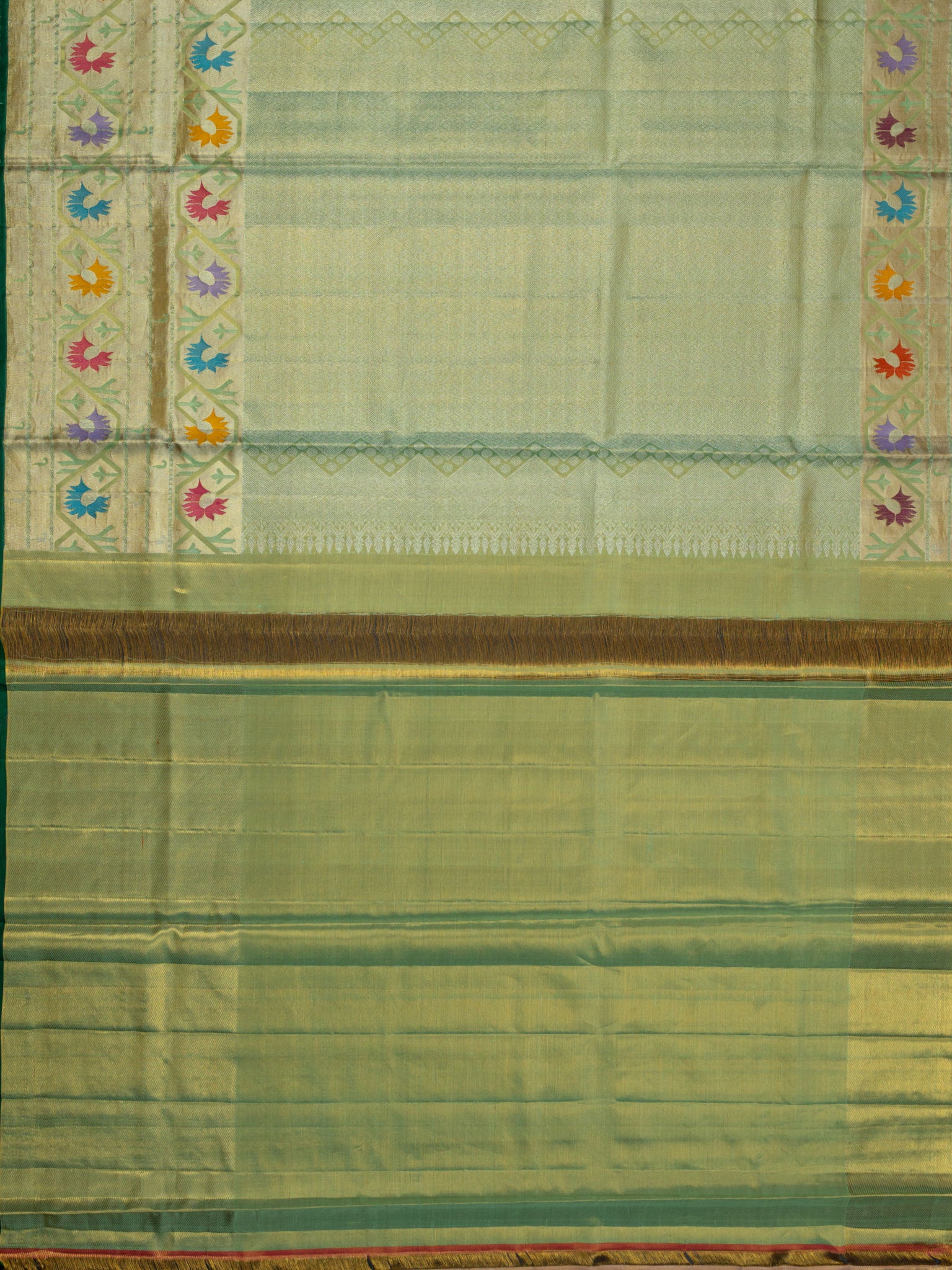 Experience the timeless elegance of this Kanjeevaram Kanchi Pattu saree, featuring a rich matte finish and exquisite Meenakari contrast edging. The deep green base adds a sophisticated touch, making it perfect for festive occasions and celebrations. Crafted with traditional artistry, this saree offers both style and comfort, ensuring you stand out with grace and charm. Elevate your wardrobe with this classic piece that blends heritage and contemporary appeal seamlessly.