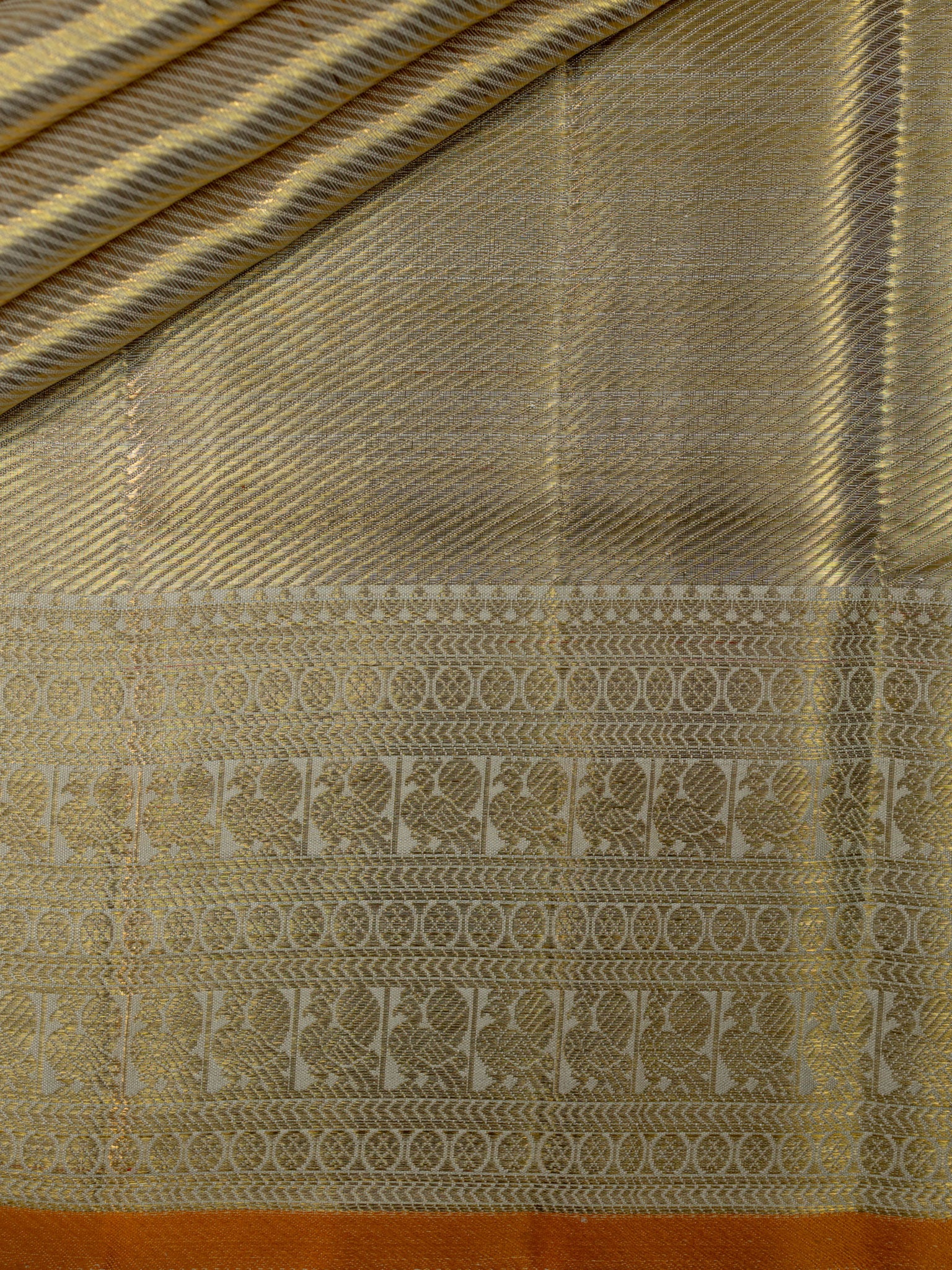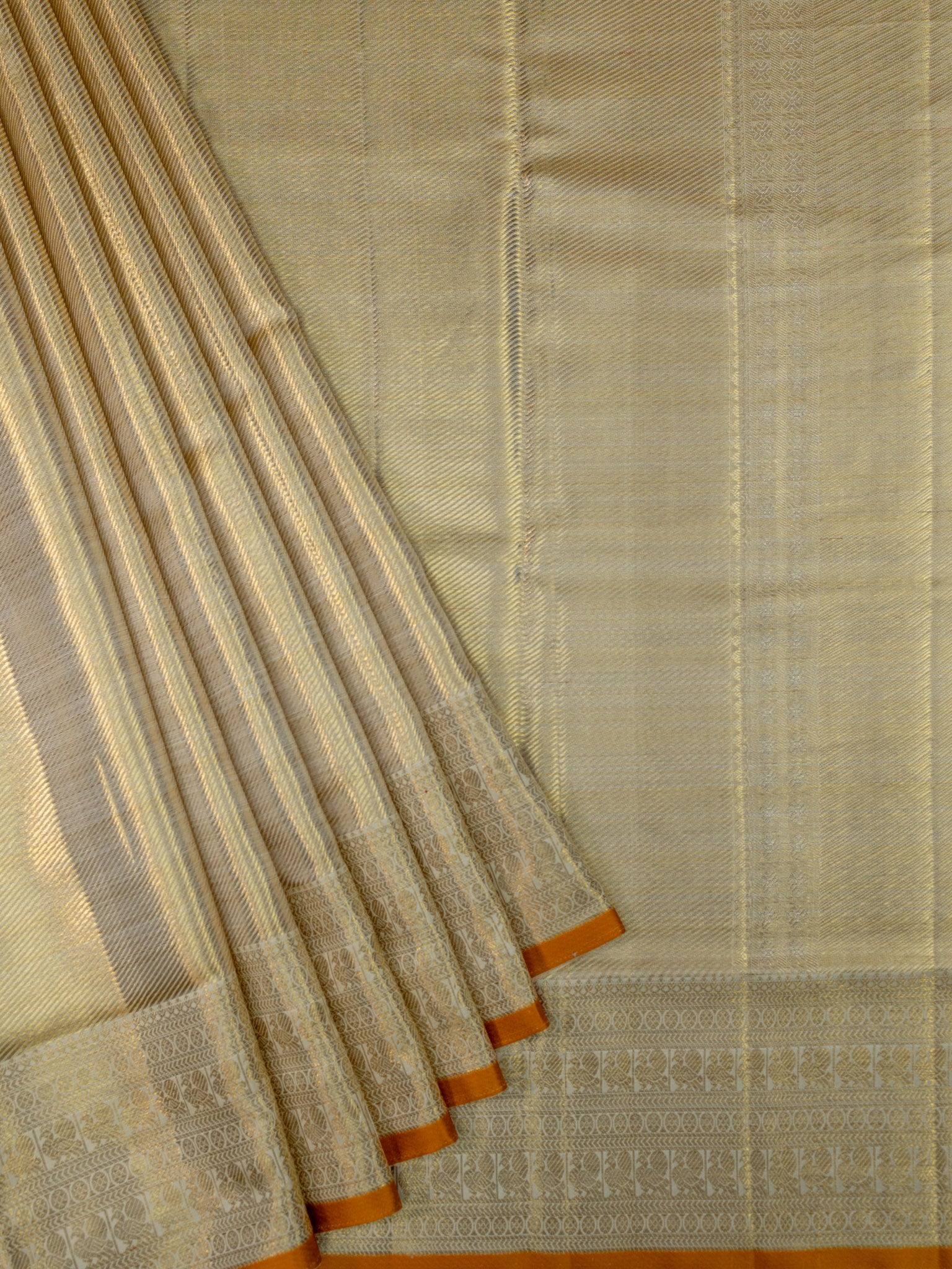 Experience the timeless elegance of the Kanjeevaram Kanchi Pattu saree, featuring a luxurious matte finish with a striking contrast edging. The cream matte base beautifully complements the vibrant orange border, creating a perfect blend of tradition and style. Ideal for festive occasions and celebrations, this saree offers rich texture and graceful drape, ensuring you stand out with classic sophistication. Elevate your wardrobe with this exquisite piece that embodies heritage and contemporary charm.