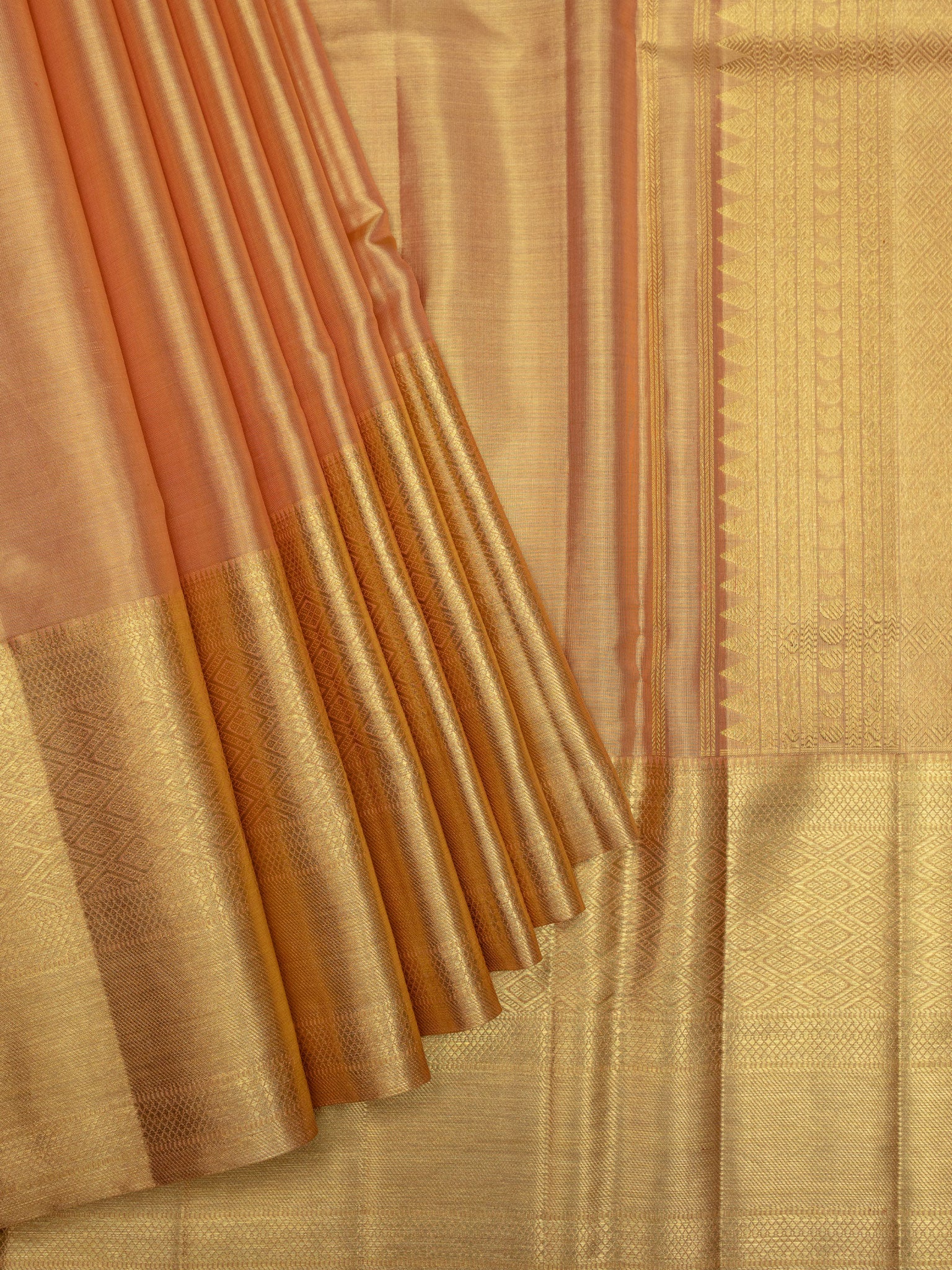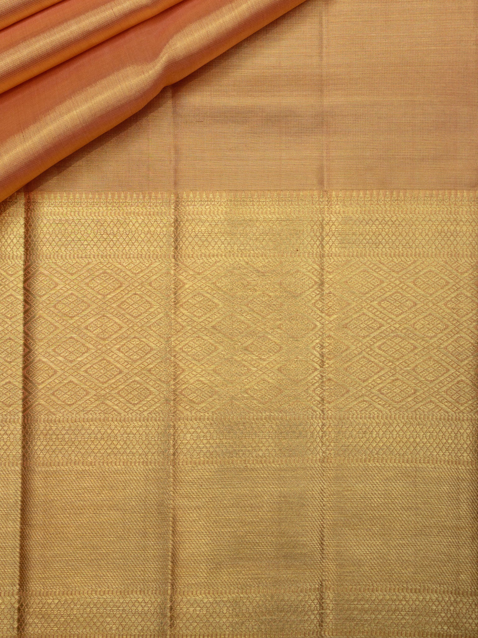 Experience timeless elegance with this Kanjeevaram Kanchi Pattu saree featuring a matte peach base and a rich Kanchi border. The subtle matte finish enhances its sophisticated charm, while the intricate gold zari work adds a touch of regal luxury. Perfect for special occasions, this saree combines traditional craftsmanship with contemporary style, ensuring you stand out with grace and poise. Elevate your wardrobe with this exquisite piece that celebrates heritage and beauty.