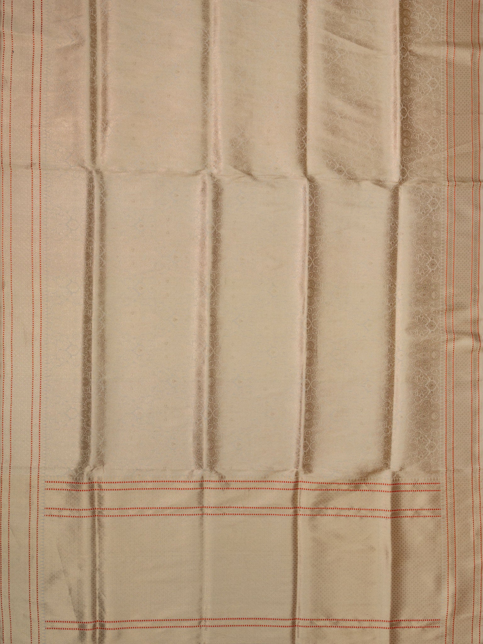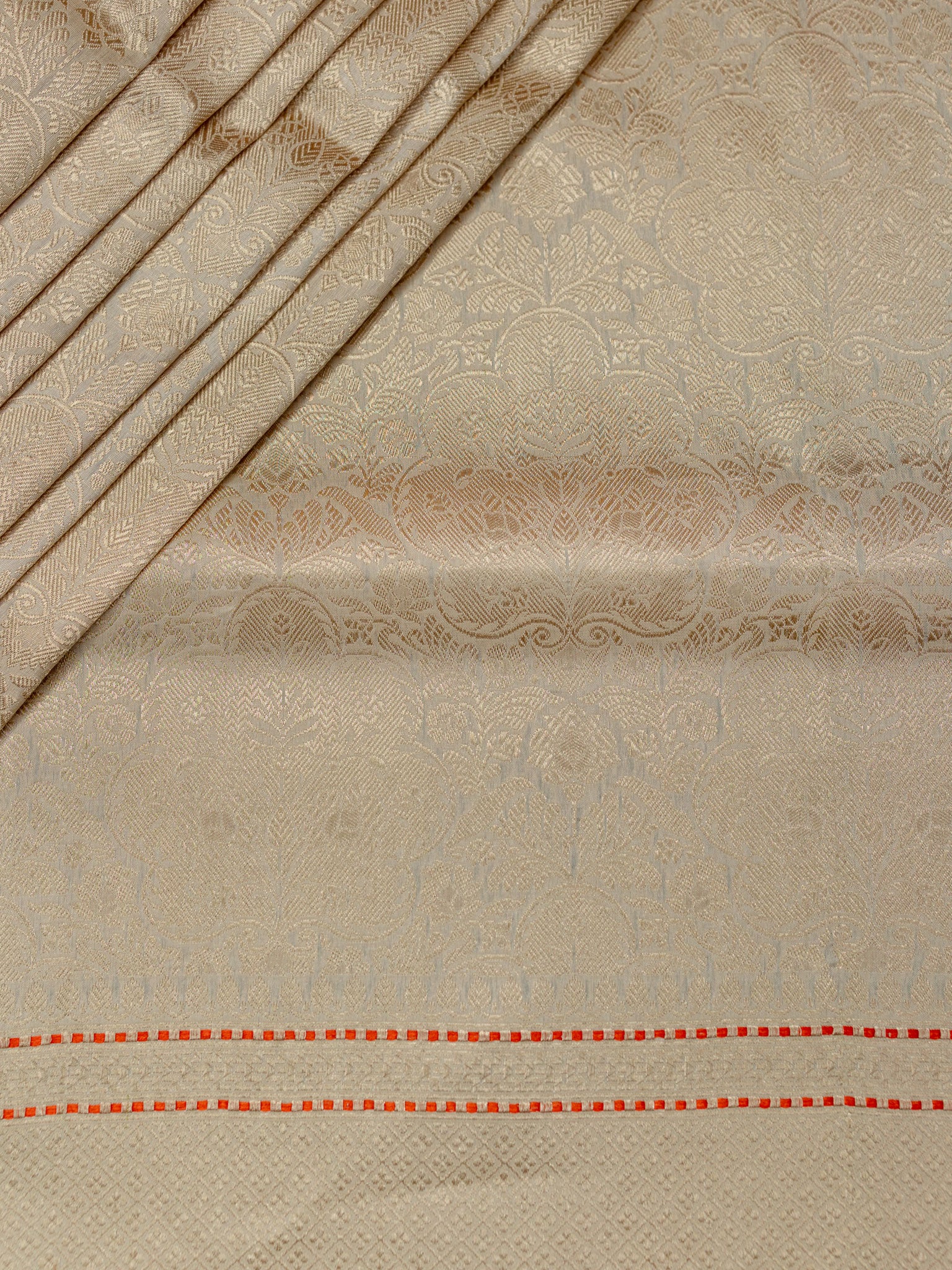 Off White Banarasi Jaal saree with Gold Zari and Self border. Unstitched, premium silk perfect for festive occasions, weddings, and traditional celebrations.