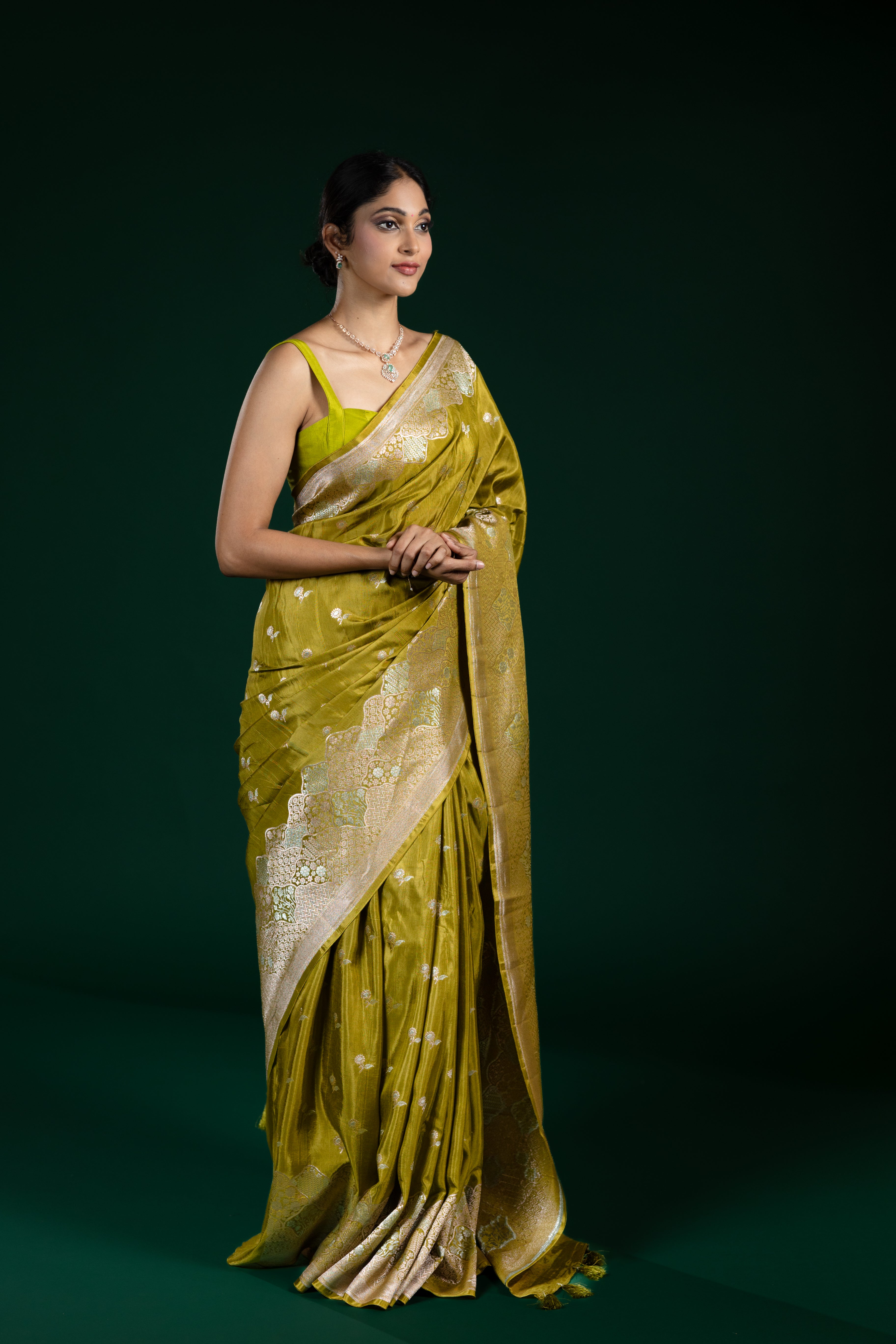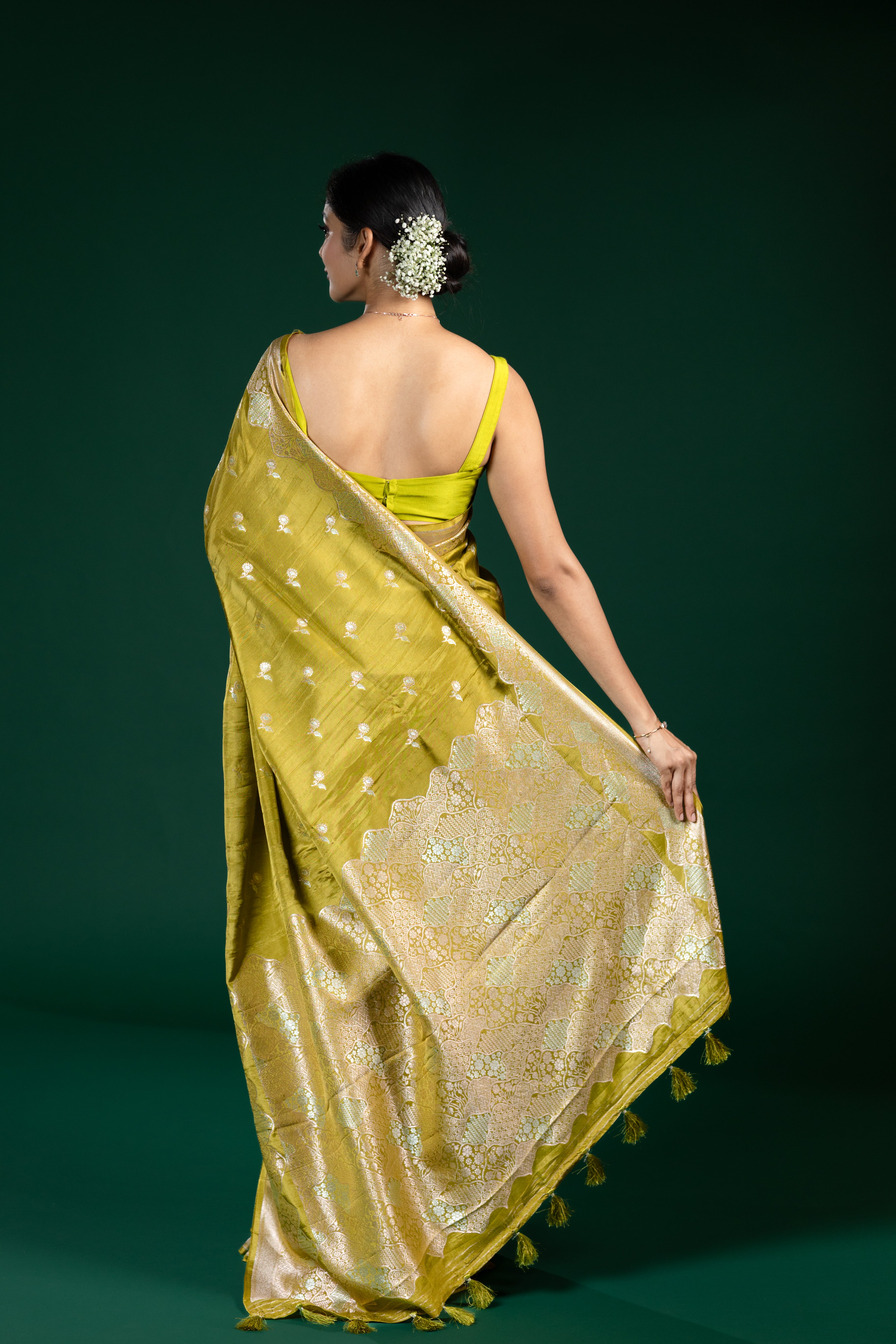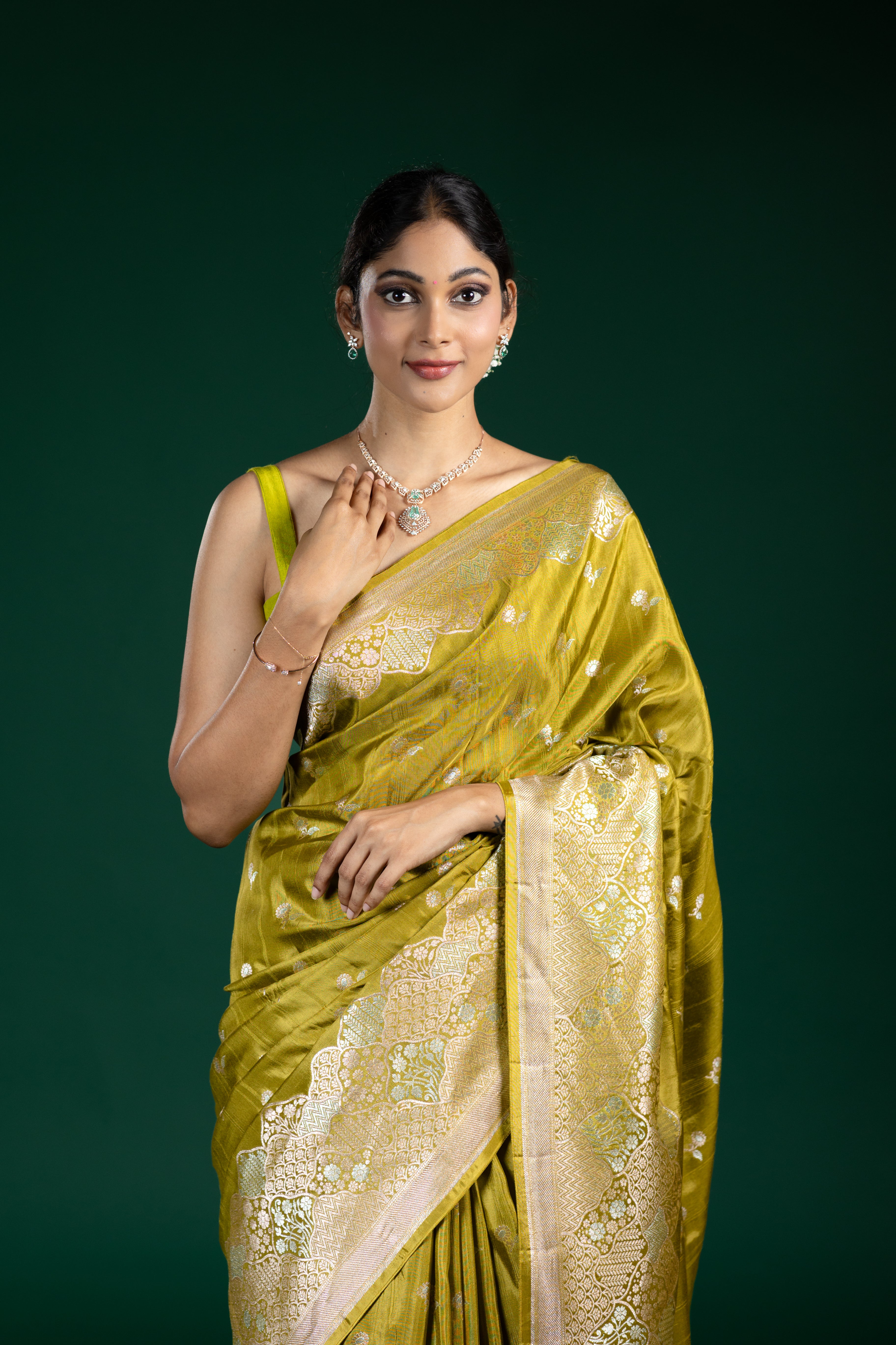 Shop elegant Olive Green Dola Silk Saree with all-over Butti design. Medium self-border, matching blouse, perfect for festive and special occasions.