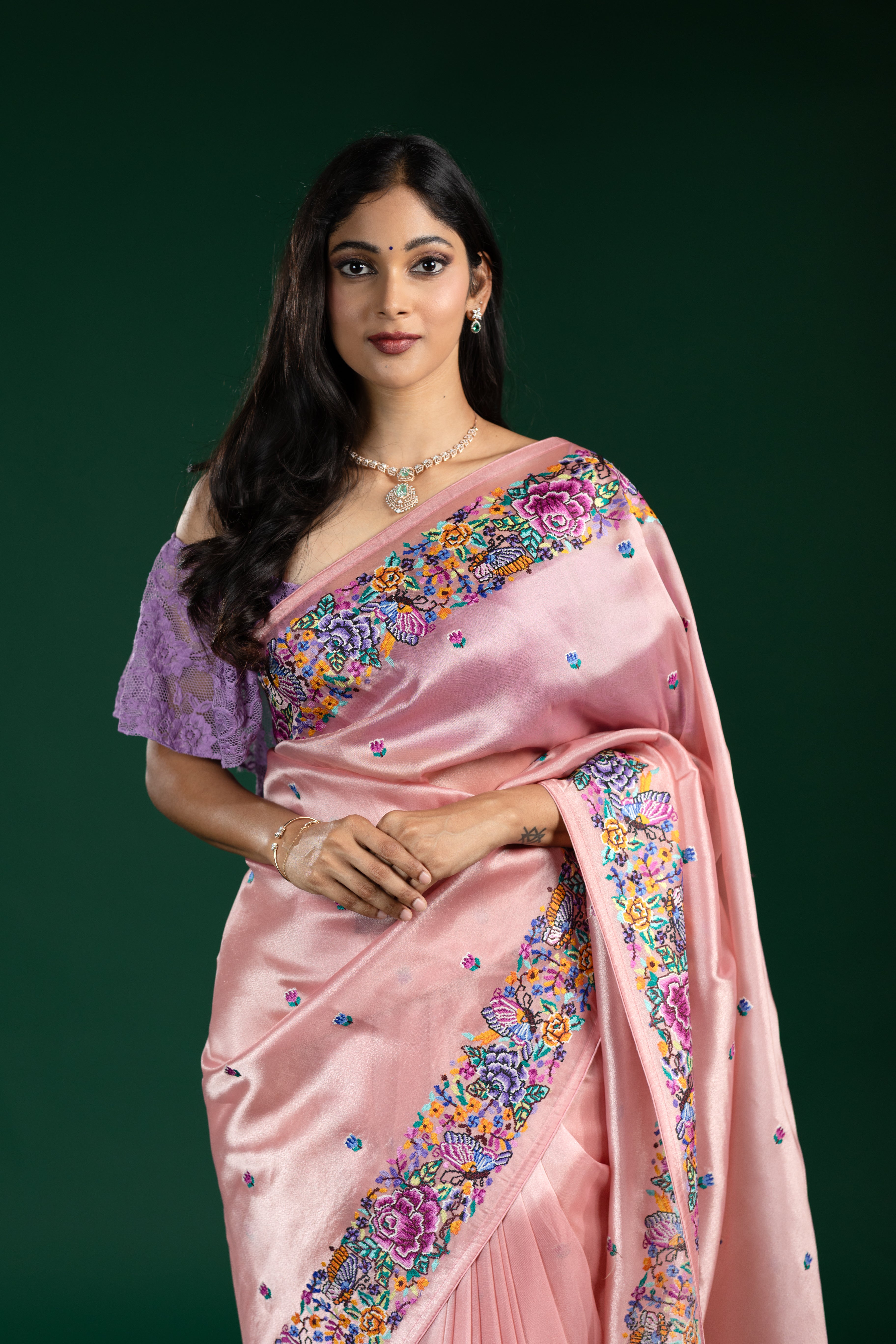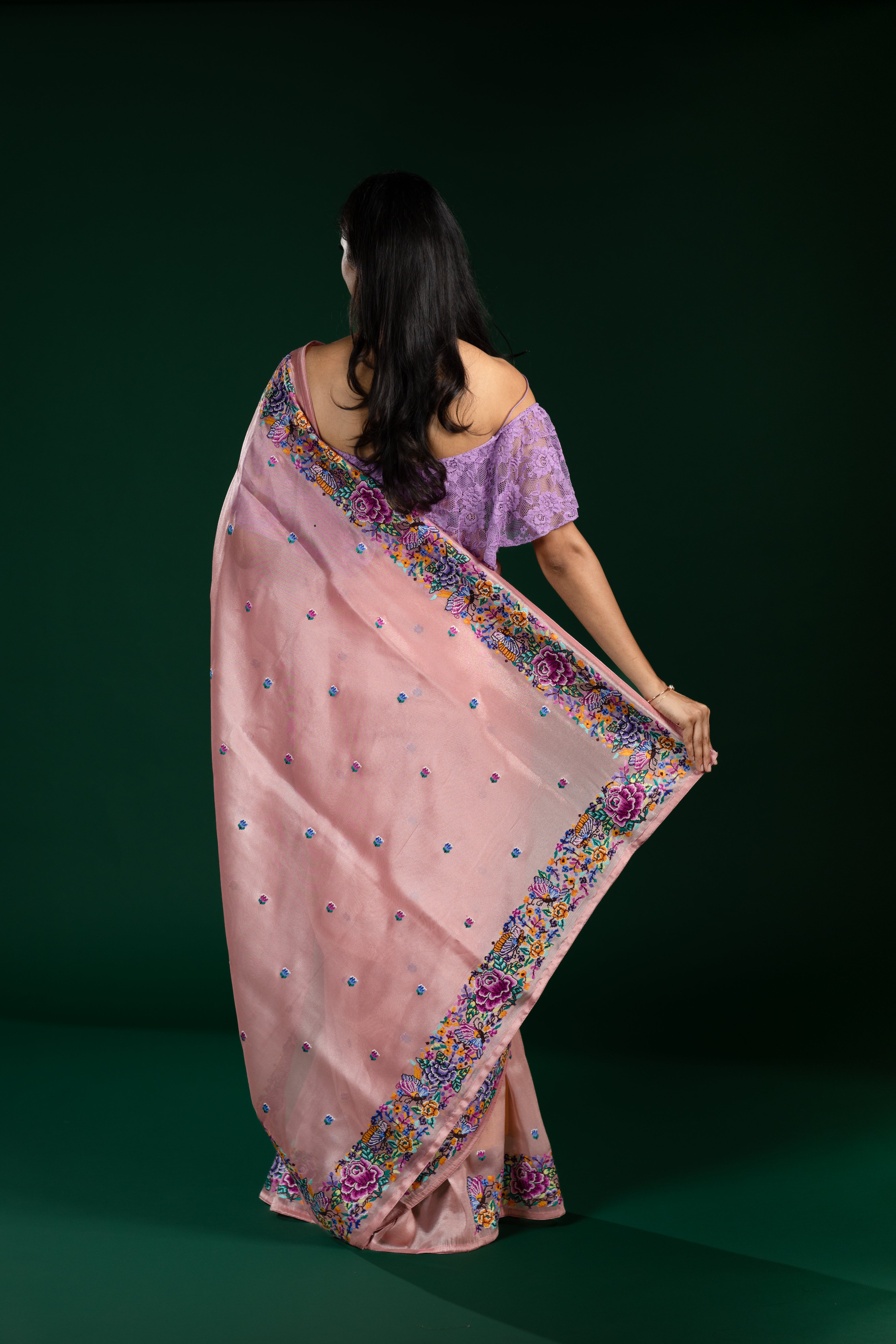 Elegant Pink Tissue Organza Saree with multicolor thread embroidery border and self-blouse. Lightweight, festive wear saree perfect for parties and occasions.