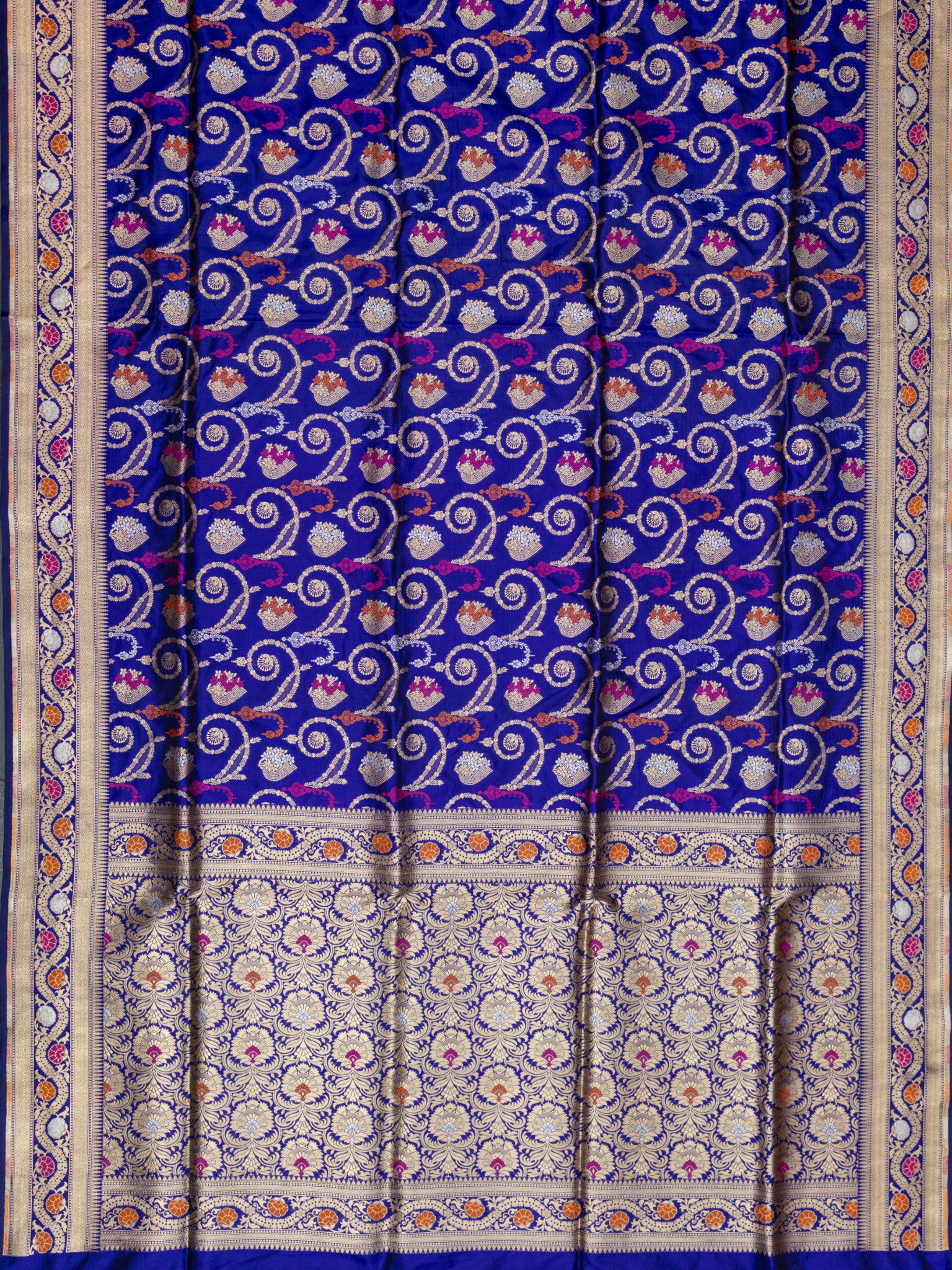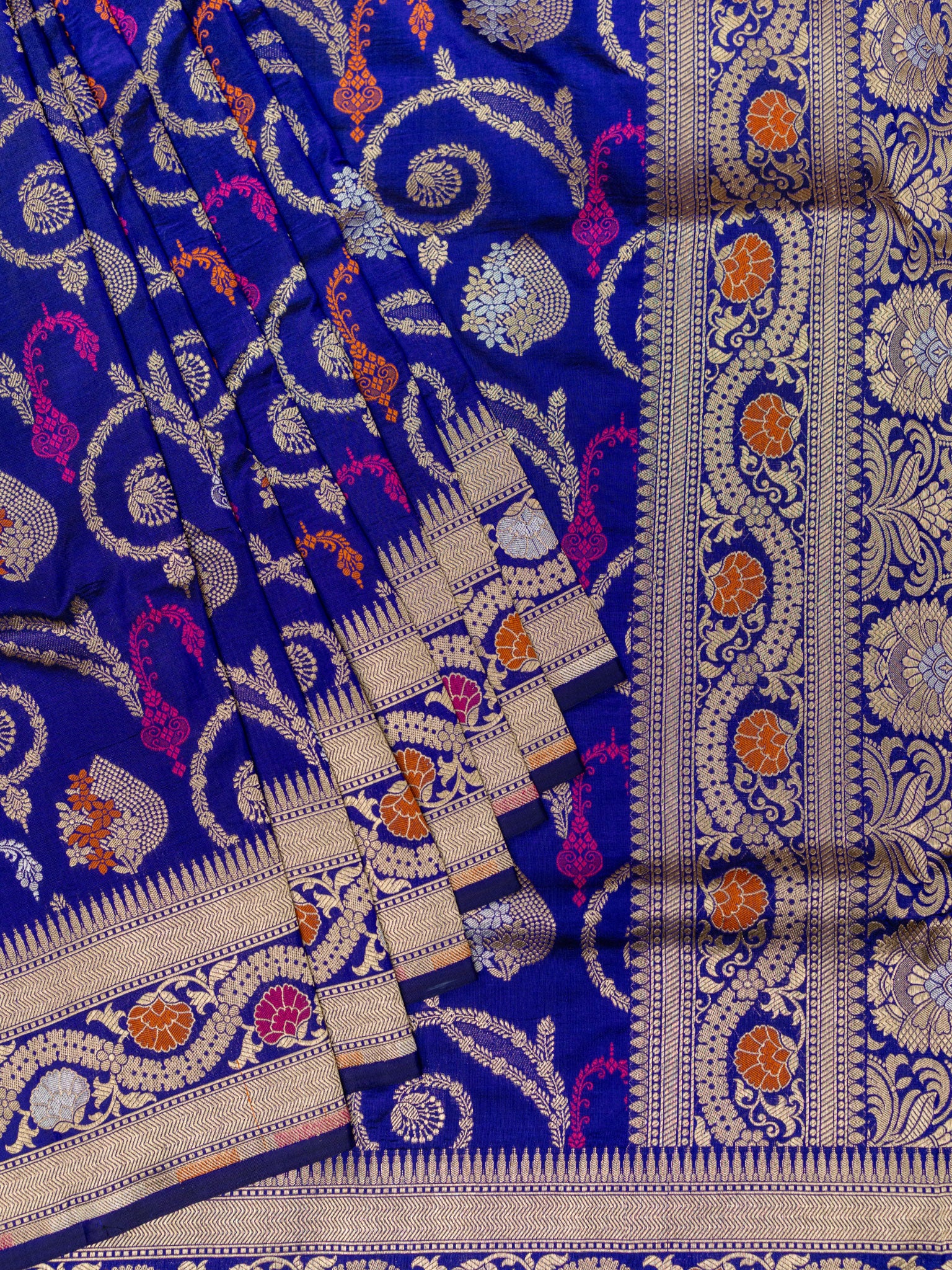 Stunning Purple Banarasi Jaal saree featuring intricate Gold Zari and Self border. Unstitched 5.5 meters of premium silk, perfect for weddings, festive occasions, and traditional celebrations.
