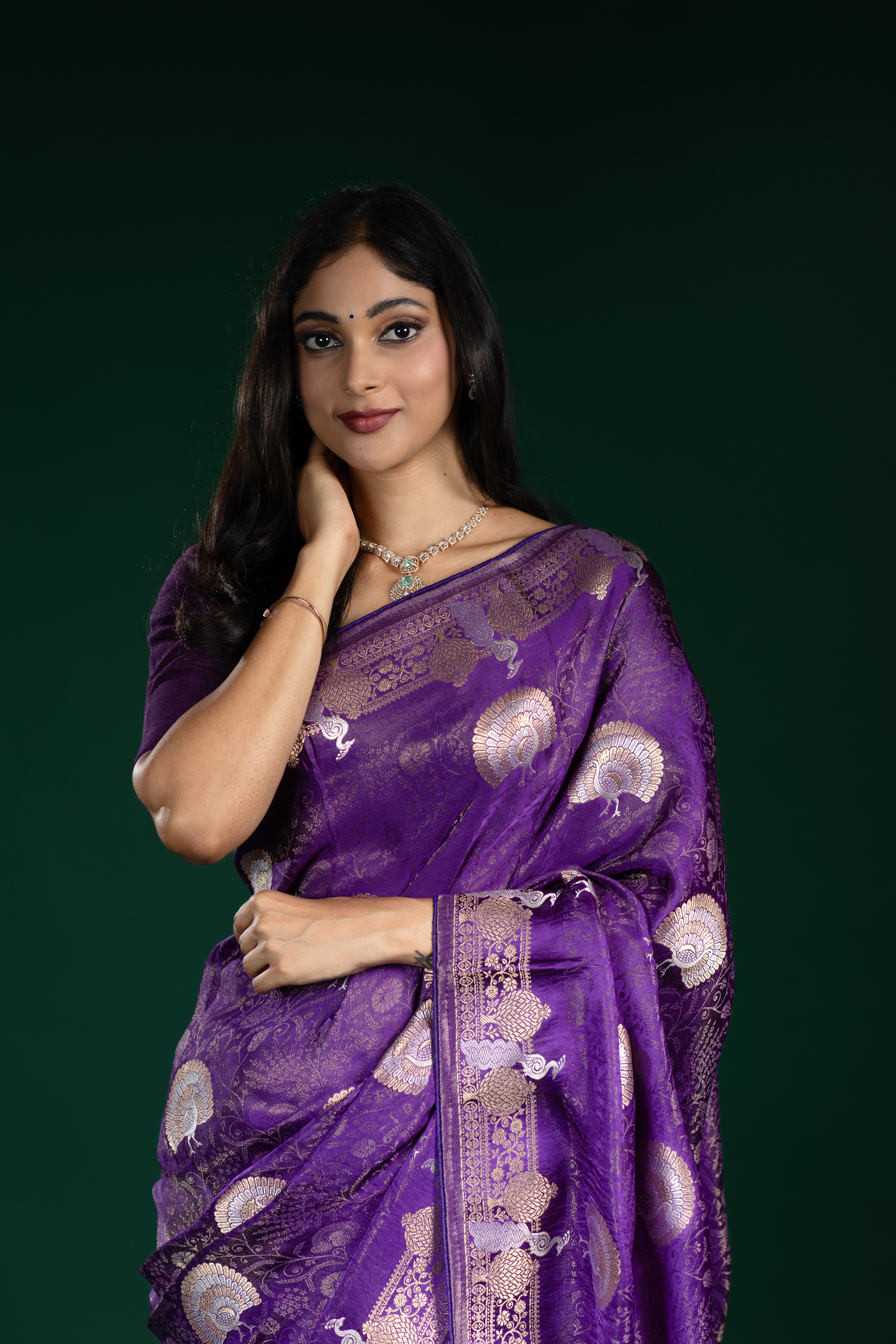Luxurious purple Mashroo silk saree adorned with elegant butti work all over. A perfect blend of traditional charm and modern sophistication for special occasions.