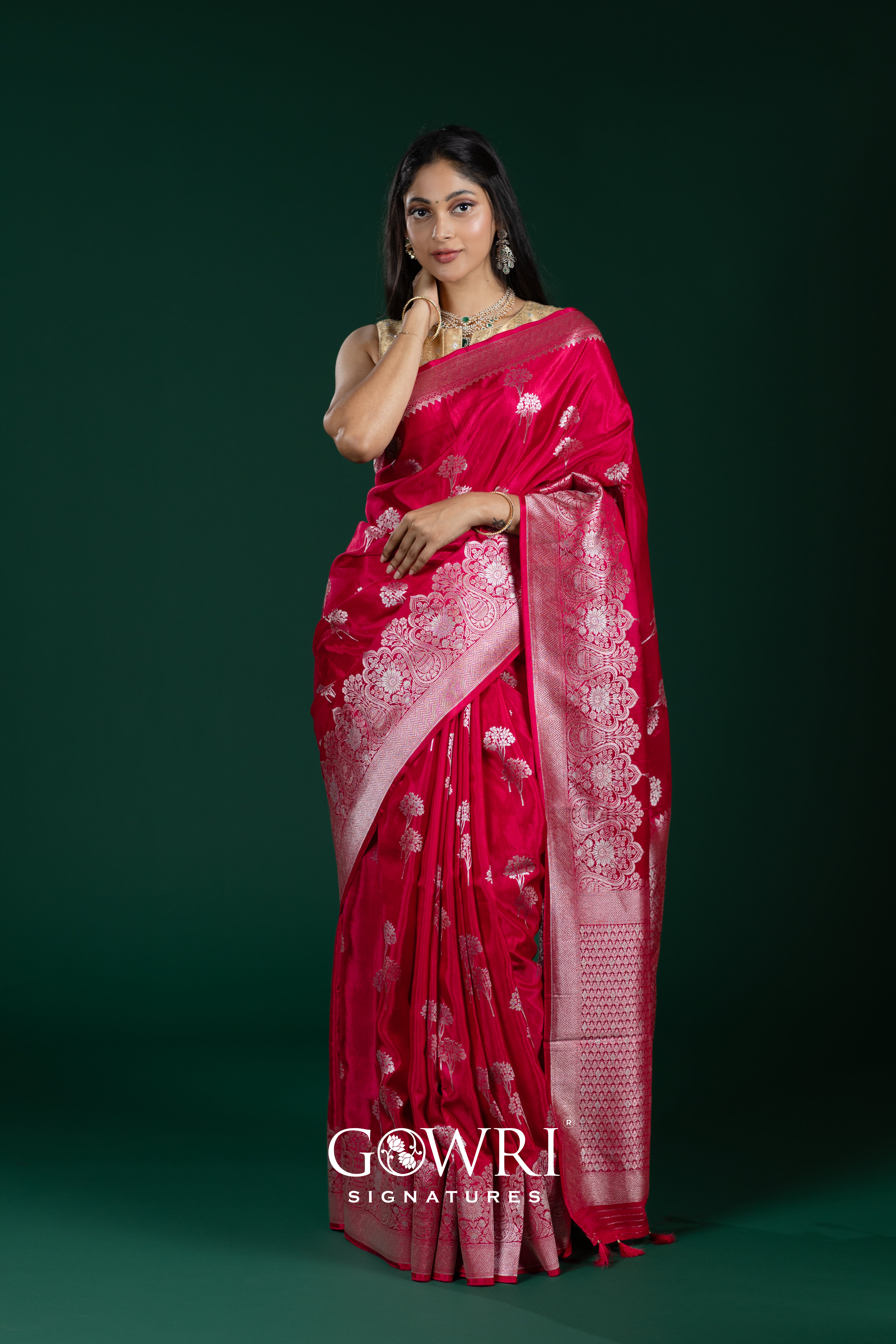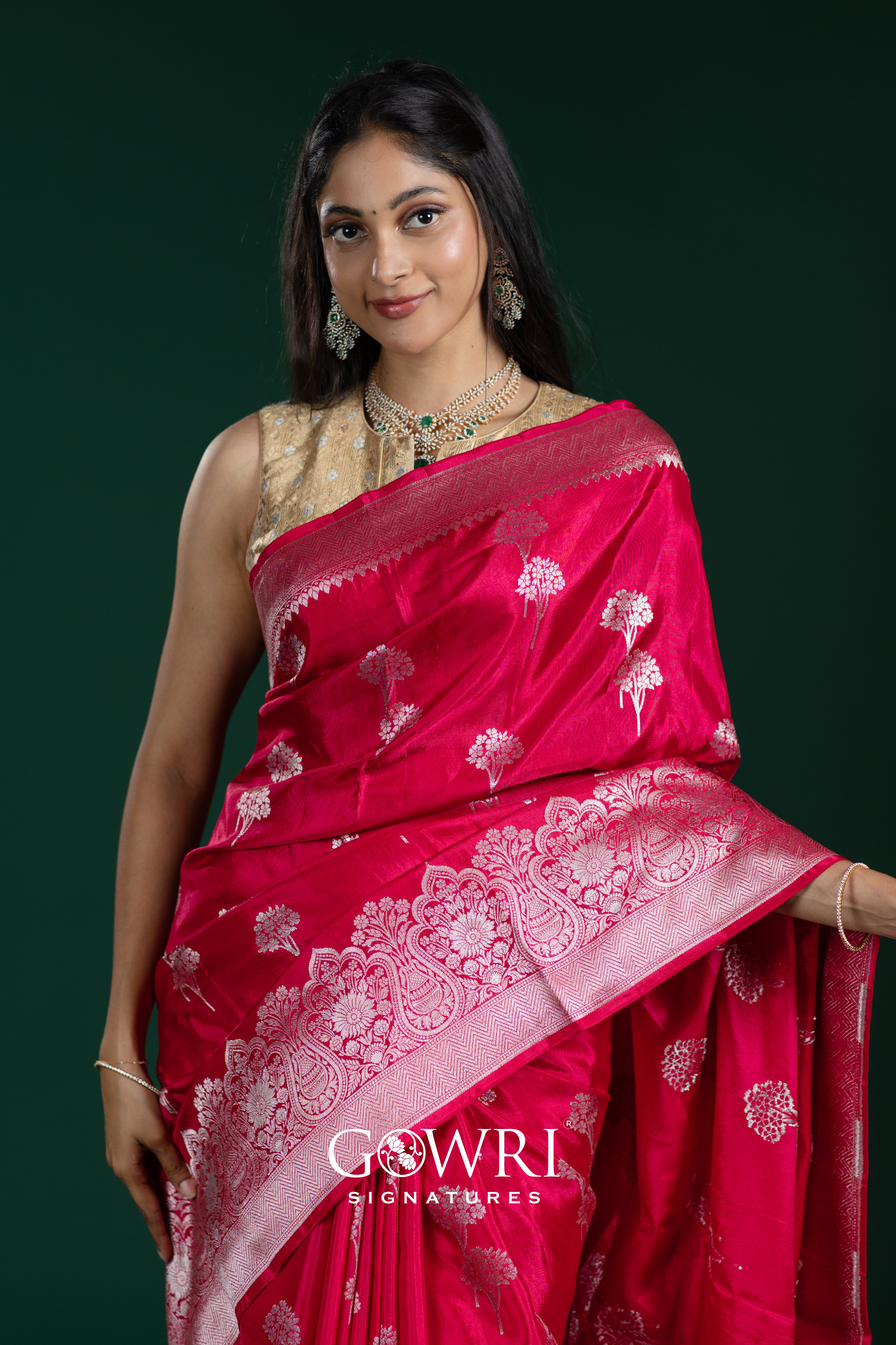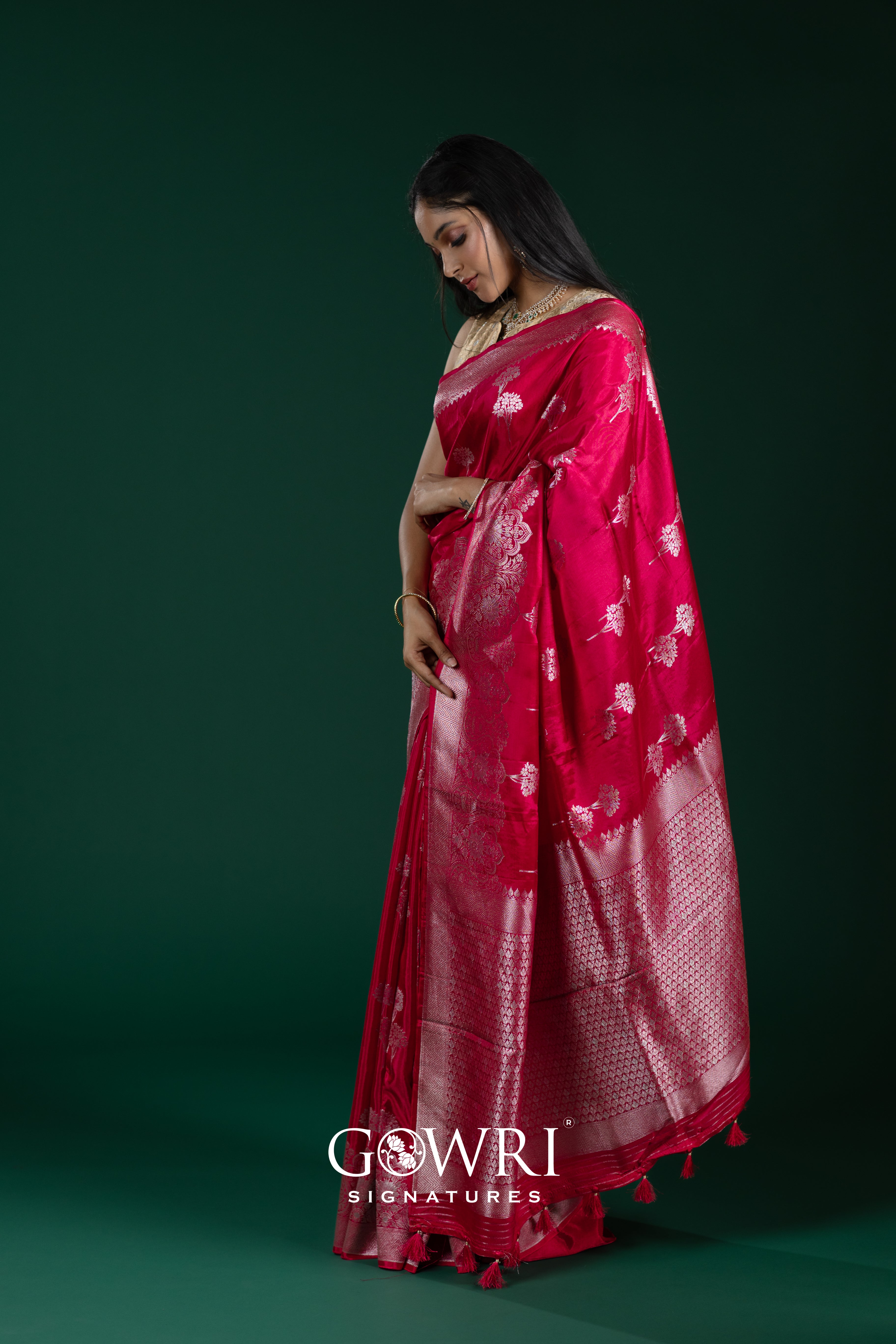 Add charm to your festive wardrobe with this elegant Rani Pink Mashroo Silk Saree. Designed with intricate all-over butti work and finished with a classy designer border, this saree offers a luxurious sheen and soft drape. Perfect for weddings, parties, and special celebrations. Comes with a matching unstitched blouse piece.