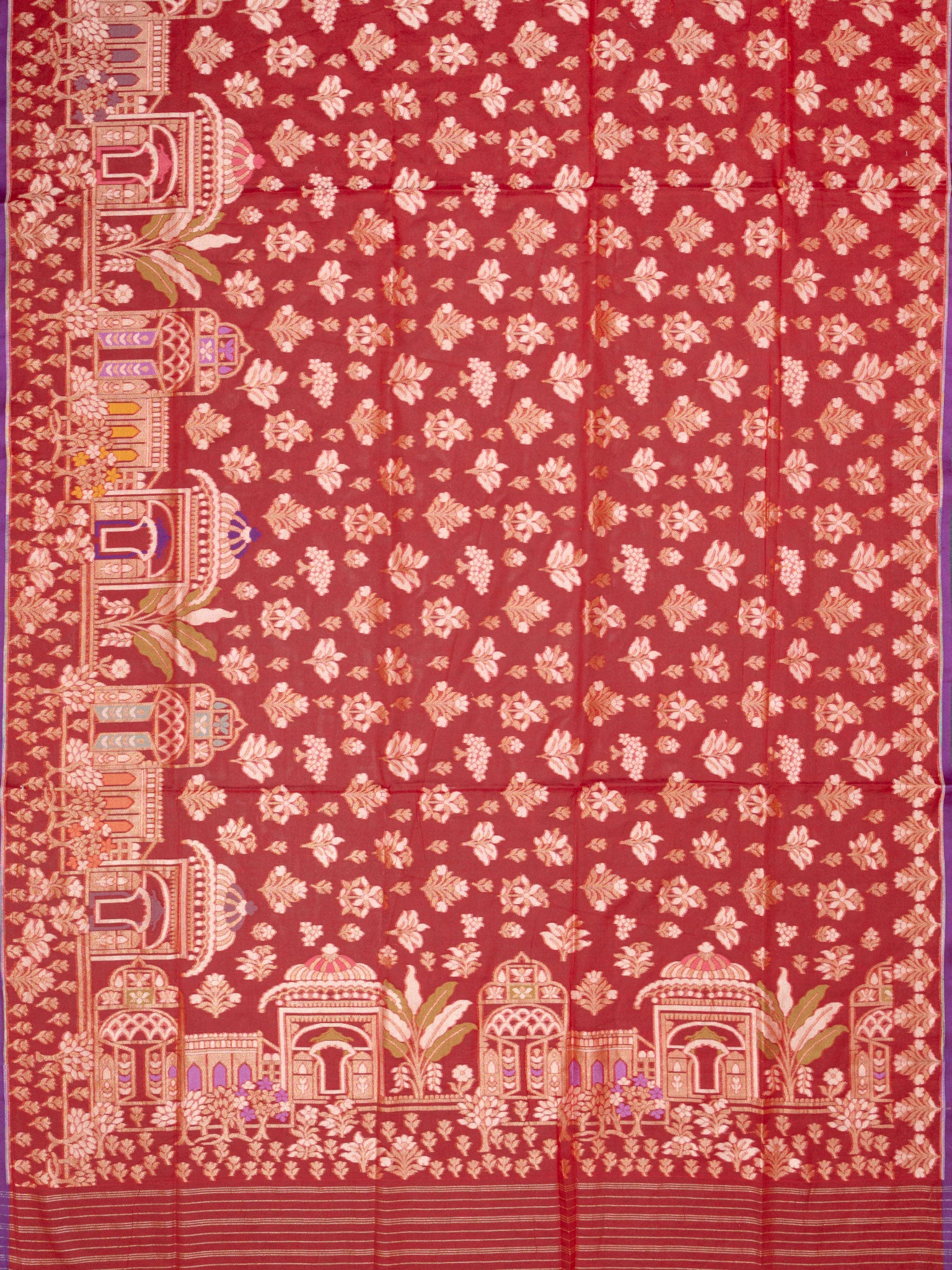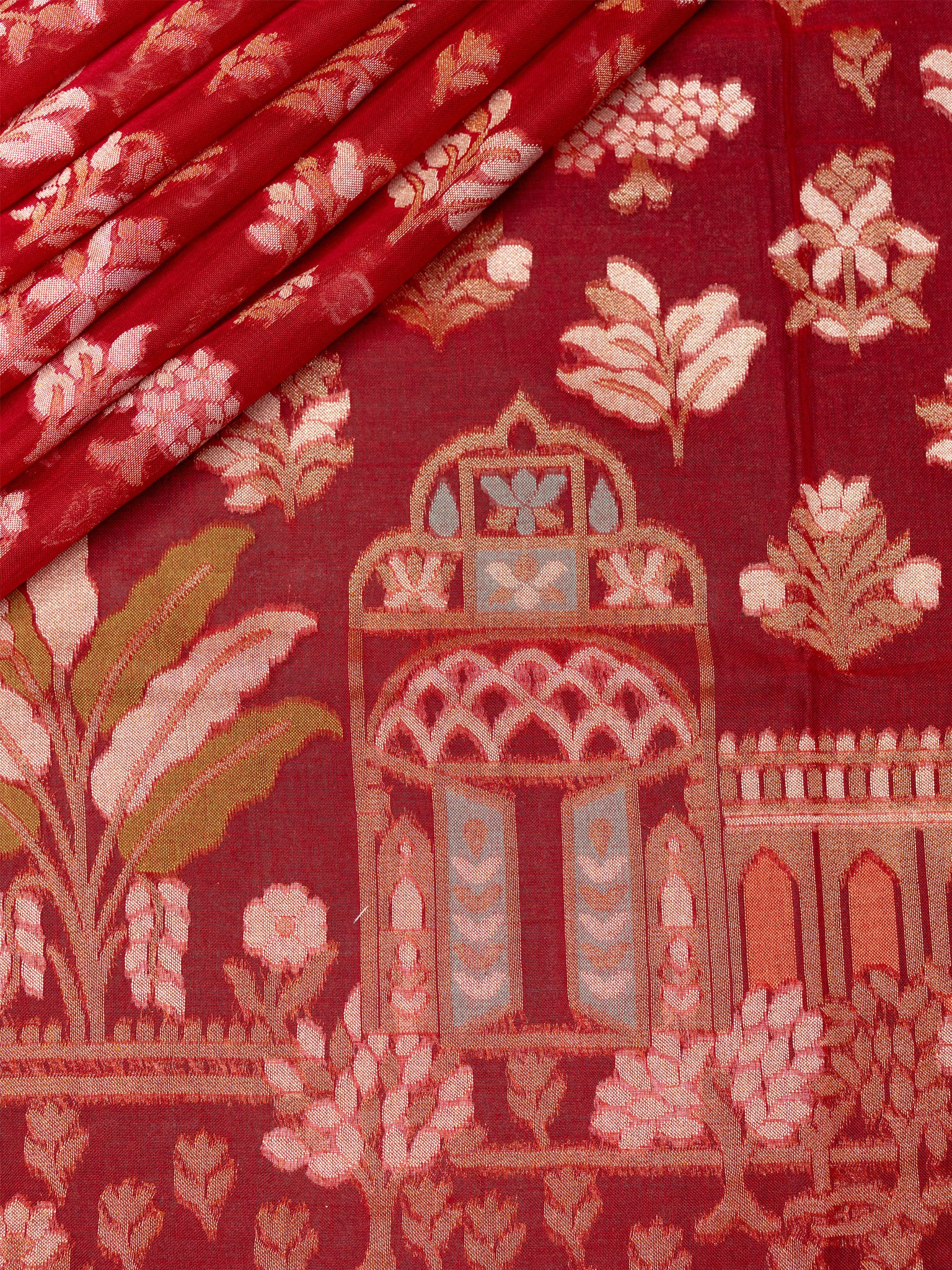 Rich Red Banarasi Butta saree adorned with intricate Gold Zari and Self border. Unstitched 5.5 meters of premium silk, perfect for weddings, festive occasions, and traditional celebrations.