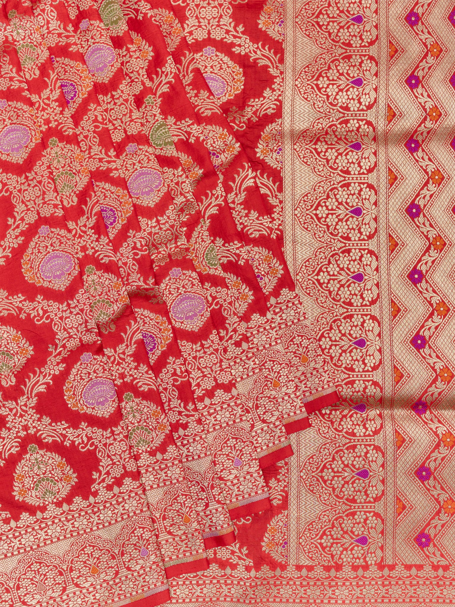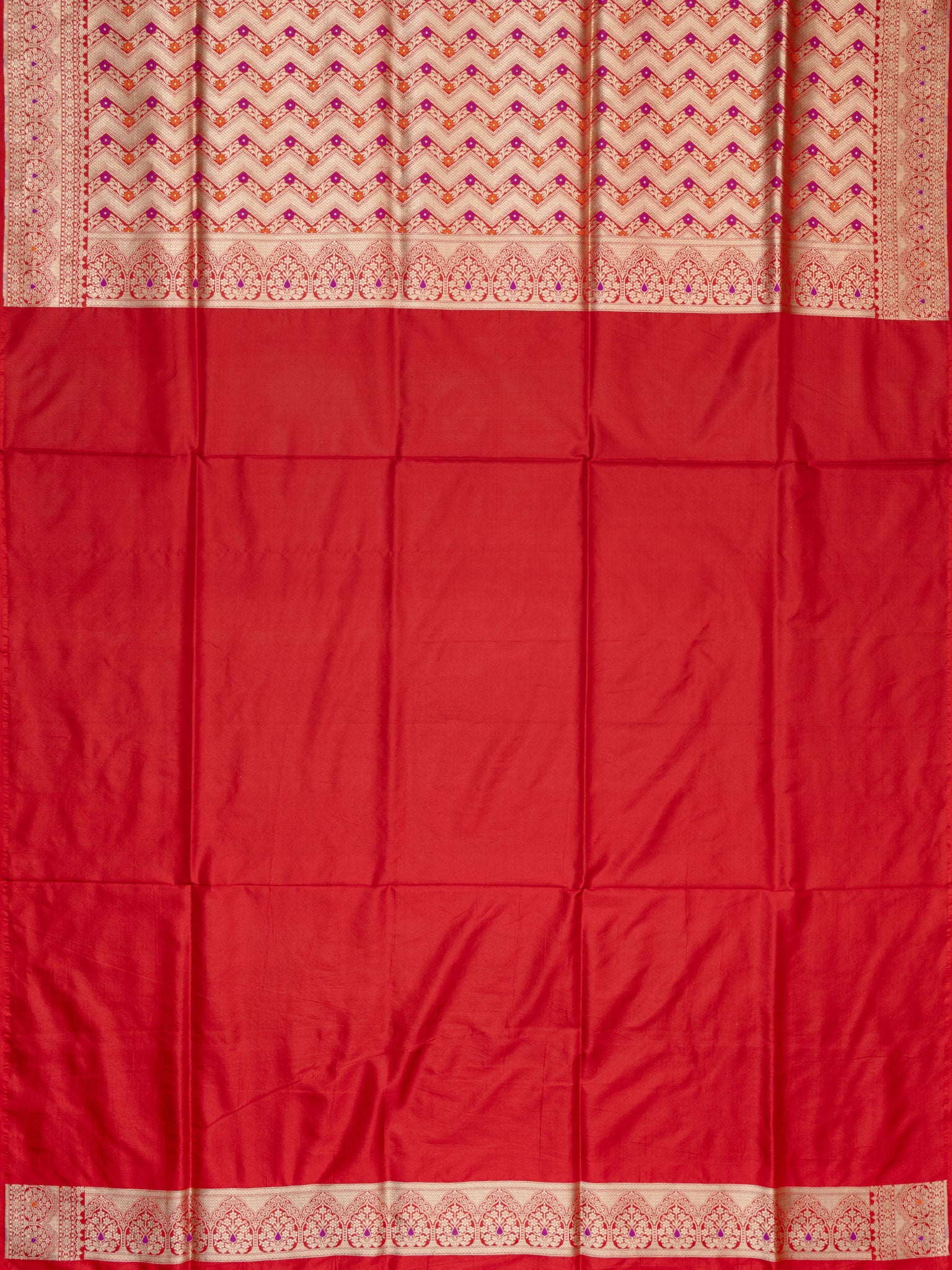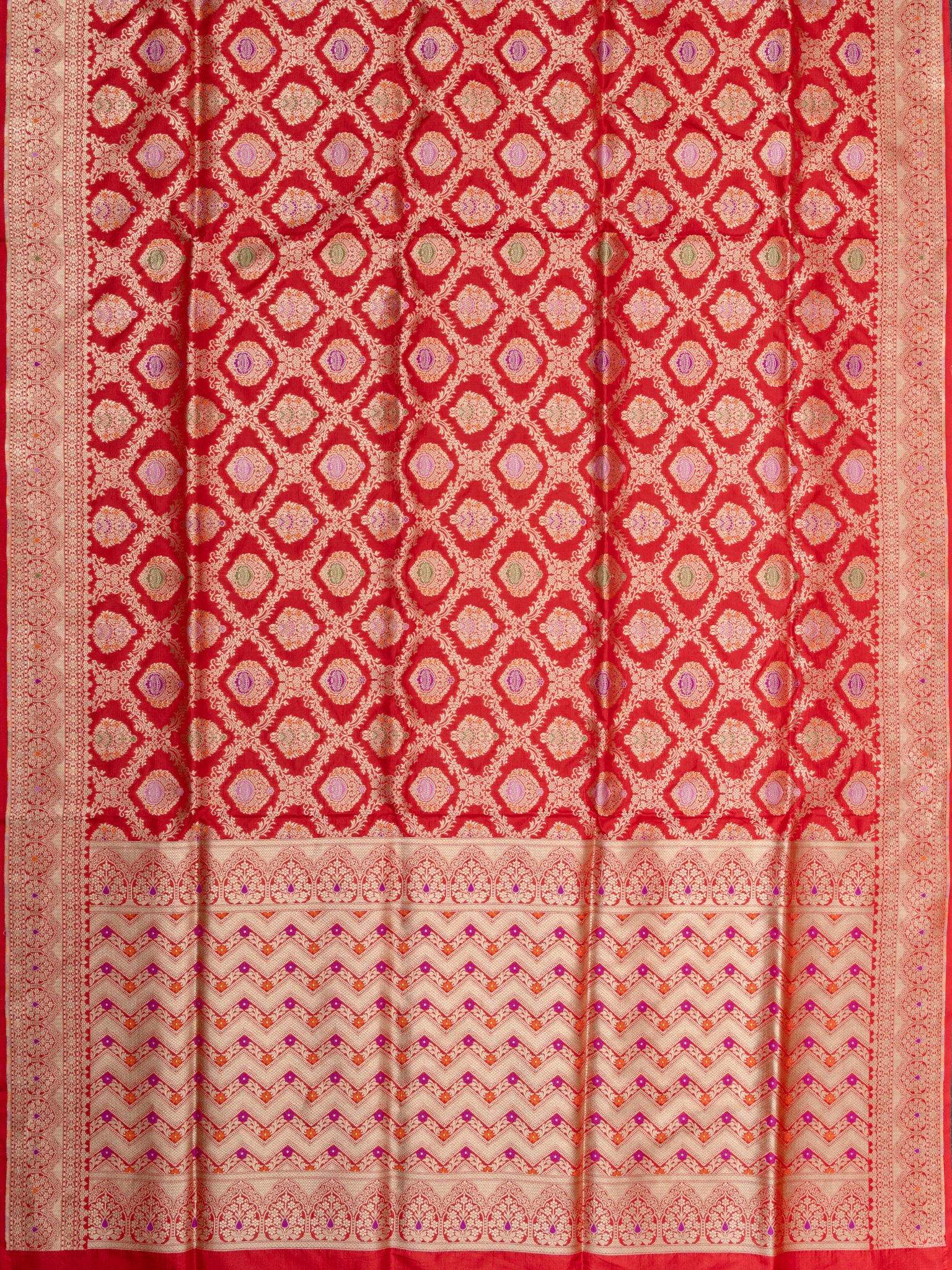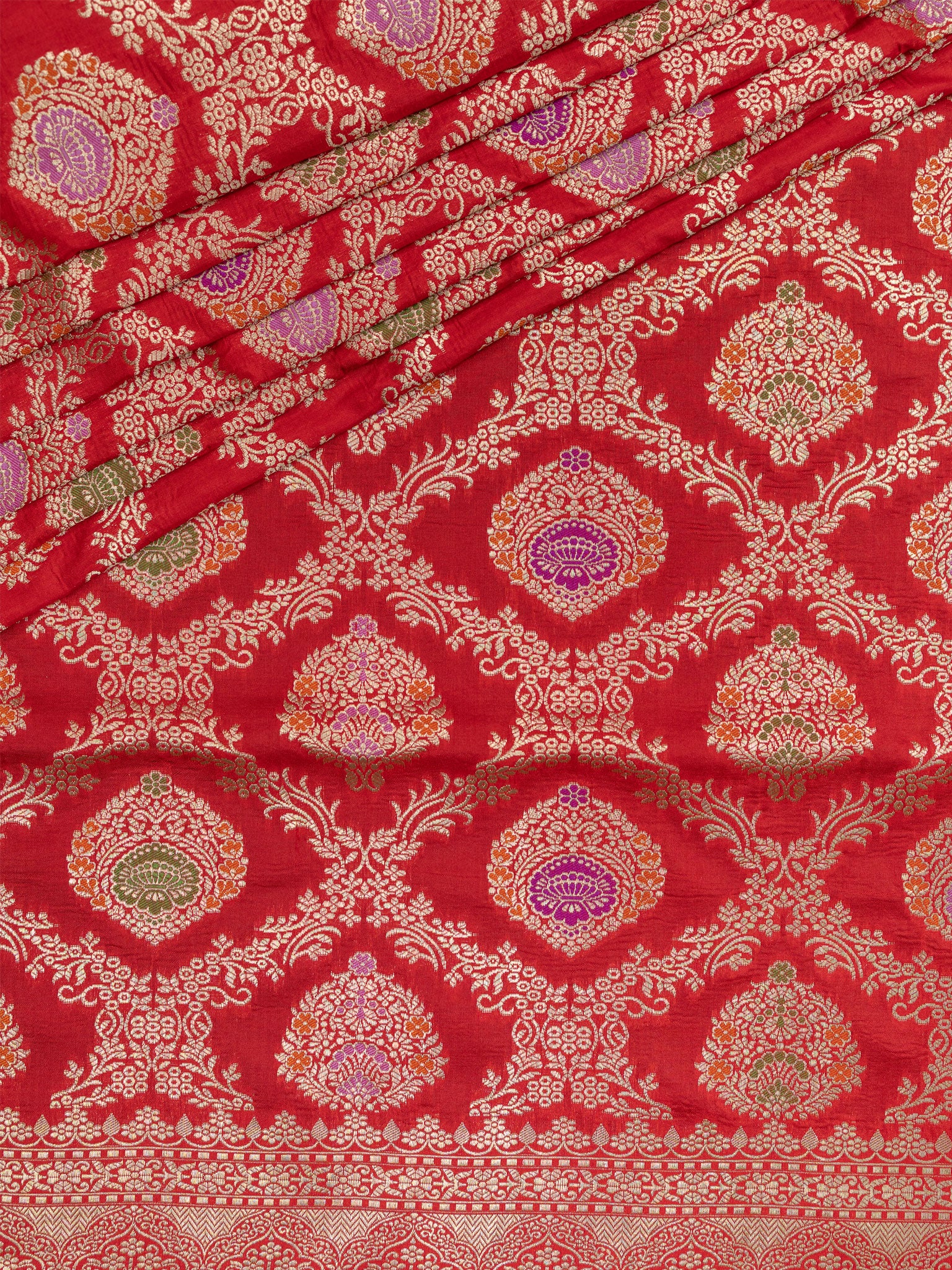 Vibrant Red Banarasi Jaal saree featuring intricate Gold Zari and Self border. Unstitched 5.5 meters of premium silk, perfect for weddings, festive occasions, and traditional celebrations.
