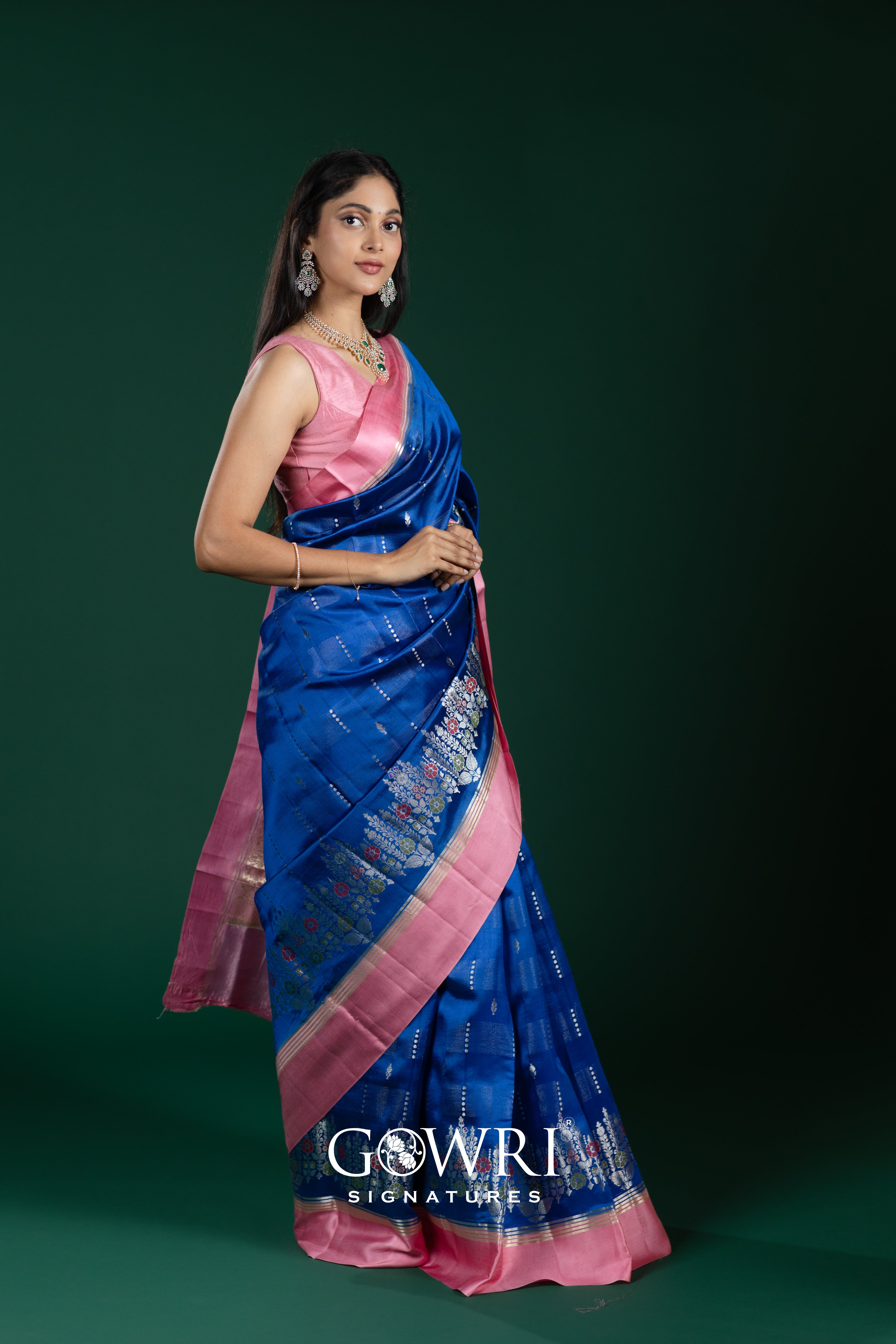 Make a statement at every celebration with this elegant Royal Blue & Bubblegum Pink Chiniya Silk Saree, crafted from luxurious Chiniya silk known for its smooth, rich texture. The saree features an all-over designer weave with delicate butti work, giving it a regal and festive look.