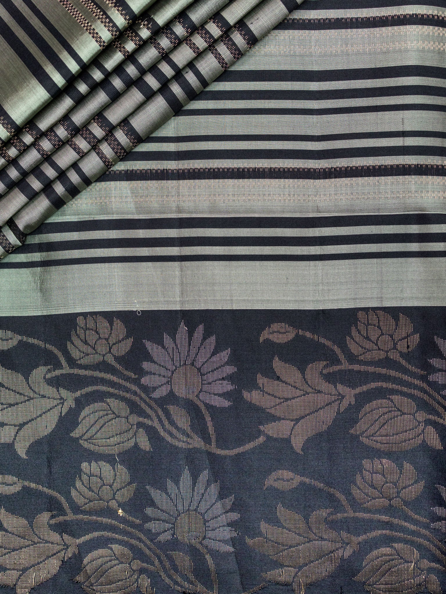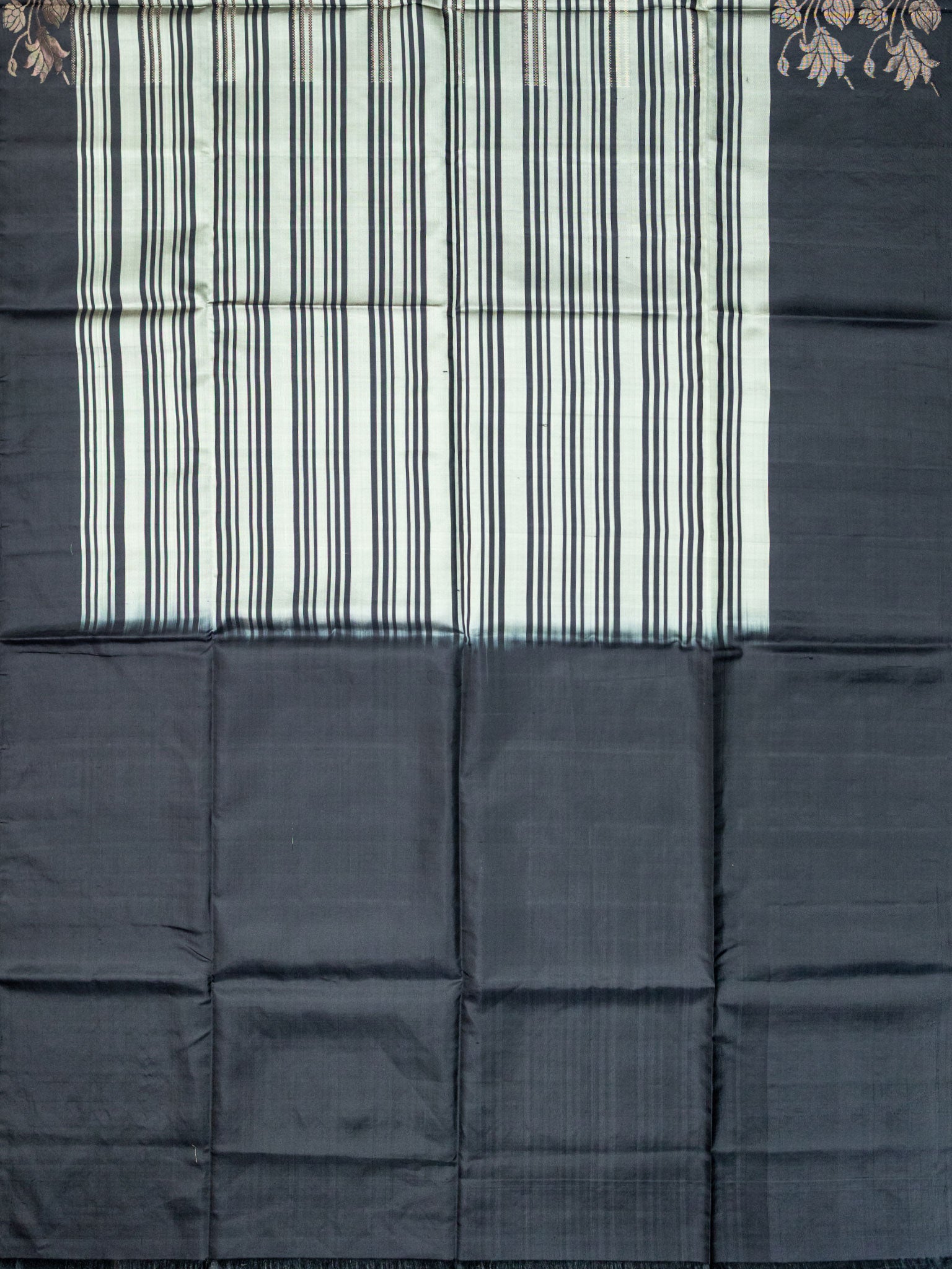 Ash Soft Silk Tripura Pattu saree with Black accents and Self border. Unstitched, premium quality silk suitable for festive occasions and traditional events.
