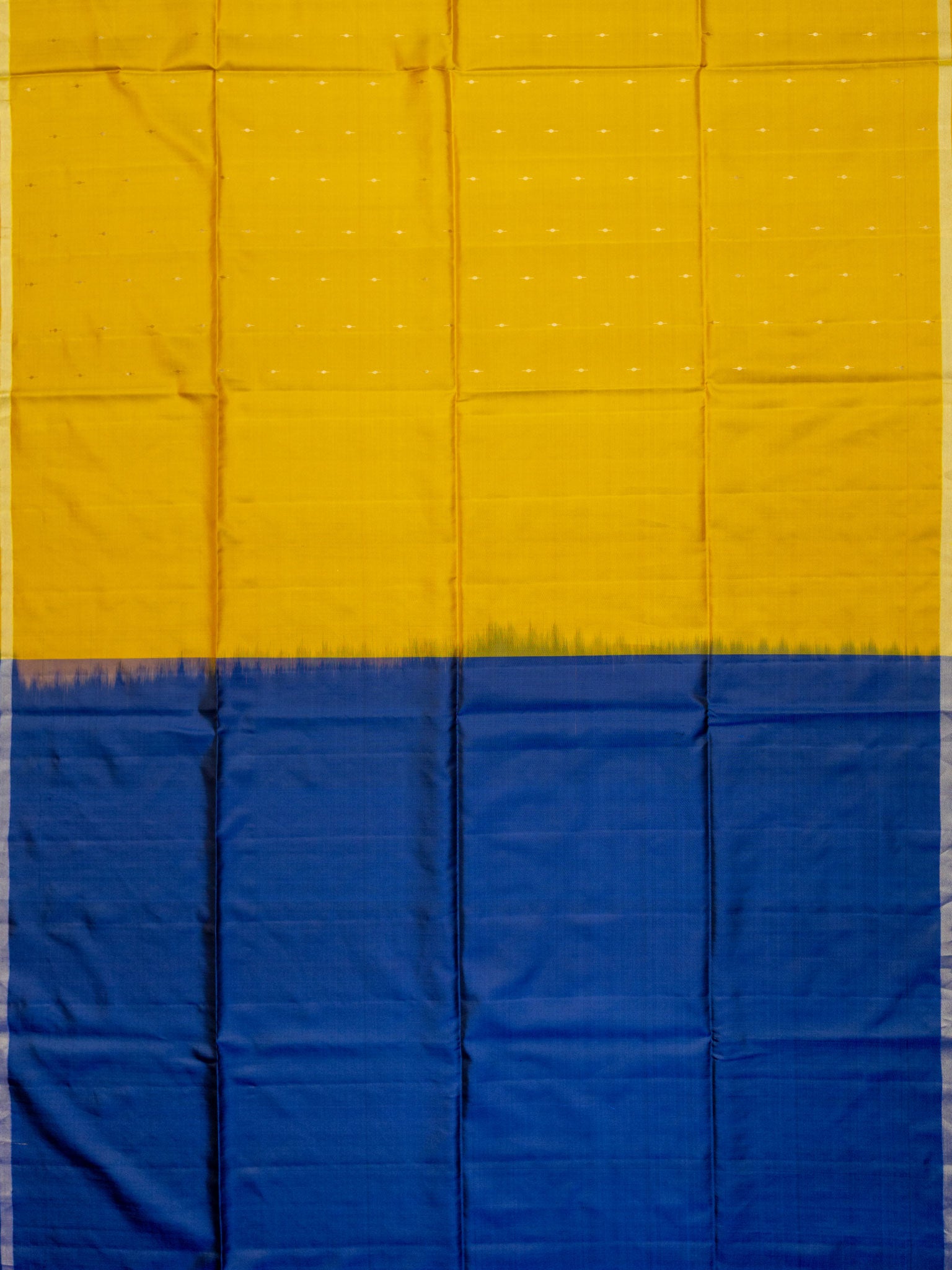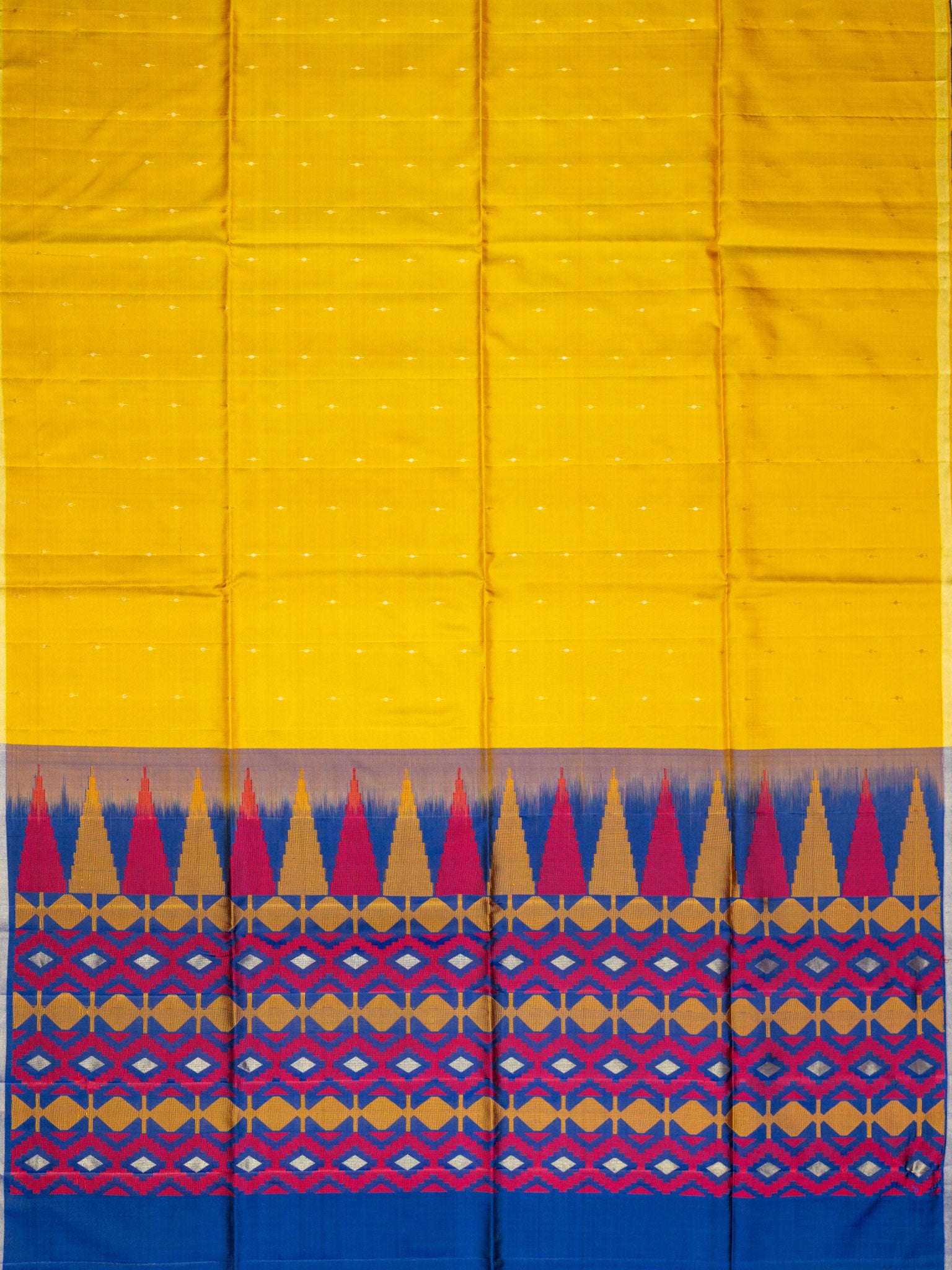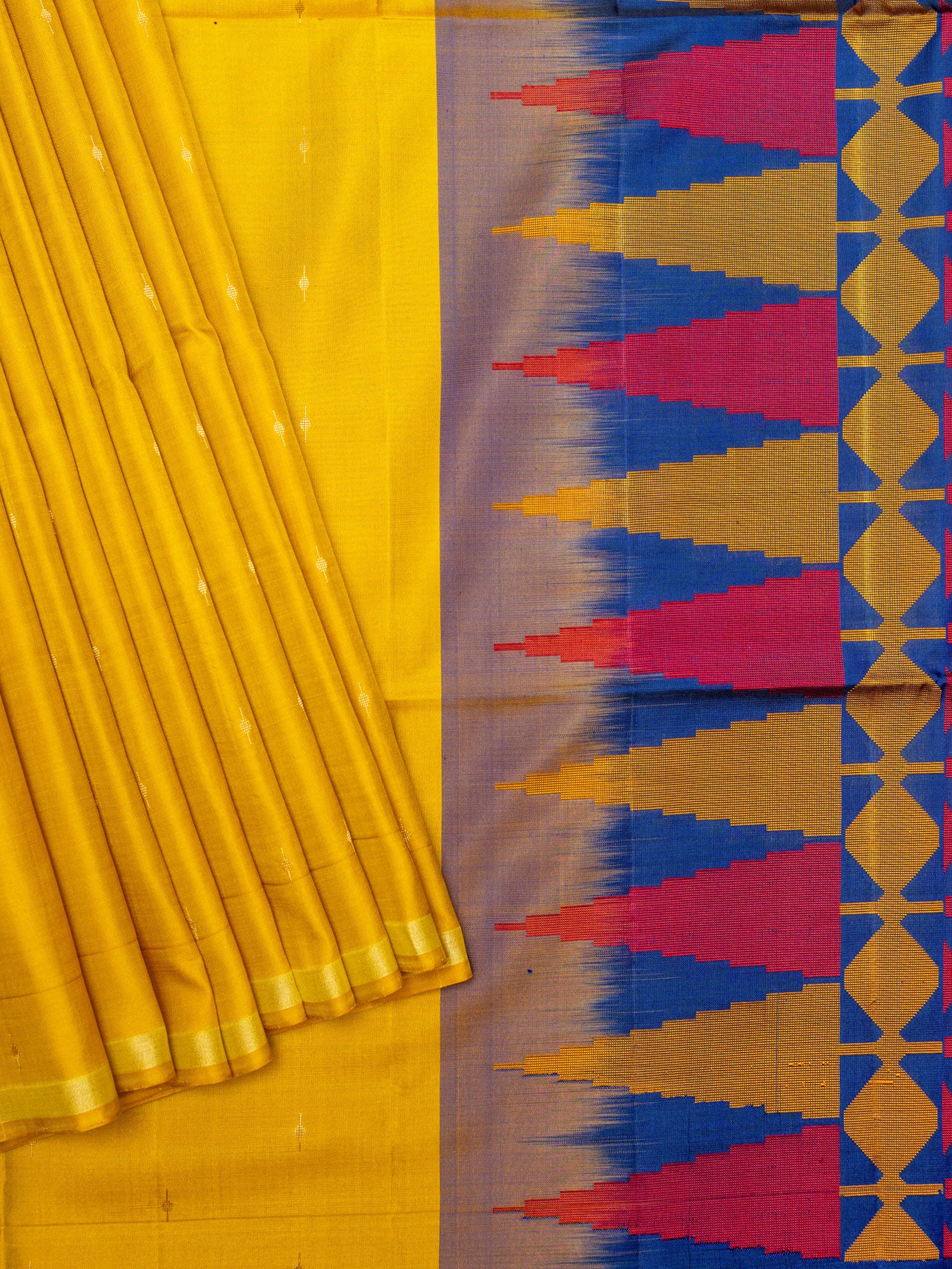 Buy premium Soft Silk Tripura Pattu saree in Mustard with Navy Blue contrast. Unstitched, perfect for festivals, weddings & traditional occasions.