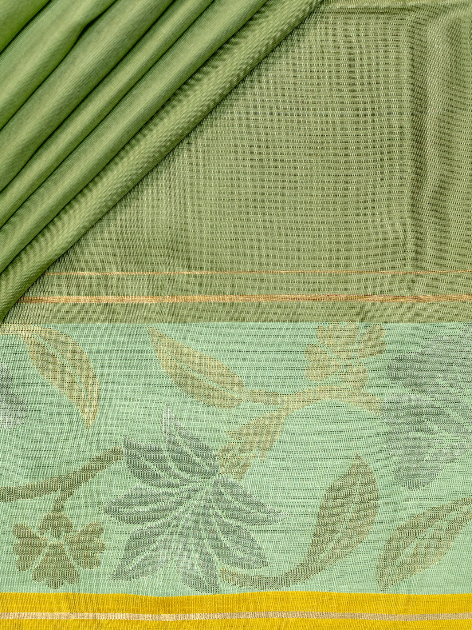 Pista Green Soft Silk Tripura Pattu saree with Self border. Unstitched, premium quality silk suitable for festive occasions, traditional events, and celebrations.