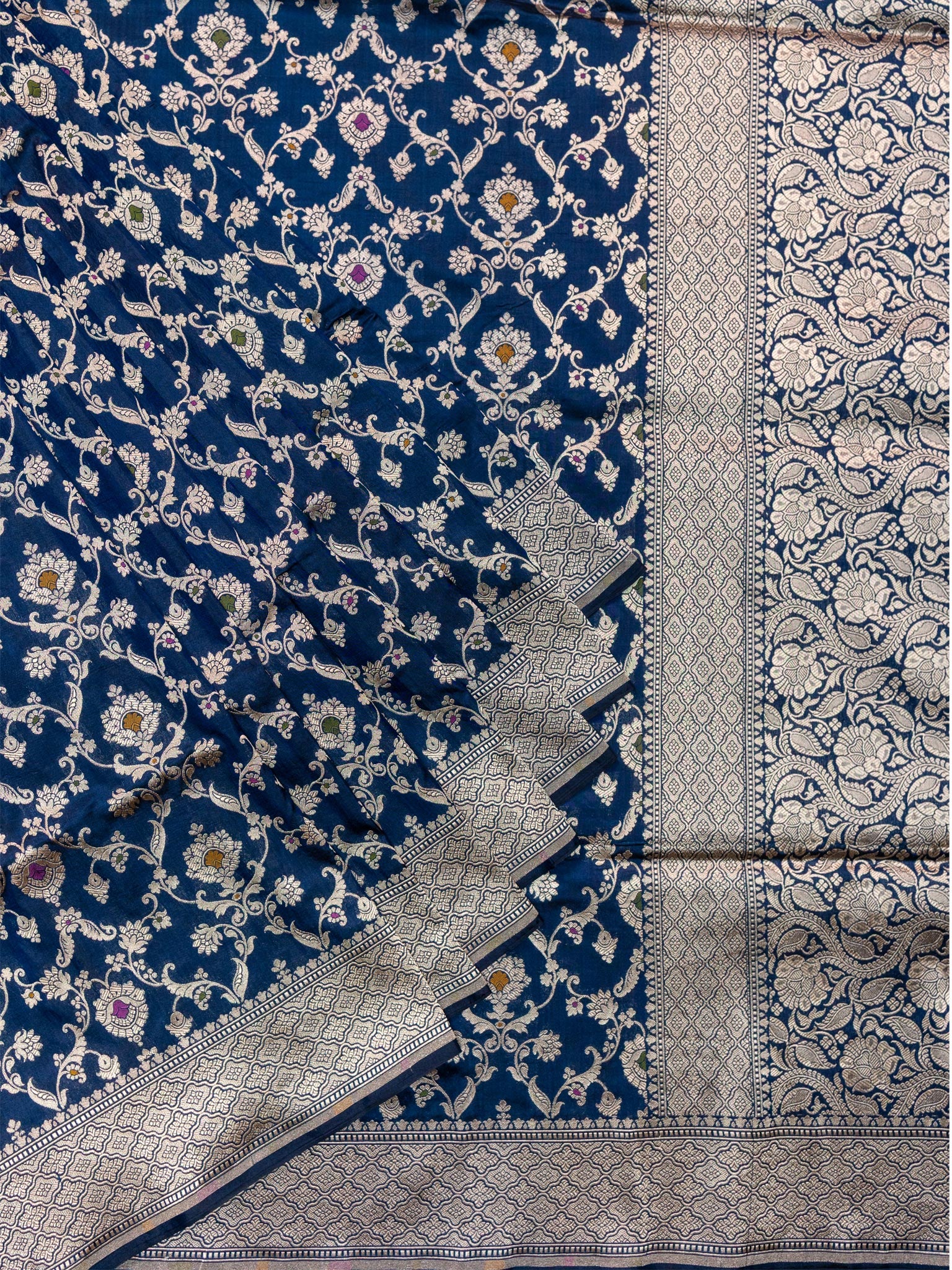 Experience the timeless elegance of the Weaves Banarasi Banarasi Jaal in Navy Blue. This exquisite fabric showcases intricate jaal patterns that reflect masterful craftsmanship, perfect for making a sophisticated statement at any occasion. Its rich navy hue adds depth and versatility, allowing you to pair it effortlessly with your favorite accessories. Elevate your wardrobe with this luxurious Banarasi weave that blends tradition with style.