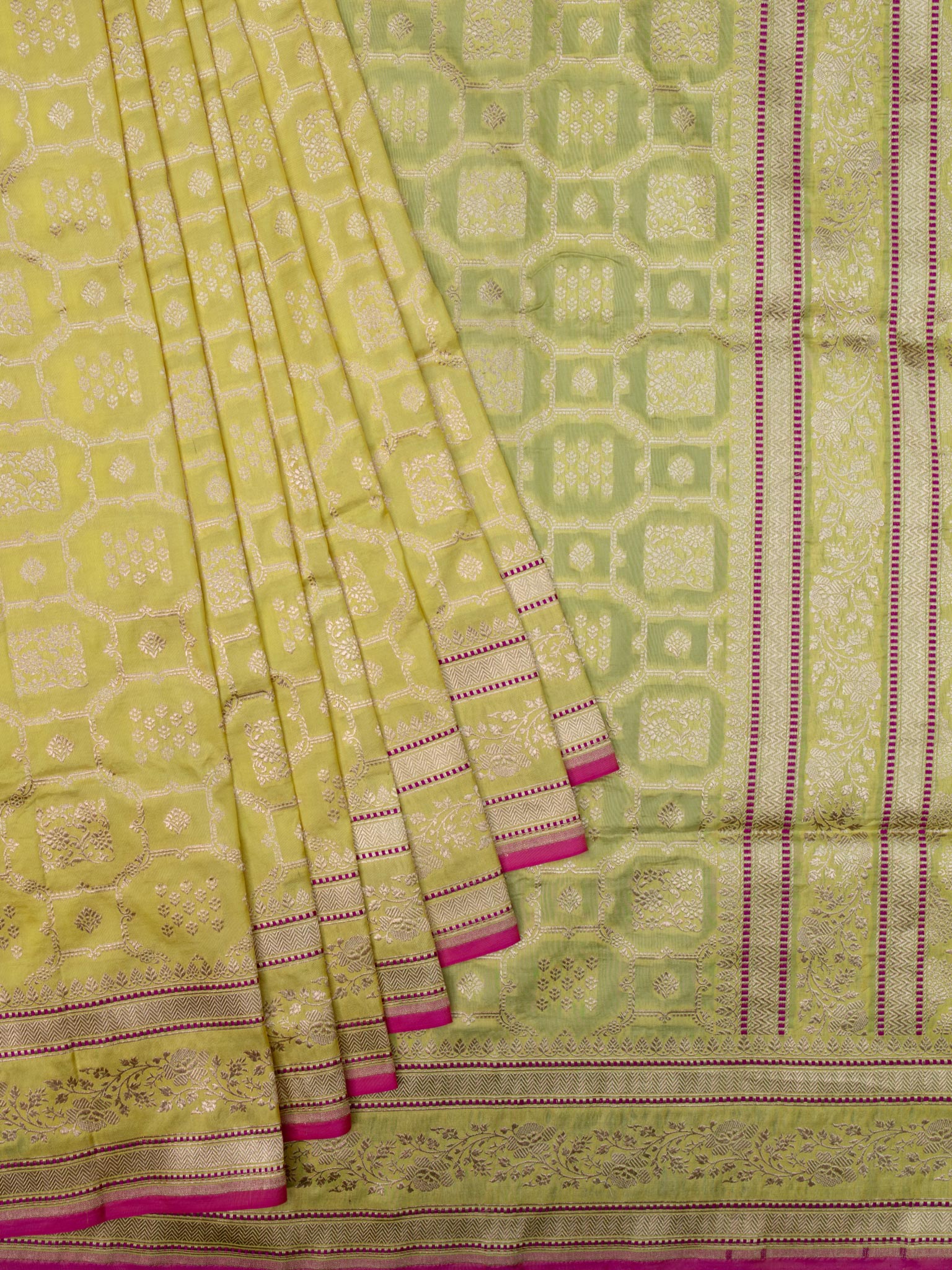 Experience the timeless elegance of the Weaves Banarasi Banarasi Jaal with Edging in vibrant yellow and pink. This exquisite fabric showcases intricate Banarasi craftsmanship, blending traditional artistry with bold colors to elevate your style. Perfect for special occasions, its rich texture and detailed weaving promise a luxurious feel and standout look. Add a touch of heritage and sophistication to your wardrobe with this stunning piece.