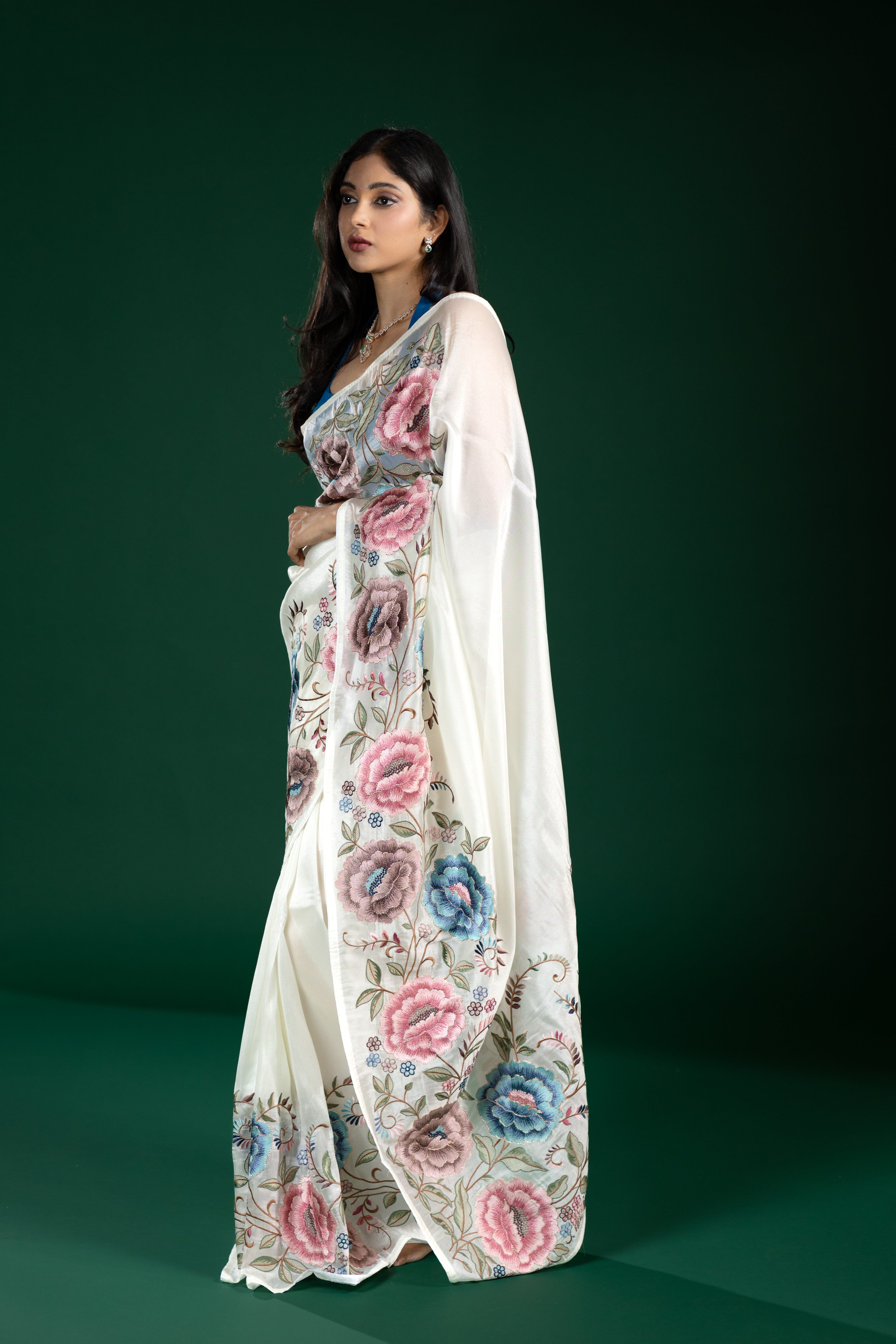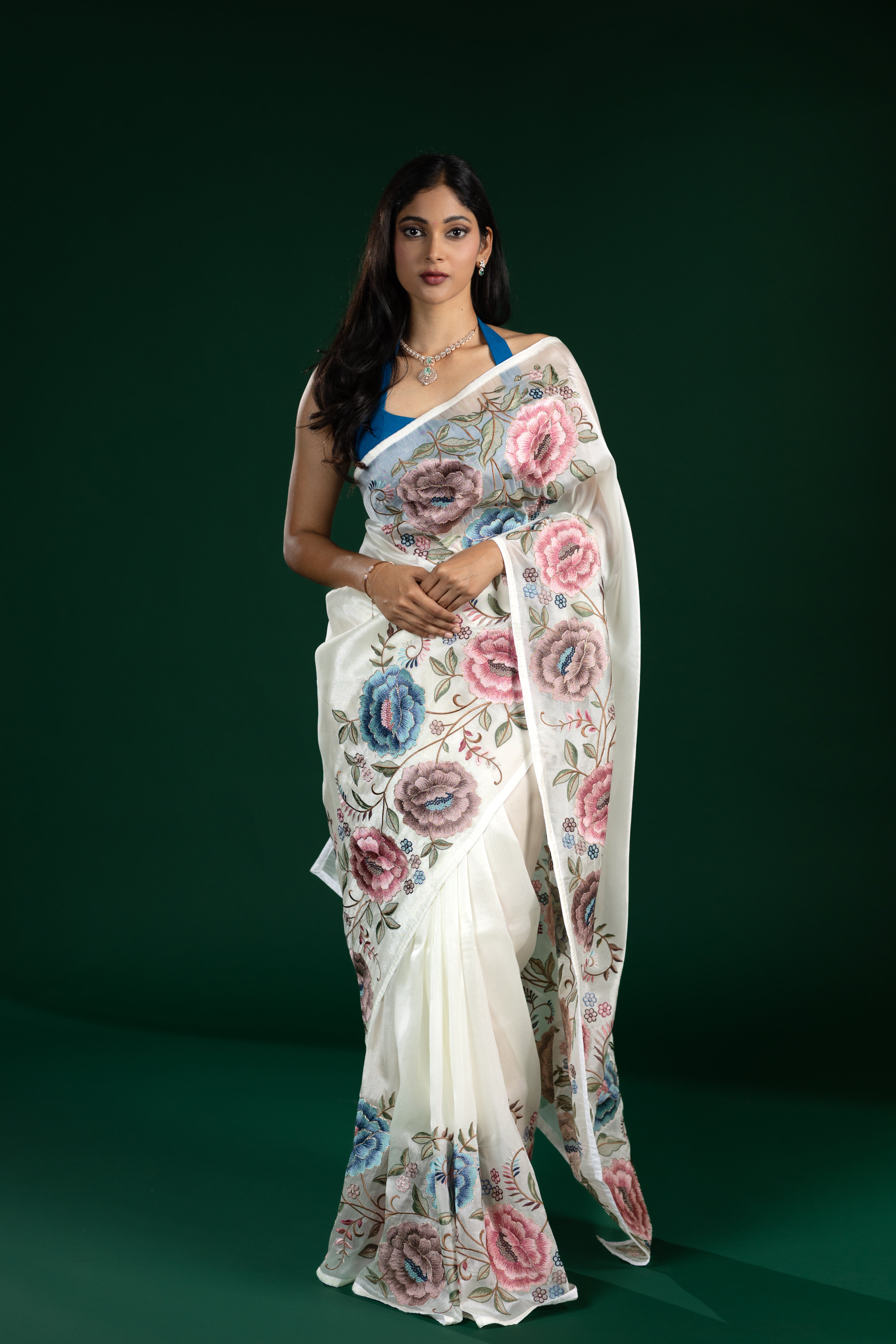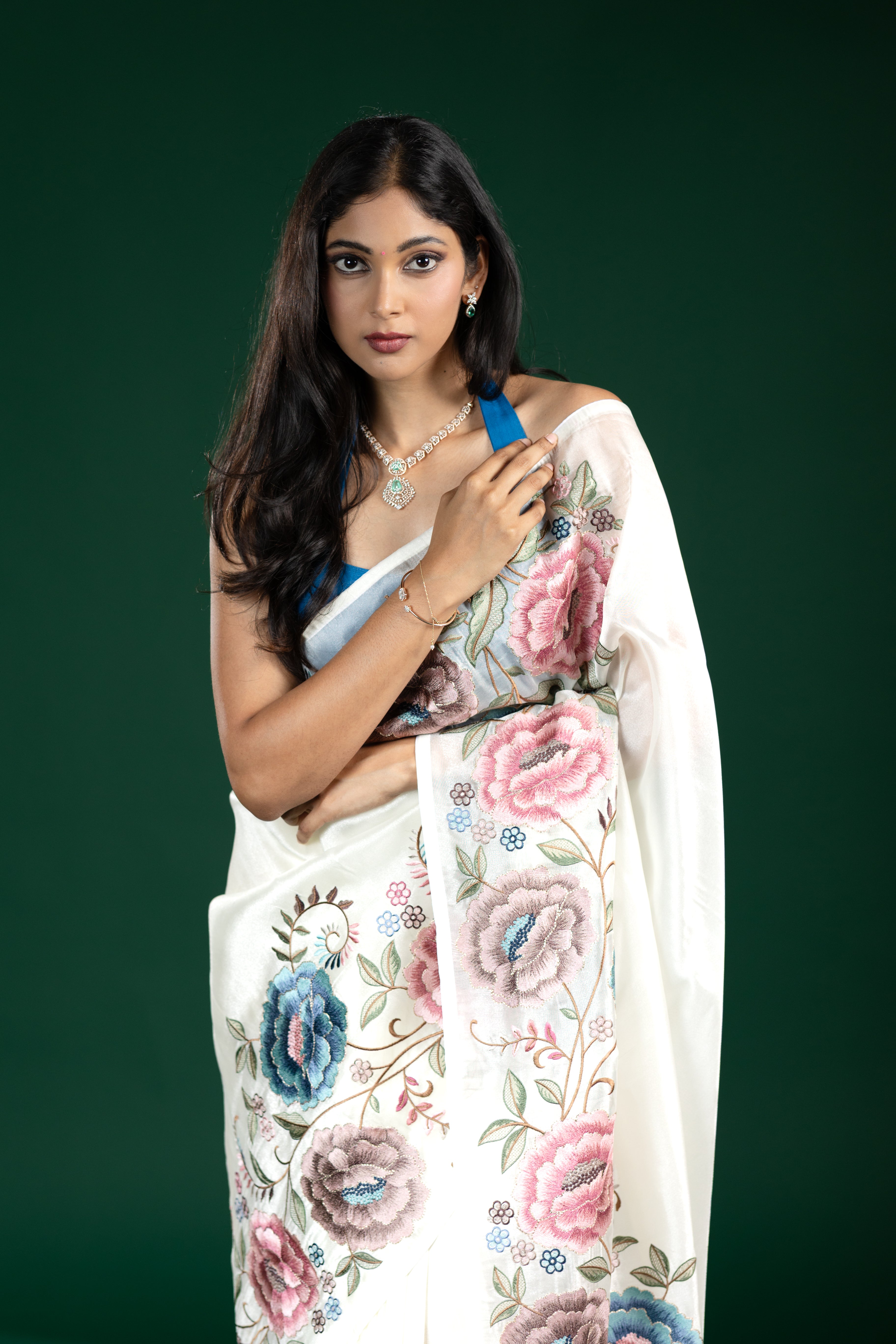 Elegant white soft tissue saree beautifully crafted with delicate thread embroidery and self-designed patterns. Perfect for graceful festive and formal occasions.